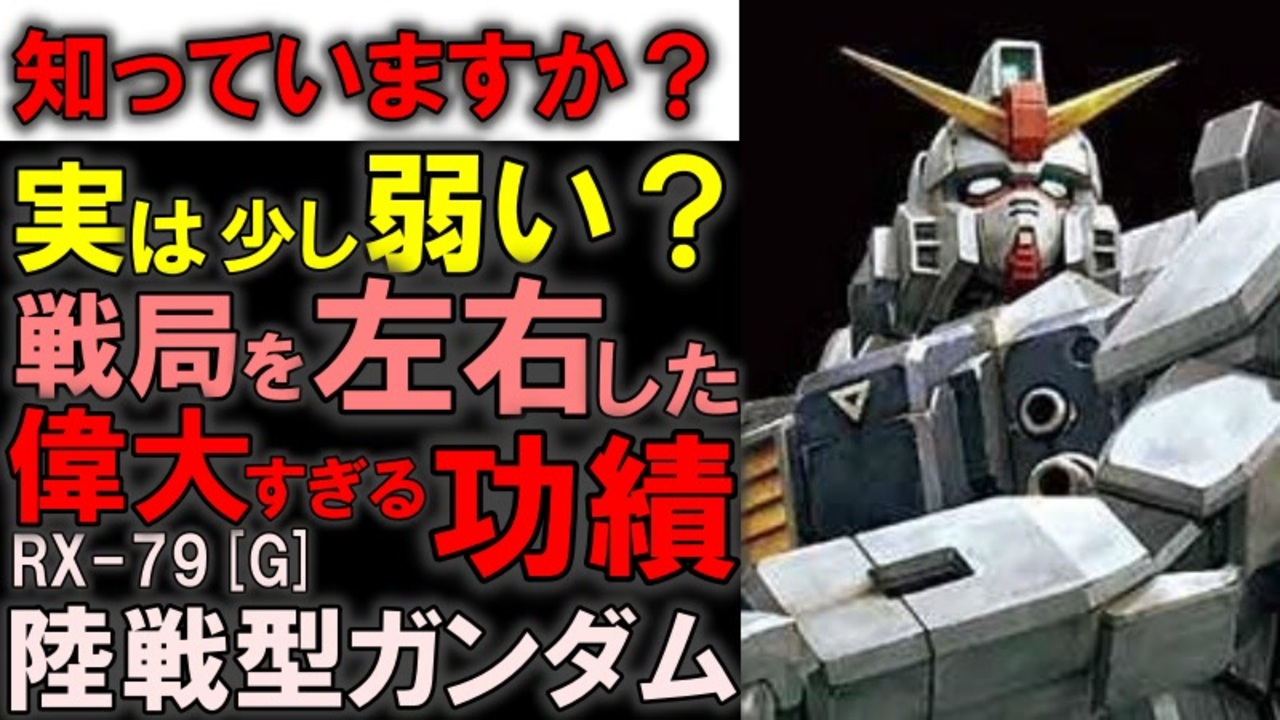 【地球を守り抜いた英雄】RX-79[G]陸戦型ガンダム。ガンダムなのに弱い?しかし連邦を勝利に導いた偉大な活躍と重要な役目を徹底解説【機動戦士ガンダム】<br><br>機動戦士ガンダム第08MS小隊に登場するMS、RX-79[G]陸戦型ガンダムの弱点と偉大な活躍を解説、考察する動画です。<br><br>今回は解説が多めです。<br><br>動画で触れた以前のゲルググ解説動画はこちら<br><a href="https://www.nicovideo.jp/watch/sm40321215" target="_blank" rel="noopener nofollow">https://www.nicovideo.jp/watch/sm40321215</a><br><br>ハサウェイ解説動画はこちら<br><a href="https://www.nicovideo.jp/watch/sm38953542" target="_blank" rel="noopener nofollow">https://www.nicovideo.jp/watch/sm38953542</a><br><br>陸戦型ガンダム、物凄い重要なポジションだと思いました。<br>1を10にしたのがガンダムとジムなら<br>その1を守り抜いたのがこの陸戦型ガンダムなのかなと<br>ジオンにも荒れた平地で全力疾走すると転ぶOSでGOサイン出す姿勢があれば<br>もっともっと質の悪い先行量産型陸戦ゲルググみたいなのが地球で頑張れたかも?<br><br>質問、などありましたらこちらにも<br><a href="https://twitter.com/@i4S0LHspdgzBTor" target="_blank" rel="noopener nofollow">https://twitter.com/@i4S0LHspdgzBTor</a><br><br>清見元康名義でたいあっぷ、小説家になろう、カクヨムなどに投稿しています。<br>もし良ければ応援お願いしますm(_ _)m<br><a href="https://tieupnovels.com/user/GariGari" target="_blank" rel="noopener nofollow">https://tieupnovels.com/user/GariGari</a><br><a href="https://mypage.syosetu.com/953815/" target="_blank" rel="noopener nofollow">https://mypage.syosetu.com/953815/</a><br><a href="https://kakuyomu.jp/users/GariD/works" target="_blank" rel="noopener nofollow">https://kakuyomu.jp/users/GariD/works</a><br><br>現在の最新作(短編コメディ):<br>何度繰り返してもギロチン送りにされる悪役令嬢は閃いた『敵対する者全員可愛いアイドルにしてしまおう!』アイドルギルドマスターに私はなる!<br><a href="https://ncode.syosetu.com/n2478hi/" target="_blank" rel="noopener nofollow">https://ncode.syosetu.com/n2478hi/</a><br><br>以前の作品(短編シリアス):<br>転生した厄災の大魔女はやがて聖女と呼ばれる<br><a href="https://ncode.syosetu.com/n0827ha/" target="_blank" rel="noopener nofollow">https://ncode.syosetu.com/n0827ha/</a><br><br>A.I.VOICE:結月ゆかり<br>VOICEVOX:ずんだもん<br><br>いつも広告、コメントありがとうございます。<br>励みになりますm(_ _)m<br>