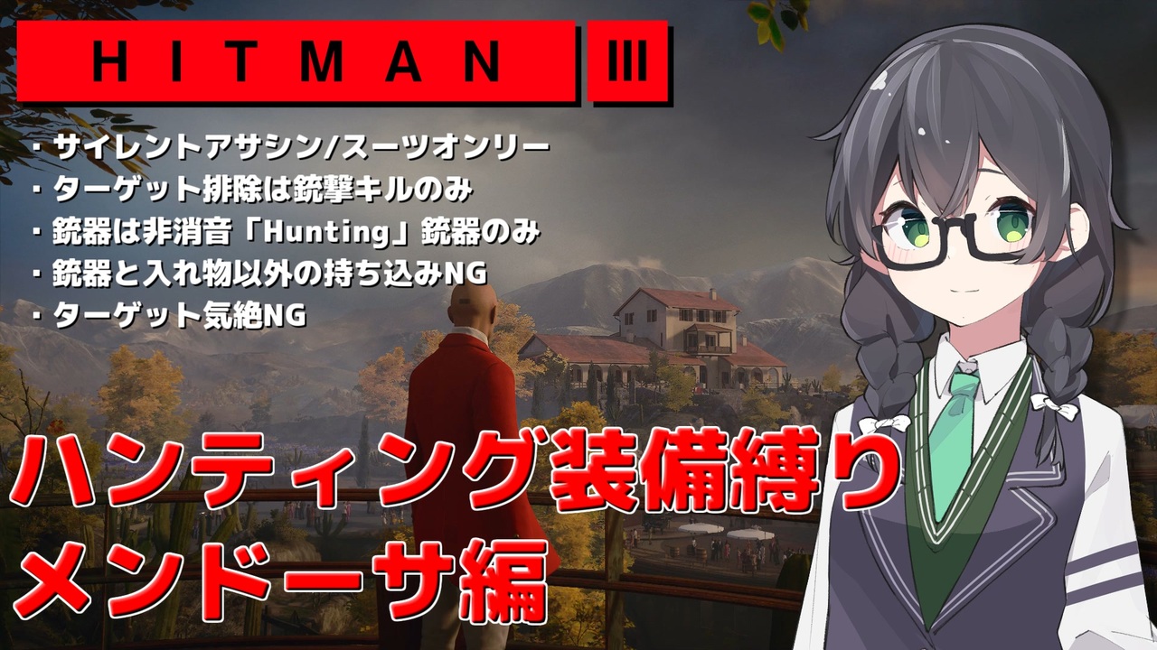 HITMAN3のメンドーサを独自レギュレーションのハンティング装備縛りでやっていきます。<br><br><span style="color: #ff0000;"><strong>※「殺人欲旺盛なあかりちゃん」シリーズとは別シリーズになります。<br> あちらのシリーズより先のステージをプレイするのでネタバレ要素を含みます。</strong></span><br><br>[縛り条件]<br>・サイレントアサシン/スーツオンリー<br>・服装は「フォーマルなハンティングスーツ」<br>・ターゲット排除は銃撃キルのみ<br>・銃器は非消音で「Hunting」が付く銃器のみ<br>・ターゲット気絶NG<br><br>前回:<a href="https://www.nicovideo.jp/watch/sm41712735" class="watch">sm41712735</a><br>次回:<a href="https://www.nicovideo.jp/watch/sm42210251" class="watch">sm42210251</a><br>マイリスト:<a href="https://www.nicovideo.jp/mylist/74464112" target="_blank" rel="noopener">mylist/74464112</a><br><br>暗殺(殺人欲旺盛なあかりちゃん)のマイリスト→<a href="https://www.nicovideo.jp/mylist/66084100" target="_blank" rel="noopener">mylist/66084100</a><br>宇宙人狼のマイリスト→<a href="https://www.nicovideo.jp/mylist/71387167" target="_blank" rel="noopener">mylist/71387167</a><br>蹴落とし合いのマイリスト→<a href="https://www.nicovideo.jp/mylist/69550955" target="_blank" rel="noopener">mylist/69550955</a><br>野球ゲームのマイリスト→<a href="https://www.nicovideo.jp/mylist/68820555" target="_blank" rel="noopener">mylist/68820555</a><br><br>youtube:<a href="https://www.youtube.com/@user-ji7qn4jg7j" target="_blank" rel="noopener nofollow">https://www.youtube.com/@user-ji7qn4jg7j</a><br>ツイッター:<a href="https://twitter.com/jiro2413" target="_blank" rel="noopener nofollow">https://twitter.com/jiro2413</a><br>