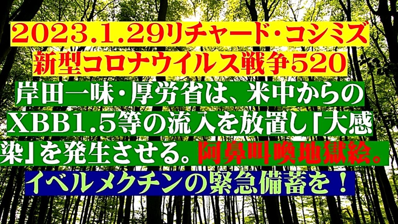 <span style="color: #cc4125;"><strong>「 テーマ : 新型コロナウイルス戦争 520 」</strong></span><br><br><span style="color: #ff0000;"><strong>「『 岸田文雄一味・厚生労働省 』は、『 米国・中国 』からの『 XBB1.5 』等の『 流入 』を『 放置 』し、<br> 『 大感染 』を『 発生 』させる。『 阿鼻叫喚地獄絵 』。『 イベルメクチン 』の『 緊急備蓄 』を! 」</strong></span><br><br><span style="color: #0000ff;"><strong>「『 イベルメクチン・アビガン・その他コロナ対策 』について、ご意見をお寄せ下さい! 」<br><br>◐ E-mail:richardkoshimizu@gmail.com</strong></span><br><br><strong>◐「クリエイターサポート」・「フォロー」・「ニコニ広告」等、是非ともご協力下さい。リチャード・コシミズ</strong><br><br><span style="color: #38761d;"><strong>◐ リチャード・コシミズ 講演会 公式 動画ギャラリー</strong></span><br> <a href="http://www.t-sskk.com/richardkoshimizu/video-gallery/index.html" target="_blank" rel="noopener nofollow">http://www.t-sskk.com/richardkoshimizu/video-gallery/index.html</a><br><br><span style="color: #38761d;"><strong>◐ リチャード・コシミズ 講演会 ニコニコ生放送 LIVE</strong></span><br> <a href="https://bit.ly/3Bx8F5w" target="_blank" rel="noopener nofollow">https://bit.ly/3Bx8F5w</a><br><br><span style="color: #38761d;"><strong>◐ リチャード・コシミズ 公式 ブログ</strong></span><br> <a href="http://08054623210.jugem.jp/" target="_blank" rel="noopener nofollow">http://08054623210.jugem.jp/</a><br><br><span style="color: #38761d;"><strong>◐ リチャード・コシミズ 公式 ホームページ<br> </strong></span><a href="http://richardkoshimizu.boo.jp/" target="_blank" rel="noopener nofollow">http://richardkoshimizu.boo.jp/</a><br><br><span style="color: #38761d;"><strong>◐ リチャード・コシミズ 公式 Twitter</strong></span><br> <a href="https://twitter.com/rickoshimizu" target="_blank" rel="noopener nofollow">https://twitter.com/rickoshimizu</a><br>
