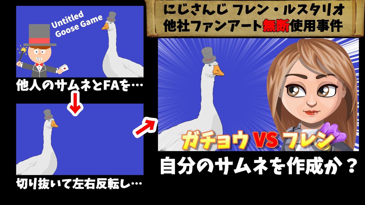 2023年1月27日に投稿した動画の続きです。<br>1月25日、にじさんじ所属のVTuberのフレン・E・ルスタリオがホロスターズのファンアートを自身のサムネイルに無断で使用しコメントで指摘され差し替えるという事件があったのですが・・・<br><br>前回の動画<br><a href="https://www.nicovideo.jp/watch/sm41707589" class="watch">sm41707589</a><br><br>↓フレンが削除したツイート跡地<br><a href="https://twitter.com/furen_2434/status/1618220549687345158" target="_blank" rel="noopener nofollow">https://twitter.com/furen_2434/status/1618220549687345158</a><br><br>バイオリンの酷似参考画像はこちら<br><a href="https://twitter.com/V_Virgin_Mary/status/1612098195181670400" target="_blank" rel="noopener nofollow">https://twitter.com/V_Virgin_Mary/status/1612098195181670400</a><br><br>参考<br>エレクトリックバイオリン YEVシリーズ<br><a href="https://www.yamaha.com/ja/news_release/2017/17031301/" target="_blank" rel="noopener nofollow">https://www.yamaha.com/ja/news_release/2017/17031301/</a><br><br>【VOLTACTION Half Anniversary】バイオリン風ネックレス(セラフ・ダズルガーデンモデル) <br><a href="https://shop.nijisanji.jp/s/niji/item/detail/SSZS-20537?ima=2801" target="_blank" rel="noopener nofollow">https://shop.nijisanji.jp/s/niji/item/detail/SSZS-20537?ima=2801</a><br><br>Youtube <a href="https://www.youtube.com/@V_Virgin_Mary" target="_blank" rel="noopener nofollow">https://www.youtube.com/@V_Virgin_Mary</a><br>twitter <a href="https://twitter.com/V_Virgin_Mary" target="_blank" rel="noopener nofollow">https://twitter.com/V_Virgin_Mary</a><br><br>引用<br>【Untitled Goose Game】目的のためなら手段を選ばない【にじさんじ】<br><a href="https://youtube.com/watch?v=HRNc8O1nkqY&si=EnSIkaIECMiOmarE" target="_blank" rel="noopener nofollow">https://youtube.com/watch?v=HRNc8O1nkqY&si=EnSIkaIECMiOmarE</a><br><br>使用素材<br>高品質なフリー動画素材 - Pixabay <a href="https://pixabay.com/ja/videos" target="_blank" rel="noopener nofollow">https://pixabay.com/ja/videos</a>