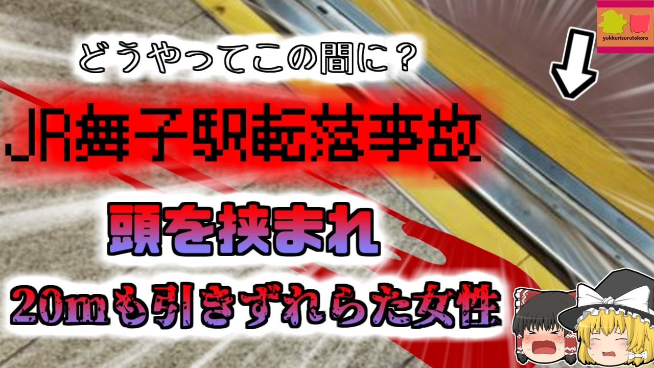 <a href="#" class="seekTime" data-seekTime="00:00" onclick="seekNicoPlayer('#00:00'); return false;">#00:00</a> 冒頭挨拶<br><a href="#" class="seekTime" data-seekTime="00:29" onclick="seekNicoPlayer('#00:29'); return false;">#00:29</a> 視聴上の注意<br><a href="#" class="seekTime" data-seekTime="1:00" onclick="seekNicoPlayer('#1:00'); return false;">#1:00</a> 舞子駅<br><a href="#" class="seekTime" data-seekTime="1:41" onclick="seekNicoPlayer('#1:41'); return false;">#1:41</a> 発車後の異変<br><a href="#" class="seekTime" data-seekTime="2:26" onclick="seekNicoPlayer('#2:26'); return false;">#2:26</a> 線路に転落していた女性<br><a href="#" class="seekTime" data-seekTime="3:31" onclick="seekNicoPlayer('#3:31'); return false;">#3:31</a> 当時の状況<br><a href="#" class="seekTime" data-seekTime="5:03" onclick="seekNicoPlayer('#5:03'); return false;">#5:03</a> Aさんは酩酊状態だった<br><a href="#" class="seekTime" data-seekTime="5:22" onclick="seekNicoPlayer('#5:22'); return false;">#5:22</a> 連結部の隙間に転落<br><a href="#" class="seekTime" data-seekTime="7:16" onclick="seekNicoPlayer('#7:16'); return false;">#7:16</a> なぜ車掌はすぐに気が付かなかったのか?<br><a href="#" class="seekTime" data-seekTime="7:38" onclick="seekNicoPlayer('#7:38'); return false;">#7:38</a> ブザーの位置とタイムラグ<br><a href="#" class="seekTime" data-seekTime="9:13" onclick="seekNicoPlayer('#9:13'); return false;">#9:13</a> Bさんと新聞を振っていた男性<br><a href="#" class="seekTime" data-seekTime="9:41" onclick="seekNicoPlayer('#9:41'); return false;">#9:41</a> 明暗の差が激しかった<br><a href="#" class="seekTime" data-seekTime="11:31" onclick="seekNicoPlayer('#11:31'); return false;">#11:31</a> 停車時を想定されていなかったブザー<br><a href="#" class="seekTime" data-seekTime="13:24" onclick="seekNicoPlayer('#13:24'); return false;">#13:24</a> その後の対策の数々<br><br><br>今回紹介するのは、以前から多くのリクエストがありました、「舞子駅転落事故」です。<br>兵庫県神戸市内にある、JR舞子駅でこの日、恐ろしい事故が発生しました。<br>それは、女性がホームと列車の間に転落し、その状態で列車が発車してしまい、頭部を挟んだまま、約20メートルも引きずられ、亡くなったという事故でした。<br>(文字数制限のため省略)<br><br>引用・出展・参考文献<br>舞子駅|駅情報 - JRおでかけネット<br><a href="https://ishort.ink/VDhH" target="_blank" rel="noopener nofollow">https://ishort.ink/VDhH</a><br>Wikipedia 転落防止幌<br><a href="https://ishort.ink/c2DV" target="_blank" rel="noopener nofollow">https://ishort.ink/c2DV</a><br>J-stege 人間工学<br>プラットホームからの転落や列車接触に至る酔客の行動特性<br><a href="https://ishort.ink/QtGg" target="_blank" rel="noopener nofollow">https://ishort.ink/QtGg</a><br>e-GOV 法令検索 <br>移動等円滑化のために必要な旅客施設又は車両等の構造及び設備並びに旅客施設及び車両等を使用した役務の提供の方法に関する基準を定める省令<br><a href="https://ishort.ink/o3ba" target="_blank" rel="noopener nofollow">https://ishort.ink/o3ba</a><br>国土交通省 鉄道に関する技術上の基準を定める省令の解釈基準<br><a href="https://ishort.ink/iGvZ" target="_blank" rel="noopener nofollow">https://ishort.ink/iGvZ</a><br>JREEA 日本鉄道電気技術協会 <br>運輸安全委員会事故調査報告書【H24年1月27日公表】<br><a href="https://ishort.ink/n7xd" target="_blank" rel="noopener nofollow">https://ishort.ink/n7xd</a><br>その他視聴者提供資料など<br />※この動画は過去の事件を知り、現在でも同じことが発生する危険性を再認識、関与しないように促すための動画であり、視聴者を扇動、動揺を誘うためのコンテンツではありません。<br><br>ご要望にお応えして、メンバーシップの開設を行いました。<br>下記URLからも登録可能ですので、ご興味がある方は是非ご参加ください。<br><a href="https://www.youtube.com/channel/UCcT5a1J7XJW7CLYI2RKl4pw/join" target="_blank" rel="noopener nofollow">https://www.youtube.com/channel/UCcT5a1J7XJW7CLYI2RKl4pw/join</a><br><br><br>Twitter<br>→<a href="https://twitter.com/yukkurisurutoko" target="_blank" rel="noopener nofollow">https://twitter.com/yukkurisurutoko</a><br><br>取り急ぎ、簡易的にですがマイリストを作りました。<br>【ゆっくり解説】事故・事件関係紹介リスト <br><a href="https://www.nicovideo.jp/mylist/71034319" target="_blank" rel="noopener nofollow">https://www.nicovideo.jp/mylist/71034319</a><br>【ゆっくり解説】放射線系事故<br><a href="https://www.nicovideo.jp/mylist/71034368" target="_blank" rel="noopener nofollow">https://www.nicovideo.jp/mylist/71034368</a><br>【ゆっくり解説】鉄道系事故・事件関連<br><a href="https://www.nicovideo.jp/mylist/71034379" target="_blank" rel="noopener nofollow">https://www.nicovideo.jp/mylist/71034379</a>