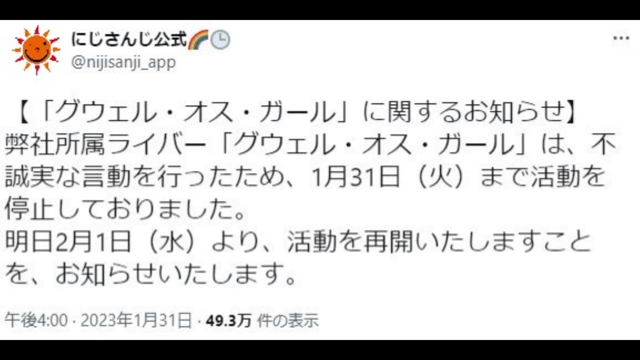 2023年1月31日午後4時、にじさんじ公式ツイッターより2022年12月22日より活動休止していたグウェル・オス・ガールさんが2月1日より活動再開すると発表がありました。<br>休止期間は41日でローレンさんの49日より少し短く夢追さんの29日よりも長い期間でした。<br><br>休止日数比較動画<br>にじさんじ&ホロライブ&SMAP活動休止日数ランキング <a href="https://www.nicovideo.jp/watch/sm40373430" class="watch">sm40373430</a><br><br>引用<br><a href="https://twitter.com/pripro_/status/1564377626613264384" target="_blank" rel="noopener nofollow">https://twitter.com/pripro_/status/1564377626613264384</a><br><br>Youtube <a href="https://www.youtube.com/@V_Virgin_Mary" target="_blank" rel="noopener nofollow">https://www.youtube.com/@V_Virgin_Mary</a><br>twitter <a href="https://twitter.com/V_Virgin_Mary" target="_blank" rel="noopener nofollow">https://twitter.com/V_Virgin_Mary</a><br><br>使用素材<br>高品質なフリー動画素材 - Pixabay <a href="https://pixabay.com/ja/videos" target="_blank" rel="noopener nofollow">https://pixabay.com/ja/videos</a>