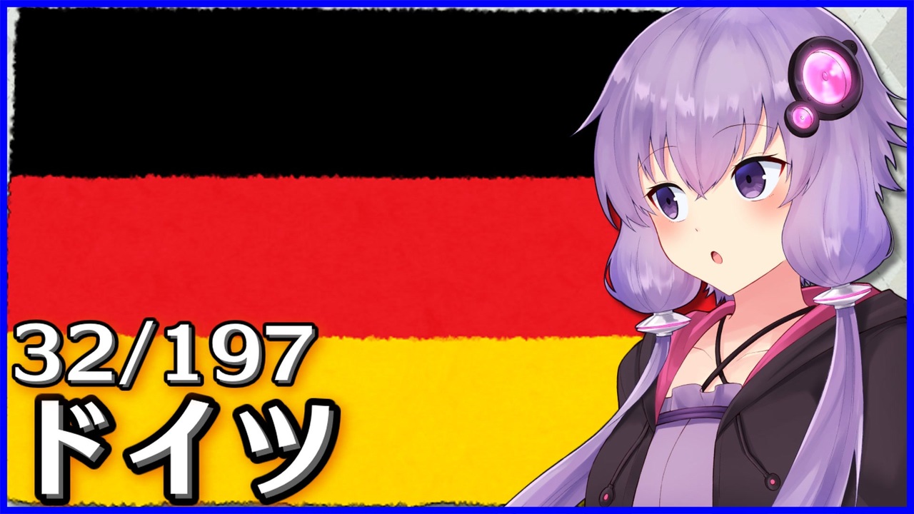 どいちゅらん<br><br>前:<a href="https://www.nicovideo.jp/watch/sm41699506" class="watch">sm41699506</a> (フェロー諸島)<br>次:<a href="https://www.nicovideo.jp/watch/sm41746056" class="watch">sm41746056</a> (トルクメニスタン)<br>マイリスト:<a href="https://www.nicovideo.jp/mylist/73789037" target="_blank" rel="noopener">mylist/73789037</a><br><br><span style="font-size: 16px;"><strong>シリーズのガイダンスはこちら!<br><a href="https://www.nicovideo.jp/watch/sm41157779" class="watch">sm41157779</a> (ガイダンス)</strong></span><br><br>使わせていただいているもの(敬称略)<br>結月ゆかりの立ち絵(オリジナル)/イツミ(@itsumimita)<br>紲星あかりの立ち絵(オリジナル)/イツミ(@itsumimita)<br>リビング背景(オリジナル)/瓜綱(@_Uritsuna_)<br>BGM:Breaktime/FUJINEQo(@FUJINEQo)<br><br>Youtube版:<a href="https://youtu.be/pFB7U5OWd5w" target="_blank" rel="noopener nofollow">https://youtu.be/pFB7U5OWd5w</a><br>Twitter:<a href="https://twitter.com/Yuharumuri" target="_blank" rel="noopener nofollow">https://twitter.com/Yuharumuri</a><br><br>[2023/2/5]<br>ドイツの人口を欧州1位としていますが、欧州にロシアを含めた場合欧州2位となります。<br><br><a target="_blank" href="https://qa.nicovideo.jp/faq/show/19424?site_domain=default" style="font-size: 13px;color: #657586; text-decoration: underline; line-height: 1.4">この動画は投稿者によって修正されました</a>
