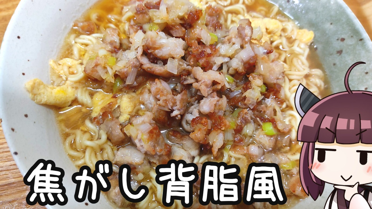 ささら「翌日になっても部屋の匂いがいい香りでしたー」<br><br>youtube(登録してくれると嬉しいです)<br><a href="https://youtu.be/LHQunotZ19k" target="_blank" rel="noopener nofollow">https://youtu.be/LHQunotZ19k</a><br><br><a href="https://twitter.com/gyuusha3" target="_blank" rel="noopener nofollow">https://twitter.com/gyuusha3</a><br><br>材料:<br>◯豚バラ…今回は300g<br>◯長ネギ…半本<br>◯インスタントラーメン…1袋<br>◯卵…1個(あれば)<br><br>調味料<br>◯塩…適量<br>◯味のもと…適量(今回3振り程)<br>◯ごま油<br>-----------------------<br><br>調理方法:<br>ネギを縦線入れてみじん切りに<br>豚バラもみじん切りに<br>ゴマ油入れてやや強火で豚バラを好みに焦がして<br>ネギも炒める<br>一度皿に置いて同じ器具でラーメンを作る<br>(卵あるならスープを先入れて溶き卵を入れて作ってその後麺)<br>拉麺の上に焦がし豚バラ乗せて完成<br><br>-----------------------<br>ほへぇーポイント:<br>①ネギの線を入れるとき端っこ残しておくと楽だよ<br>②脂はきりずらいけどしっかり切るのがポイント<br>③最初中~強火で途中から弱火~中でこんな感じ<br>④丼in後の最後にごま油をちょい垂らすと良き良き<br><br><br><br><strong>▼ささきり飯</strong><br>蒲焼きさん太郎丼 <a href="https://www.nicovideo.jp/watch/sm40825928" class="watch">sm40825928</a><br>Theスパイス麻婆カレー <a href="https://www.nicovideo.jp/watch/sm40886653" class="watch">sm40886653</a><br>鰯魚飯 <a href="https://www.nicovideo.jp/watch/sm40959212" class="watch">sm40959212</a><br>ネギ塩ニンニク∞無限砂肝 <a href="https://www.nicovideo.jp/watch/sm41108368" class="watch">sm41108368</a><br>マック風チキンナゲット <a href="https://www.nicovideo.jp/watch/sm41663552" class="watch">sm41663552</a><br>マグ漬けタク丼 <a href="https://www.nicovideo.jp/watch/sm41700079" class="watch">sm41700079</a><br>焦がし背脂風ラーメン <a href="https://www.nicovideo.jp/watch/sm41732850" class="watch">sm41732850</a><br><br>編集→ YMM4、CeVIO さとうささら、すずきつづみ、東北きりたん<br>CoeFont <a href="https://coefont.studio/" target="_blank" rel="noopener nofollow">https://coefont.studio/</a> voicevox:ずんだもん、春日部つむぎ<br>音楽:OtoLogic、効果音ラボ<br>立ち絵:Noname さん と 新島秋一 さん<br>ます。