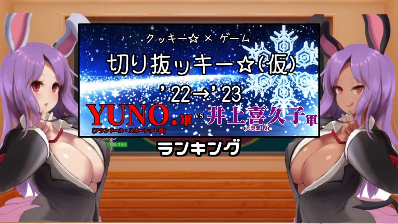 合作「クッキー☆×ゲーム 切り抜ッキー☆ '22→'23 YUNO.軍vs井上喜久子軍」<br><br>今伸び悩んでいて一歩上を目指したい投稿者を集め動画を作成し切磋琢磨してもらう為に企画(主催者は実験台)<br>~ルール~<br>①.参加者は(転生前の認識度の有無で差が付くのを防ぐため)新規アカウントを作成<br>②.主催者のツイッター( <a href="https://twitter.com/gominato_mumei" target="_blank" rel="noopener nofollow">https://twitter.com/gominato_mumei</a> ),もしくはYoutubeチャンネル( <a href="https://bit.ly/2VkH4PV" target="_blank" rel="noopener nofollow">https://bit.ly/2VkH4PV</a> )内の動画,アーカイブを使用,編集<br>③.ニコニコ動画で設定されている「話題のタグ」をタグロックしてなるべく各タグの上位を取る事(動画内に要素がないのにタグロックするのは×)<br> 各タグ最高順位によって得点<br>(1位:5pt 2位:4pt 3位:3pt 4位:2pt 5位:1pt)<br> 最終的に獲得ポイントが一番高い投稿者が優勝<br>④.出来る限り視聴者を楽しませること<br><br>▼その他細かなルール<br>・「もっと評価されるべき」静画をサムネに使用しコンテンツツリーに登録すること<br>・動画の被りを防ぐため「使用するシーン」を参加者同士で共有すること<br>・動画投稿する際に「使用した箇所」と「投稿するアカウント」を主催者のDM(<a href="https://twitter.com/gominato_mumei" target="_blank" rel="noopener nofollow">https://twitter.com/gominato_mumei</a> )に報告<br><br>合作管理:ゴMNT兄貴<br>N:<a href="https://www.nicovideo.jp/user/25799312" target="_blank" rel="noopener">user/25799312</a><br>Y:<a href="https://bit.ly/2VkH4PV" target="_blank" rel="noopener nofollow">https://bit.ly/2VkH4PV</a><br>告知:<a href="https://profile.ameba.jp/ameba/gominato-nico/" target="_blank" rel="noopener nofollow">https://profile.ameba.jp/ameba/gominato-nico/</a><br>連絡用:<a href="https://twitter.com/gominato_mumei" target="_blank" rel="noopener nofollow">https://twitter.com/gominato_mumei</a>