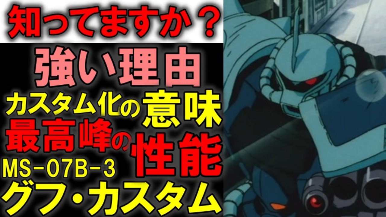 【グフの正当進化】MS-07B-3グフ・カスタム。強い理由、カスタム化された理由を徹底解説【機動戦士ガンダム】<br><br>機動戦士ガンダム第08MS小隊に登場するMS、MS-07B-3グフ・カスタムの強さと弱点、なぜカスタム化されたのかなどを解説、考察する動画です。<br><br>今回は解説が多めです。<br><br>※<br>総合整備計画✕<br>統合整備計画○<br>割と確認が雑なのがバレてしまいました。<br>大変失礼しました。<br><br>動画で触れた以前のグフ解説動画はこちら<br>【グフ解説】MS-07B、グフの本当の役割。見事な設計思想と先進性を徹底解説【機動戦士ガンダム】<br><a href="https://www.nicovideo.jp/watch/sm40392617" target="_blank" rel="noopener nofollow">https://www.nicovideo.jp/watch/sm40392617</a><br><br>グフがヒート・サーベルごとジムのビーム・サーベルに斬られるのは酷いと思いました。<br>そりゃ勝てませんわ・・・。<br>というか近距離向けのビームスプレーガンへの対策がドム以外できてない状況がもう・・・。<br><br>質問、などありましたらこちらにも<br><a href="https://twitter.com/@i4S0LHspdgzBTor" target="_blank" rel="noopener nofollow">https://twitter.com/@i4S0LHspdgzBTor</a><br><br>清見元康名義でたいあっぷ、小説家になろう、カクヨムなどに投稿しています。<br>もし良ければ応援お願いしますm(_ _)m<br><a href="https://tieupnovels.com/user/GariGari" target="_blank" rel="noopener nofollow">https://tieupnovels.com/user/GariGari</a><br><a href="https://mypage.syosetu.com/953815/" target="_blank" rel="noopener nofollow">https://mypage.syosetu.com/953815/</a><br><a href="https://kakuyomu.jp/users/GariD/works" target="_blank" rel="noopener nofollow">https://kakuyomu.jp/users/GariD/works</a><br><br>現在の最新作(短編コメディ):<br>何度繰り返してもギロチン送りにされる悪役令嬢は閃いた『敵対する者全員可愛いアイドルにしてしまおう!』アイドルギルドマスターに私はなる!<br><a href="https://ncode.syosetu.com/n2478hi/" target="_blank" rel="noopener nofollow">https://ncode.syosetu.com/n2478hi/</a><br><br>以前の作品(短編シリアス):<br>転生した厄災の大魔女はやがて聖女と呼ばれる<br><a href="https://ncode.syosetu.com/n0827ha/" target="_blank" rel="noopener nofollow">https://ncode.syosetu.com/n0827ha/</a><br><br>A.I.VOICE:結月ゆかり<br>VOICEVOX:ずんだもん<br><br>いつも広告、コメントありがとうございます。<br>励みになりますm(_ _)m<br>