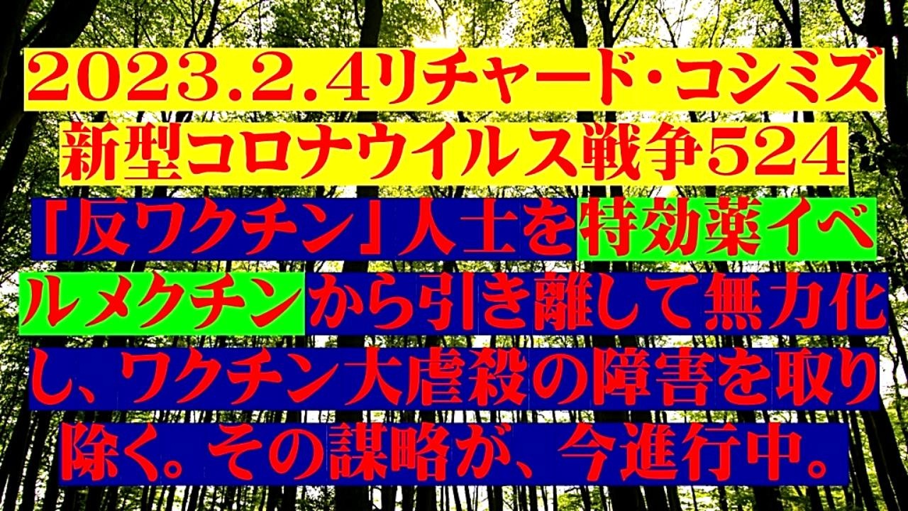 <span style="color: #cc4125;"><strong>「 テーマ : 新型コロナウイルス戦争 524 」</strong></span><br><br><span style="color: #ff0000;"><strong>「『 反ワクチン 』人士を『 特効薬 イベルメクチン 』から引き離して『 無力化 』し、『 ワクチン大虐殺 』<br> の『 障害 』を『 取り除く 』。その『 謀略 』が、『 今進行中! 』」</strong></span><br><br><span style="color: #0000ff;"><strong>「『 イベルメクチン・アビガン・その他コロナ対策 』について、ご意見をお寄せ下さい! 」<br><br>◐ E-mail:richardkoshimizu@gmail.com</strong></span><br><br><strong>◐「クリエイターサポート」・「フォロー」・「ニコニ広告」等、是非ともご協力下さい。リチャード・コシミズ</strong><br><br><span style="color: #38761d;"><strong>◐ リチャード・コシミズ 講演会 公式 動画ギャラリー</strong></span><br> <a href="http://www.t-sskk.com/richardkoshimizu/video-gallery/index.html" target="_blank" rel="noopener nofollow">http://www.t-sskk.com/richardkoshimizu/video-gallery/index.html</a><br><br><span style="color: #38761d;"><strong>◐ リチャード・コシミズ 講演会 ニコニコ生放送 LIVE</strong></span><br> <a href="https://bit.ly/3Bx8F5w" target="_blank" rel="noopener nofollow">https://bit.ly/3Bx8F5w</a><br><br><span style="color: #38761d;"><strong>◐ リチャード・コシミズ 公式 ブログ</strong></span><br> <a href="http://08054623210.jugem.jp/" target="_blank" rel="noopener nofollow">http://08054623210.jugem.jp/</a><br><br><span style="color: #38761d;"><strong>◐ リチャード・コシミズ 公式 ホームページ<br> </strong></span><a href="http://richardkoshimizu.boo.jp/" target="_blank" rel="noopener nofollow">http://richardkoshimizu.boo.jp/</a><br><br><span style="color: #38761d;"><strong>◐ リチャード・コシミズ 公式 Twitter</strong></span><br> <a href="https://twitter.com/rickoshimizu" target="_blank" rel="noopener nofollow">https://twitter.com/rickoshimizu</a><br>