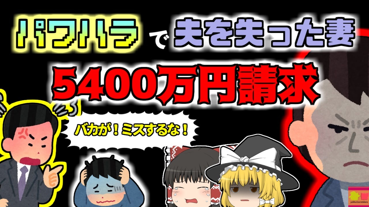 <a href="#" class="seekTime" data-seekTime="00:00" onclick="seekNicoPlayer('#00:00'); return false;">#00:00</a> 冒頭挨拶<br><a href="#" class="seekTime" data-seekTime="00:48" onclick="seekNicoPlayer('#00:48'); return false;">#00:48</a> 視聴上の注意<br><a href="#" class="seekTime" data-seekTime="1:43" onclick="seekNicoPlayer('#1:43'); return false;">#1:43</a> 琺瑯加工工場<br><a href="#" class="seekTime" data-seekTime="2:45" onclick="seekNicoPlayer('#2:45'); return false;">#2:45</a> 派遣社員の「Aさん」<br><a href="#" class="seekTime" data-seekTime="3:07" onclick="seekNicoPlayer('#3:07'); return false;">#3:07</a> 上司の「Bさん」<br><a href="#" class="seekTime" data-seekTime="3:28" onclick="seekNicoPlayer('#3:28'); return false;">#3:28</a> 怖いワンマン社長<br><a href="#" class="seekTime" data-seekTime="4:18" onclick="seekNicoPlayer('#4:18'); return false;">#4:18</a> 機会を壊してしまったAさん<br><a href="#" class="seekTime" data-seekTime="4:48" onclick="seekNicoPlayer('#4:48'); return false;">#4:48</a> 長いパワハラに耐えかね・・・<br><a href="#" class="seekTime" data-seekTime="5:31" onclick="seekNicoPlayer('#5:31'); return false;">#5:31</a> 発見された退職届<br><a href="#" class="seekTime" data-seekTime="6:24" onclick="seekNicoPlayer('#6:24'); return false;">#6:24</a> 妻は会社を訴訟<br><a href="#" class="seekTime" data-seekTime="8:13" onclick="seekNicoPlayer('#8:13'); return false;">#8:13</a> 約5400万円の賠償判決<br><a href="#" class="seekTime" data-seekTime="9:03" onclick="seekNicoPlayer('#9:03'); return false;">#9:03</a> 数多くのパワハラ事例の影響<br><a href="#" class="seekTime" data-seekTime="9:54" onclick="seekNicoPlayer('#9:54'); return false;">#9:54</a> パワハラ防止法<br><a href="#" class="seekTime" data-seekTime="11:24" onclick="seekNicoPlayer('#11:24'); return false;">#11:24</a> もしパワハラを受けてしまったら<br><br><br>今回紹介するのは、以前リクエストをもらっていた、「パワハラ」に関する事例です。<br>愛知県にある、ほうろう加工業者の事業所で働く派遣社員の男性「Aさん」が、上司のパワハラによって、自〇に追い込まれるという事件が起きていました。<br>彼は業務中にミスをする度に、社長である上司に暴言や暴行を受け、その重圧やストレスからくる心労に耐え兼ね、家族を残して自らの命を絶ってしまいました。<br>その後、妻はパワハラをした上司に対し、損害賠償請求を行いました。<br>その裁判では、上司のパワハラや暴言、暴行の数々が元同僚の証言などによって認定され、労災認定も行われたため、彼に対し、遺族に5400万円の支払い命令が下しました。<br>当時はこういったパワハラ行為による事件や事故が相次いでおあり、政府の相談機関には、毎年何万件もの相談が寄せられ、それは毎年件数が増えていき、2022の時点で、8600件にまで膨らんでいきました。<br>これらの事件の影響は大きく、後にパワハラを明確に定義し、その防止に努めることを義務化する「パワハラ防止法」を施行する<br>ことにもなっていきました。<br><br>引用・出展・参考文献<br>厚生労働省 「令和3年度個別労働紛争解決制度の施行状況」<br><a href="https://ishort.ink/n4Yd" target="_blank" rel="noopener nofollow">https://ishort.ink/n4Yd</a><br>厚生労働省「事業主が職場における優越的な関係を背景とした言動に起因する問題に関して雇用管理上講ずべき措置等についての指針(令和2年厚生労働省告示第5号)」<br><a href="https://ishort.ink/ey4j" target="_blank" rel="noopener nofollow">https://ishort.ink/ey4j</a><br>NPO 働き方ASU-NET<br><a href="https://ishort.ink/5z4G" target="_blank" rel="noopener nofollow">https://ishort.ink/5z4G</a><br>明るい職場応援団「ハラスメントにあったらどうする?」 厚生労働省<br><a href="https://ishort.ink/C7EJ" target="_blank" rel="noopener nofollow">https://ishort.ink/C7EJ</a><br>その他視聴者提供資料など<br />※この動画は過去の事件を知り、現在でも同じことが発生する危険性を再認識、関与しないように促すための動画であり、視聴者を扇動、動揺を誘うためのコンテンツではありません。<br><br>ご要望にお応えして、メンバーシップの開設を行いました。<br>下記URLからも登録可能ですので、ご興味がある方は是非ご参加ください。<br><a href="https://www.youtube.com/channel/UCcT5a1J7XJW7CLYI2RKl4pw/join" target="_blank" rel="noopener nofollow">https://www.youtube.com/channel/UCcT5a1J7XJW7CLYI2RKl4pw/join</a><br><br><br>Twitter<br>→<a href="https://twitter.com/yukkurisurutoko" target="_blank" rel="noopener nofollow">https://twitter.com/yukkurisurutoko</a><br><br>取り急ぎ、簡易的にですがマイリストを作りました。<br>【ゆっくり解説】事故・事件関係紹介リスト <br><a href="https://www.nicovideo.jp/mylist/71034319" target="_blank" rel="noopener nofollow">https://www.nicovideo.jp/mylist/71034319</a><br>【ゆっくり解説】放射線系事故<br><a href="https://www.nicovideo.jp/mylist/71034368" target="_blank" rel="noopener nofollow">https://www.nicovideo.jp/mylist/71034368</a><br>【ゆっくり解説】鉄道系事故・事件関連<br><a href="https://www.nicovideo.jp/mylist/71034379" target="_blank" rel="noopener nofollow">https://www.nicovideo.jp/mylist/71034379</a>
