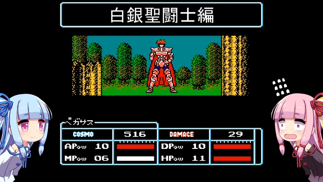 FCソフト、聖闘士星矢黄金伝説をプレイしました。<br><br>白銀聖闘士編です。<br>通常は、ここでCOSMO稼ぎをしますが…。<br><br>お借りした素材<br>blueberry様 <a href="https://seiga.nicovideo.jp/seiga/im6561508" target="_blank" rel="noopener">im6561508</a> <a href="https://seiga.nicovideo.jp/seiga/im5700590" target="_blank" rel="noopener">im5700590</a><br>ざっくざく様 <a href="https://commons.nicovideo.jp/works/nc283202" target="_blank" rel="noopener">nc283202</a><br>ドラゴンナイトのスー♪様 <a href="https://commons.nicovideo.jp/works/nc255285" target="_blank" rel="noopener">nc255285</a><br>青鳥様 <a href="https://commons.nicovideo.jp/works/nc186888" target="_blank" rel="noopener">nc186888</a><br><br>琴葉姉妹Part1マイリスト⇒<a href="https://www.nicovideo.jp/mylist/74721174" target="_blank" rel="noopener">mylist/74721174</a>