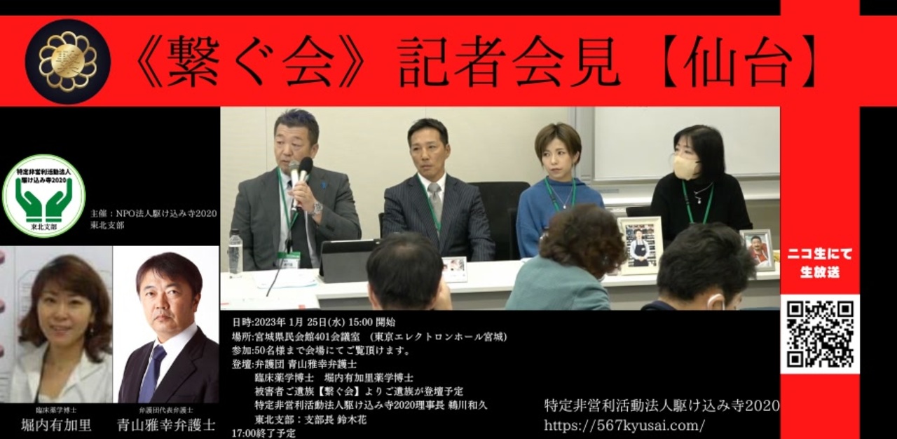 2022年10月20日に発足致しましたワクチン被害者遺族【繋ぐ会】より、宮城県仙台市にて記者会見を行いました。<br>会見では当会代表弁護士の青山弁護士と堀内薬学博士から活動報告などを行い、繋ぐ会より3名の遺族が登壇致しました。<br><br>多くの方に直接ご遺族の皆様の声を聞いて頂き、ご遺族の救済へご協力を賜りたく存じます。<br><br>【登壇者】<br><br>『青山雅幸 弁護士』<br>弁護団主任弁護士<br> 弁護士に要求される能力は色々あります。そのなかでも重要なものは、知識や情報を吸収して自分の中でかみ砕き、わかりやすく再提示する、という能力です。<br>私が特に得意とするのは、医療過誤や技術系の事件、交通事故などですが、これらはいずれも法的知識だけでは解決できません。このような事件では、他分野の知識・知見を理解し、それを裁判所にも理解してもらうことが必須となってきます。<br><br> また、医療等の専門事件に関しては、専門知識を吸収することに貪欲でなければならず、不断の努力も必要となってきます。<br>こういった事件は、大変でもありますがまたやりがいも多くあります。社会的に「今後の課題」とされているような事件(MTBIによる高次脳機能障害など)などその最たるものですが、これからも、こういった困難な事件にチャレンジし、ひとりでも多くの方に適切な解決を提供したいと考えております。<br><br>弁護士法人 ライトハウス法律事務所<br><br>『堀内有加里 臨床薬学博士』<br>薬学博士(臨床薬学)<br>【専門分野】<br>薬剤疫学/医薬品安全性監視 医薬品情報学<br>【経歴】<br>北海道出身<br>1998年 東京理科大学薬学部製薬学科卒<br>2000年 東京理科大学大学院薬学研究科 修士課程修了<br>2003年 千葉大学大学院薬学研究科 博士課程修了<br><br>【職歴】<br>2003~2018年<br>・東京大学大学院医学系研究科 薬剤疫学講座 研究員/教務補佐員(2017年まで)<br>・東京大学大学院医学系研究科 生物統計情報学講座 研究員(2017~2018年まで)<br>・NPO日本医薬品安全性研究ユニット プロジェクトマネージャー<br><br>2016年~<br>・一般社団法人 ヘルスケア・データサイエンス研究所 倫理審査委員<br><br>『鵜川和久』<br>株式会社YUBIX 代表取締役社長<br>特定非営利活動法人駆け込み寺2020 理事長<br>企業オーナー有志の会 代表<br>波動伝統医療協会 理事長<br>ワクチン被害者遺族「繋ぐ会」 世話役<br><br><br>主催<br>特定非営利活動法人駆け込み寺2020東北支部<br>代表:鵜川和久<br><a href="https://567kyusai.com/" target="_blank" rel="noopener nofollow">https://567kyusai.com/</a>