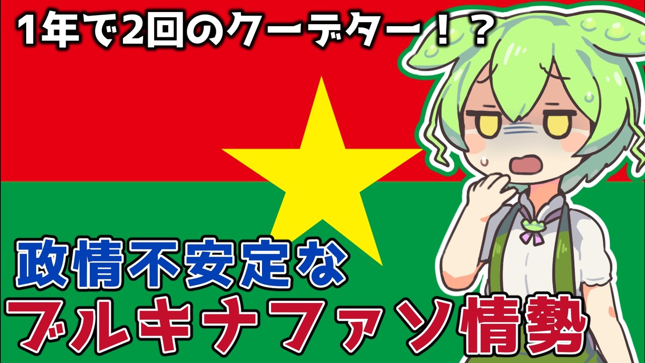 今回は前回解説したブルキナファソの補足(?)動画です。<br>前回の解説から時間がたってより混沌に陥っているブルキナファソ、マジでヤバいです(やばい)<br><br>いいねくれるとうれしいです!(ODA並み感)<br>ご意見・ご感想・ご要望があればぜひコメントしてください。<br><br>使わせていただいているもの<br>VOICEVOX/hiho[ <a href="https://voicevox.hiroshiba.jp/" target="_blank" rel="noopener nofollow">https://voicevox.hiroshiba.jp/</a> ]<br>ずんだもん立ち絵素材/坂本アヒル[<a href="https://seiga.nicovideo.jp/seiga/im8178525" target="_blank" rel="noopener">im8178525</a>]<br><br>◆Twitter<br><a href="https://twitter.com/AfrikaanerMaris" target="_blank" rel="noopener nofollow">https://twitter.com/AfrikaanerMaris</a><br><br>◆niconico<br><a href="https://www.nicovideo.jp/my?cmnhd_ref=device%3Dpc%26site%3Dniconico%26pos%3Dheader%26page%3Dtop" target="_blank" rel="noopener nofollow">https://www.nicovideo.jp/my?cmnhd_ref=device%3Dpc%26site%3Dniconico%26pos%3Dheader%26page%3Dtop</a><br>