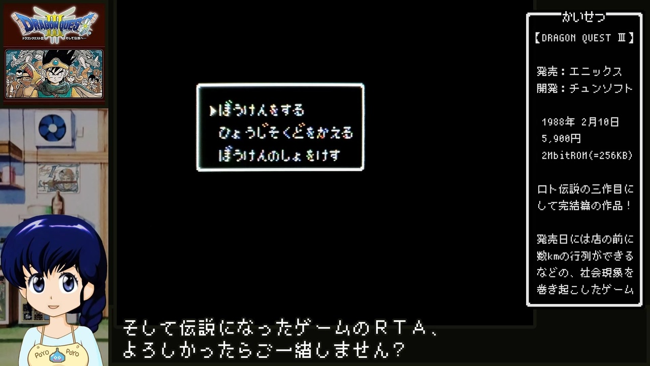 強くてニューゲームっぽいセーブデータを用意して走ってみたお遊び企画でっす。<br><br>‥と見せかけて、主眼は【ブラウン管テレビ】でのファミコンの映像を動画で遺せないかな~っていうのが狙いの動画でっす。 <br><br>(※1080pでの視聴を前提にしてるので、1920x1080以下のサイズだとモアレが酷くなる可能性がありまぁす)<br><br>【参考文献】<br>「ドラゴンクエスト」35周年記念特番 <a href="https://youtu.be/R9SQAaRMOzw?t=3650" target="_blank" rel="noopener nofollow">https://youtu.be/R9SQAaRMOzw?t=3650</a><br><br>めぞん一刻 デジタルリマスター版<br> 01話~: <a href="https://amzn.to/3ojH2WC" target="_blank" rel="noopener nofollow">https://amzn.to/3ojH2WC</a> or <a href="https://abema.app/eYTo" target="_blank" rel="noopener nofollow">https://abema.app/eYTo</a><br> 49話~: <a href="https://amzn.to/3IVRFJd" target="_blank" rel="noopener nofollow">https://amzn.to/3IVRFJd</a> or <a href="https://abema.app/wroh" target="_blank" rel="noopener nofollow">https://abema.app/wroh</a><br>ダイの大冒険 (1991) <a href="https://amzn.to/3zMFvOy" target="_blank" rel="noopener nofollow">https://amzn.to/3zMFvOy</a><br>ダイの大冒険 (2020) <a href="https://amzn.to/3KLs08h" target="_blank" rel="noopener nofollow">https://amzn.to/3KLs08h</a> or <a href="https://abema.tv/video/title/5-25" target="_blank" rel="noopener nofollow">https://abema.tv/video/title/5-25</a><br /> <br><br><span style="color: #e69138;">//共通説明文てすと</span><br><span style="color: #ff00ff;"><strong>【New!】</strong></span>F-ZERO RTA:<a href="https://www.nicovideo.jp/watch/sm45660939" class="watch">sm45660939</a><br>【New!】Romancing Sa・Ga2:<a href="https://www.nicovideo.jp/watch/sm44400984" class="watch">sm44400984</a> <br>【New!】らんま½爆烈乱闘篇RTA (WR):<a href="https://www.nicovideo.jp/watch/sm44178414" class="watch">sm44178414</a>(デバイス制限対策版: <a href="https://www.nicovideo.jp/watch/sm44432134" class="watch">sm44432134</a>)<br>【New!】スーパーファミスタRTA:<a href="https://www.nicovideo.jp/watch/sm43890432" class="watch">sm43890432</a><br>【New!】ファミコンRTA落とし穴可視化用アイコン:<a href="https://seiga.nicovideo.jp/seiga/im11438499" target="_blank" rel="noopener">im11438499</a>(←5月23日以降に投稿したのは消えちゃったぽい...?)<br><br>【直撮り】ブラウン管テレビでファミコンする管理人さん:<a href="https://www.nicovideo.jp/series/423780" target="_blank" rel="noopener">series/423780</a><br>【ミンサガ】RTAとか:<a href="https://www.nicovideo.jp/series/416017" target="_blank" rel="noopener">series/416017</a><br>【WS版FF2】RTA:<a href="https://www.nicovideo.jp/series/426767" target="_blank" rel="noopener">series/426767</a><br>【DEAD OR ALIVE】RTA:<a href="https://www.nicovideo.jp/series/79228" target="_blank" rel="noopener">series/79228</a><br>【バブルボブル】RTA:<a href="https://www.nicovideo.jp/series/366167" target="_blank" rel="noopener">series/366167</a><br><span style="font-size: 14px;">【アーケードアーカイブス】</span>RTA:<a href="https://www.nicovideo.jp/series/79229" target="_blank" rel="noopener">series/79229</a>