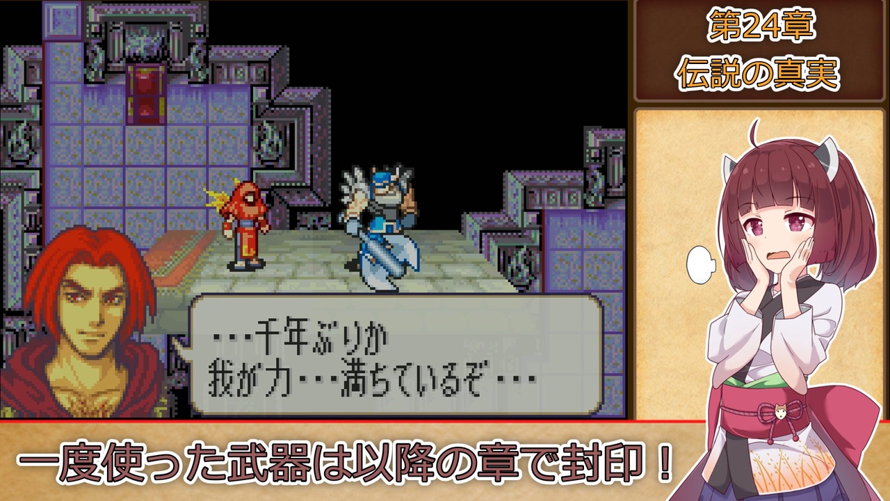 <span style="color: #85200c; font-size: 24px;"><strong><i>(何喋るか考えるのが)難しい章だった…!</i></strong></span><br><span style="color: #85200c;"><strong><i><s>なお章自体の難易度</s></i></strong></span><br><br><strong>ルール1:一度使用した武器は、以降の章で使用する事を禁止する。<br>ルール2:武器の使用の定義は『その武器を装備した状態で敵との戦闘が発生したタイミング』『その武器を売却して換金した場合』杖の場合は『対象に対して使用した時点(命中の可否は問わない)』とする。<br>ルール3:難易度はハードとする。<br>ルール4:1章から終章まで全ての章を攻略し、仲間に出来るユニットは全員加入させ、生存させる。</strong><br><span style="color: #ff0000;"><strong>※ただしルート分岐次第で行けない章、加入出来ない仲間は除外。</strong></span><br><br>本動画のシリーズリスト【<a href="https://www.nicovideo.jp/series/316824" target="_blank" rel="noopener">series/316824</a>】<br>part1【<a href="https://www.nicovideo.jp/watch/sm40376370" class="watch">sm40376370</a>】<br>前:【<a href="https://www.nicovideo.jp/watch/sm41710390" class="watch">sm41710390</a>】次:【<a href="https://www.nicovideo.jp/watch/sm41787144" class="watch">sm41787144</a>】<br><br><strong>使用したソフト</strong><br>VOICEROID+東北きりたんEX<br>VOICEROID+東北ずん子EX<br>VOICEROID2 東北イタコ<br>VOICEVOX:ずんだもん<br><strong>お借りした立ち絵</strong><br>【<a href="https://seiga.nicovideo.jp/seiga/im10626877" target="_blank" rel="noopener">im10626877</a>】【<a href="https://seiga.nicovideo.jp/seiga/im10910197" target="_blank" rel="noopener">im10910197</a>】【<a href="https://seiga.nicovideo.jp/seiga/im10886085" target="_blank" rel="noopener">im10886085</a>】【<a href="https://seiga.nicovideo.jp/seiga/im10572401" target="_blank" rel="noopener">im10572401</a>】<br><strong>お借りした素材</strong><br>ニコニコモンズの皆様(コンテンツツリー参照)<br />VOICEVOXホームページ:<a href="https://voicevox.hiroshiba.jp/" target="_blank" rel="noopener nofollow">https://voicevox.hiroshiba.jp/</a><br>編集ソフト :YMM4<br>投稿動画part1まとめマイリスト:<a href="https://www.nicovideo.jp/mylist/72070653" target="_blank" rel="noopener">mylist/72070653</a><br>あまり喋らないツイッター:<a href="https://twitter.com/titeinotami" target="_blank" rel="noopener nofollow">https://twitter.com/titeinotami</a>
