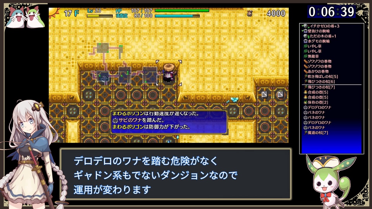 ~1:48まで茶番あり。<br><br>switch版 風来のシレン5plus<br>ワナ師の箱庭のTA / RTA 動画です<br><br>動画投稿時点ではSRC2位です<br><br>レギュレーション:switch版 ライブ探索機能使用<br>仲間なし/新種道具なしレギュレーション。<br>計測はゲーム内タイムで計測。<br><br>VOICEROID 紲星あかり / VOICEVOX ずんだもん 解説あり。<br><br><br>PART1 ここ<br>PART2 <a href="https://www.nicovideo.jp/watch/sm41781167" class="watch">sm41781167</a><br><br>過去PART1リンク:<a href="https://www.nicovideo.jp/mylist/73580957" target="_blank" rel="noopener">mylist/73580957</a><br>全投稿物:<a href="https://www.nicovideo.jp/mylist/73581012" target="_blank" rel="noopener">mylist/73581012</a><br><br>ついったー:@ht_attvphase<br><br>