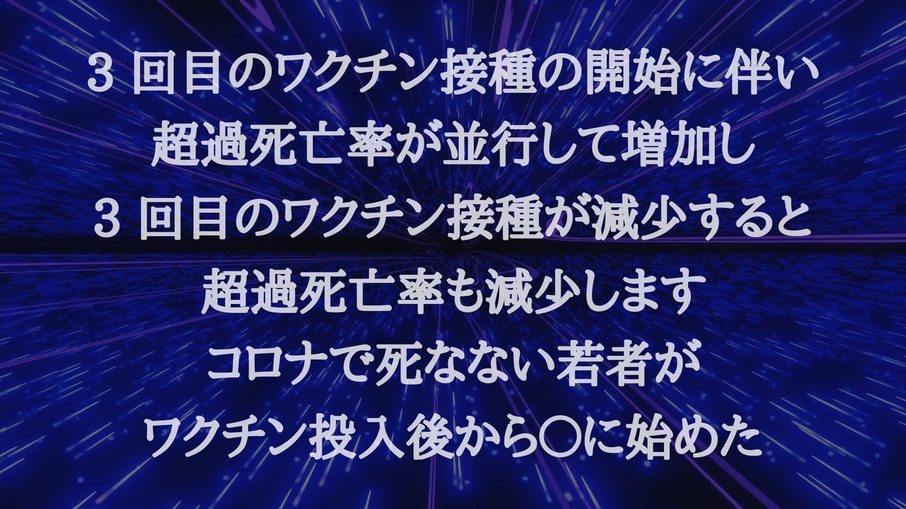 ドイツ・2人の教授の慎重な分析。<br> コロナで死なない若者が、ワクチン投入で死に始めた。<br><br>超過死亡率は、最初のワクチン接種数の増加と並行して増加しています。<br><br>1 回目のワクチン接種の回数が減少するのとまったく同じように、超過死亡率も減少し始めますが、2 回目のワクチン接種の回数が同時に増加するため、1 回目のワクチン接種ほどではありません。<br><br>そして、まさに 2 回目のワクチン接種のピークで、超過死亡率もピークに達し、その後、2 回目のワクチン接種とちょうど平行して減少します。<br><br>3 回目のワクチン接種の開始に伴い、過剰死亡率が並行して増加し、3 回目のワクチン接種が減少するのとまったく同じように、過剰死亡率も減少します。<br><br>しかし、有害な副作用としてのワクチン接種が予期せぬ死亡の数を増加させた場合、まさにそのようなパターンが予想されます。<br><br>その一方で、予防接種が確実に予期せぬ死亡につながることも明確に実証されていると見なすことができます。<br><br><br>要翻訳<br> <a href="https://t.co/p90h8tsGaW" target="_blank" rel="noopener nofollow">https://t.co/p90h8tsGaW</a> <br> Twitter<br> <a href="https://t.co/lr8f7B7ZMe" target="_blank" rel="noopener nofollow">https://t.co/lr8f7B7ZMe</a><br><br><br>資料<br> <a href="https://drive.google.com/drive/folders/10Jv_APjlnXKX7UniNiPJEOD4tW8Fg8hj" target="_blank" rel="noopener nofollow">https://drive.google.com/drive/folders/10Jv_APjlnXKX7UniNiPJEOD4tW8Fg8hj</a><br><br><br><br />著作権、肖像権に配慮して作成しております。<br><br>◆気になったニュースの台本!?<br>メモ代わりに作った台本をそのままあげてます<br><a href="https://keiichiro8140.hatenablog.com/." target="_blank" rel="noopener nofollow">https://keiichiro8140.hatenablog.com/.</a><br><br><br>ここからはシリーズ紹介<br><br><br>◆ ワクチン解毒・デトックス<br><a href="https://x.gd/fZweg" target="_blank" rel="noopener nofollow">https://x.gd/fZweg</a><br><br>◆ウイリアム・マキス博士のがん治療(イベルメクチン・フェンベンダゾール等)<br><a href="https://x.gd/AtFYS" target="_blank" rel="noopener nofollow">https://x.gd/AtFYS</a><br><br>◆予防接種健康被害救済制度<br><a href="https://x.gd/0xK9x" target="_blank" rel="noopener nofollow">https://x.gd/0xK9x</a><br><br>◆気になったニュース #1501~<br><br>◆ 【ショートver】気になったニュース<br><a href="https://x.gd/7MxXC" target="_blank" rel="noopener nofollow">https://x.gd/7MxXC</a><br><br>◆ 気になったニュース #1001~<br><a href="https://x.gd/Lp8gv" target="_blank" rel="noopener nofollow">https://x.gd/Lp8gv</a><br><br>◆ 気になったニュース #501~<br><a href="https://x.gd/EmbS4" target="_blank" rel="noopener nofollow">https://x.gd/EmbS4</a><br><br>◆ 気になったニュース #1~#500<br><a href="https://x.gd/uPhNb" target="_blank" rel="noopener nofollow">https://x.gd/uPhNb</a><br><br>◆ X(旧Twitter)・テレグラムで気になった情報<br><a href="https://x.gd/YG6FT" target="_blank" rel="noopener nofollow">https://x.gd/YG6FT</a><br><br>◆ 日比谷5万人パレードデ⚪生放送アーカイブ動画<br><a href="https://x.gd/3CHJv" target="_blank" rel="noopener nofollow">https://x.gd/3CHJv</a><br><br>◆日比谷5万人パレード⚪モのマイリスト作ってみました<br><a href="https://nico.ms/mylist/76828848?ref=sp_other" target="_blank" rel="noopener nofollow">https://nico.ms/mylist/76828848?ref=sp_other</a><br><br>◆3.30 令和の百姓⚪⚪<br><a href="https://www.nicovideo.jp/series/511791?ref=garage_share_other" target="_blank" rel="noopener nofollow">https://www.nicovideo.jp/series/511791?ref=garage_share_other</a><br><br>◆ 及川幸久さんの【XNEWS】シリーズ<br><a href="https://x.gd/3k78K" target="_blank" rel="noopener nofollow">https://x.gd/3k78K</a><br><br>◆これまでの動画<a href="https://x.gd/sPXoJ" target="_blank" rel="noopener nofollow">https://x.gd/sPXoJ</a><br><br>◆もしも(BAN)の時のためのマイリンク集<a href="https://lit.link/K-16_News44" target="_blank" rel="noopener nofollow">https://lit.link/K-16_News44</a><br><br>