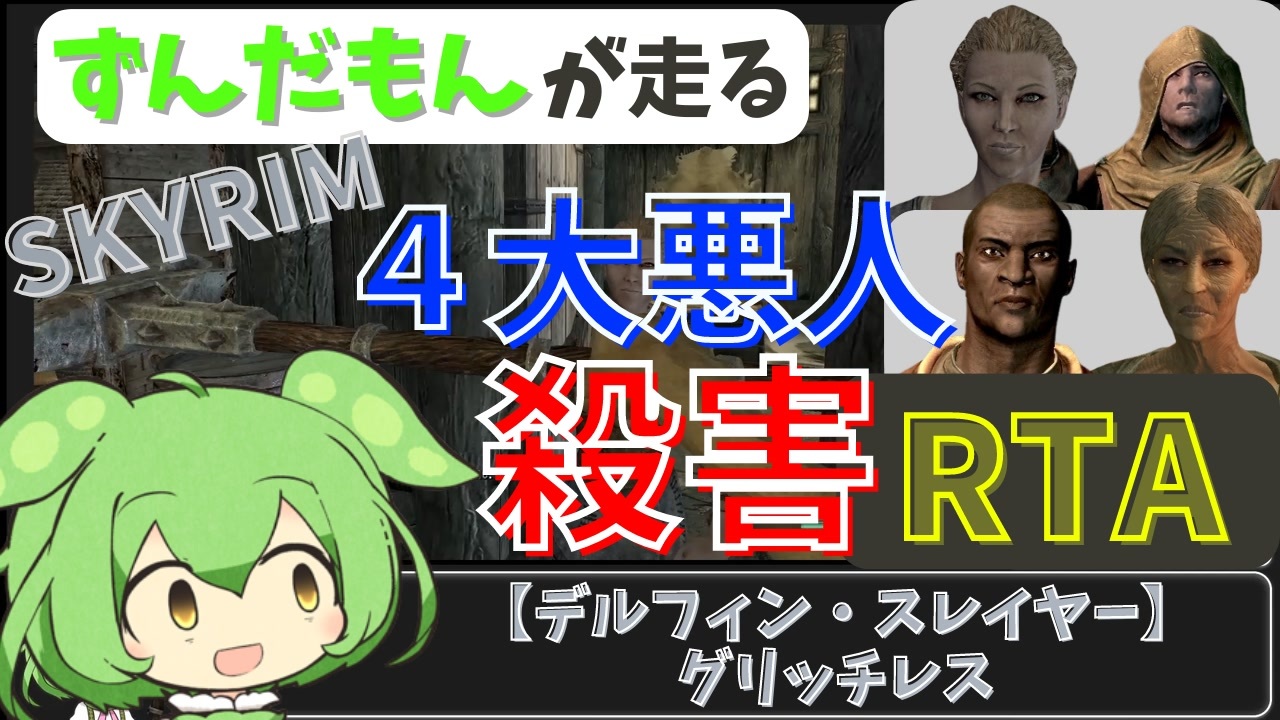 スカイリム4大悪人殺害RTAを走りました。<br>ターゲット : デルフィン、ヘイムスカー、ナゼーム、グレロッド<br><br>レギュレーション : SkyrimSE(1.5.97)、グリッチレス、MOD:【Delphine Slayer】のみ導入<br>MOD : 【Delphine Slayer】<a href="https://www.nexusmods.com/skyrimspecialedition/mods/84724" target="_blank" rel="noopener nofollow">https://www.nexusmods.com/skyrimspecialedition/mods/84724</a><br>追記 : 要望に応え、Ver1.2で武器出し時のSEを例のBGMに変更しました!(2023/02/16) <br><br>先駆者様 : <a href="https://www.nicovideo.jp/watch/sm36858881" class="watch">sm36858881</a><br><br>使用させていただいたもの<br>枠 : あいすもなかの部屋様 <a href="https://commons.nicovideo.jp/works/nc270794" target="_blank" rel="noopener">nc270794</a><br>立ち絵 : akihiyo様 <a href="https://seiga.nicovideo.jp/seiga/im10792934" target="_blank" rel="noopener">im10792934</a><br>テキスト読み上げソフト : VOICEVOX:ずんだもん<br><br>前回 (デルフィン殺害RTA) : <a href="https://www.nicovideo.jp/watch/sm41783766" class="watch">sm41783766</a> | 次回 (乱心RTA): <a href="https://www.nicovideo.jp/watch/sm41826033" class="watch">sm41826033</a><br><br>MOD : 【Delphine Slayer】の皆さまの反応へ : 想像以上に好評でビビり散らかしました。(ホントにありがとうございます!)<br><br>前回の動画へのコメント、ニコニ広告、いいね!、タグ付け等ありがとうございました!(飛んで喜びました)<br><br />twitter始めました : <a href="https://twitter.com/scire05152870" target="_blank" rel="noopener nofollow">https://twitter.com/scire05152870</a><br>Youtube : <a href="https://www.youtube.com/channel/UCcJRfwNhg22ltREJ3WxHrRw" target="_blank" rel="noopener nofollow">https://www.youtube.com/channel/UCcJRfwNhg22ltREJ3WxHrRw</a>