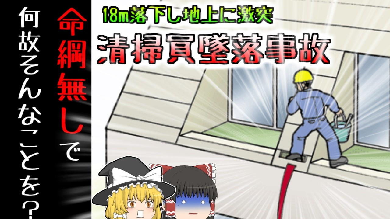 <a href="#" class="seekTime" data-seekTime="00:00" onclick="seekNicoPlayer('#00:00'); return false;">#00:00</a> 冒頭挨拶<br><a href="#" class="seekTime" data-seekTime="00:39" onclick="seekNicoPlayer('#00:39'); return false;">#00:39</a> 視聴上の注意<br><a href="#" class="seekTime" data-seekTime="1:18" onclick="seekNicoPlayer('#1:18'); return false;">#1:18</a> テナントビルの窓清掃<br><a href="#" class="seekTime" data-seekTime="1:58" onclick="seekNicoPlayer('#1:58'); return false;">#1:58</a> 作業員男性の「Aさん」<br><a href="#" class="seekTime" data-seekTime="2:34" onclick="seekNicoPlayer('#2:34'); return false;">#2:34</a> 同僚の「Bさん」と二人で<br><a href="#" class="seekTime" data-seekTime="3:14" onclick="seekNicoPlayer('#3:14'); return false;">#3:14</a> Bさんは誘導員に<br><a href="#" class="seekTime" data-seekTime="3:20" onclick="seekNicoPlayer('#3:20'); return false;">#3:20</a> Aさんは最上階の清掃を開始<br><a href="#" class="seekTime" data-seekTime="3:48" onclick="seekNicoPlayer('#3:48'); return false;">#3:48</a> 音を聞いて振り返ると…<br><a href="#" class="seekTime" data-seekTime="4:39" onclick="seekNicoPlayer('#4:39'); return false;">#4:39</a> なぜ転落していた?<br><a href="#" class="seekTime" data-seekTime="5:05" onclick="seekNicoPlayer('#5:05'); return false;">#5:05</a> いくつかの要因<br><a href="#" class="seekTime" data-seekTime="7:12" onclick="seekNicoPlayer('#7:12'); return false;">#7:12</a> 同様の災害防止策<br><br><br>今回紹介するのは、以前リクエストがありました、ビルメンテナンス業に関しての事例です。<br>東京都中央区の某所ではこの日、オフィスビルのめるメンテナンスが行われていました。<br>ビルメンテナンスとは、建物の保守点検、清掃などを行う業務で、作業員男性の「Aさん」はこの日、ビル六階部分のベランダで、窓の清掃業務を行っていました。<br>彼の同僚である「Bさん」はこの作業中、地上で歩行者の誘導などを行っていましたがその最中、「ドーン」という音が背後から聞こえたので振り返ると、そこには六階で作業をしていたはずのAさんの姿が。<br>どうやら彼は、窓の清掃中に誤って転落してしまい、約18メートルの高さから、地上のコンクリートに打ち付けられていたようでした。<br>すぐに彼は近くの病院に搬送され、治療を受けてたものの、出血性のショックによりこの世を去ってしまいました。<br><br>一体彼の身に何が起こっていたのでしょうか?<br><br>引用・出展・参考文献<br>厚生労働省 職場のあんぜんサイト<br><a href="https://ishort.ink/2hdy" target="_blank" rel="noopener nofollow">https://ishort.ink/2hdy</a><br>ビルメンテナンス業 - 厚生労働省<br><a href="https://ishort.ink/oskh" target="_blank" rel="noopener nofollow">https://ishort.ink/oskh</a><br>ビルメン ビルメンテナンス業の定義<br><a href="https://ishort.ink/f4u4" target="_blank" rel="noopener nofollow">https://ishort.ink/f4u4</a><br>街の屋根屋さん パラペットとは<br><a href="https://ishort.ink/KvDM" target="_blank" rel="noopener nofollow">https://ishort.ink/KvDM</a><br>MACOM ガラス清掃<br><a href="https://ishort.ink/xxUq" target="_blank" rel="noopener nofollow">https://ishort.ink/xxUq</a><br />※この動画は過去の事件を知り、現在でも同じことが発生する危険性を再認識、関与しないように促すための動画であり、視聴者を扇動、動揺を誘うためのコンテンツではありません。<br><br>ご要望にお応えして、メンバーシップの開設を行いました。<br>下記URLからも登録可能ですので、ご興味がある方は是非ご参加ください。<br><a href="https://www.youtube.com/channel/UCcT5a1J7XJW7CLYI2RKl4pw/join" target="_blank" rel="noopener nofollow">https://www.youtube.com/channel/UCcT5a1J7XJW7CLYI2RKl4pw/join</a><br><br><br>Twitter<br>→<a href="https://twitter.com/yukkurisurutoko" target="_blank" rel="noopener nofollow">https://twitter.com/yukkurisurutoko</a><br><br>取り急ぎ、簡易的にですがマイリストを作りました。<br>【ゆっくり解説】事故・事件関係紹介リスト <br><a href="https://www.nicovideo.jp/mylist/71034319" target="_blank" rel="noopener nofollow">https://www.nicovideo.jp/mylist/71034319</a><br>【ゆっくり解説】放射線系事故<br><a href="https://www.nicovideo.jp/mylist/71034368" target="_blank" rel="noopener nofollow">https://www.nicovideo.jp/mylist/71034368</a><br>【ゆっくり解説】鉄道系事故・事件関連<br><a href="https://www.nicovideo.jp/mylist/71034379" target="_blank" rel="noopener nofollow">https://www.nicovideo.jp/mylist/71034379</a>