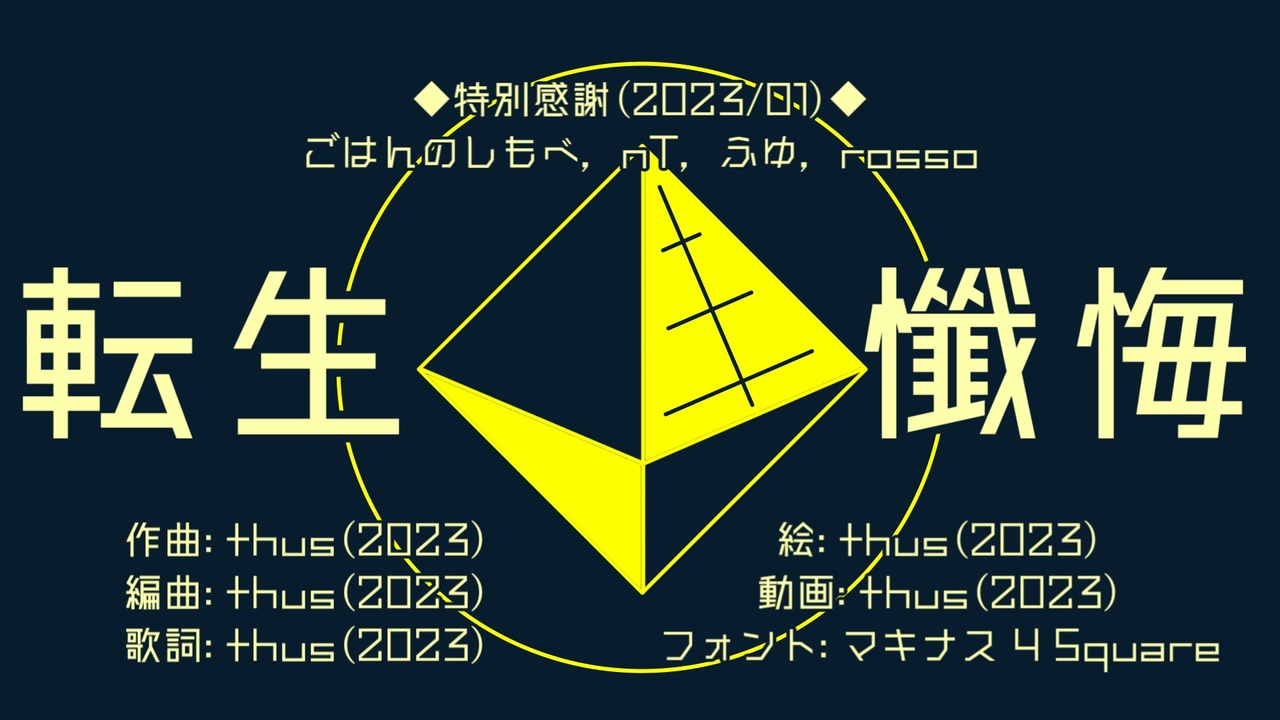 どうも、転生懺悔を紡ぐthusです。<br>(カラオケオン:<a href="https://www.nicovideo.jp/watch/sm42464662" class="watch">sm42464662</a>|カラオケオフ:<a href="https://www.nicovideo.jp/watch/sm42376243" class="watch">sm42376243</a> )<br><br>◆「ボカロオルタナティブ祭」出展作品です。(詳細:<a href="https://twipla.jp/events/533052" target="_blank" rel="noopener nofollow">https://twipla.jp/events/533052</a> )<br>・主催:Aroh(<a href="https://www.nicovideo.jp/user/5044959" target="_blank" rel="noopener">user/5044959</a> )<br><br> オルタナティブという音楽ジャンルがあることは存じていましたが、一体全体何の代わりなんだろうかと疑問に思うくらいには無知だったので、オルタナティブロックについて調べてみたのですが、ボカロメタル祭の時と同様、調べれば調べるほど分からなくなりました。オルタナティブロックに分類される曲も色々聞きましたが、特徴が上手く掴めず…極めつけはオルタナティブロックに纏わる何かの動画で音楽シーンがオルタナティブロックに文字通り取って代わられたと聞いた時、取って代わられたのならばもうそれはオルタナティブと言えないのではないのかとか考えると、愈々定義が分からなくなってきました。未来という言葉とよく似ていると思いながらも、しかし雲を掴むようなオルタナティブをちゃんと出さないといけないと頭を悩ませていましたが、マインドを共有できるならば特定の音楽ジャンルを排するものではないという安心設計だったので、(多分「音楽的純度の追求」という)マインドの下頑張って作ってみました。音楽的純度とはを考えだすとそれこそもう泥沼だったので、自らが良いと思うものと置き換えてみました。<br> ついこの間「帰郷」を出したばっかりなので、此処に書くことがこれくらいしかありません。ですので私の周囲を見渡して面白いものはないかと見つけようとするのですが、目につくのはAQUAとかWETとか水に関連する英単語です。あと、ラノベのタイトルみたいな風邪薬。ラノベのタイトルみたいな風邪薬を見ると、ラノベのタイトルみたいな乾麺も思い出されます。さあ困りました(?) 水分とラノベ風ドリアな言葉で溢れている(?)此処は最早欧州の一角にあるレストラン。そんなわけありません。ですが一旦、先に書いたことを見返してみましょう。<br><br> …見返しましたか?<br> ありがとうございます。そしてごめんなさい、特に何もございません。<br><br>2023/02/27月 16:24:2,525再生<br>//28火 18:24:1万再生<br>/03/02:2万再生<br>//03:3万再生<br>//05:4万再生<br>//10:5万再生<br>//13:6万再生<br>//15:7万再生<br>//18:8万再生<br>/12/22金 00:04:10万再生<br /><br><br><br>====================<br>| 2026/01/04 21:00「インスペクタの自死未遂」:<a href="https://www.nicovideo.jp/watch/sm45800854" class="watch">sm45800854</a><br>| 投稿曲マイリスト:<a href="https://www.nicovideo.jp/mylist/57867175" target="_blank" rel="noopener">mylist/57867175</a><br>|――――――――――――――――――<br>| pixivFANBOX:<a href="https://thus.fanbox.cc/" target="_blank" rel="noopener nofollow">https://thus.fanbox.cc/</a><br>| アルバム等配信中:<a href="https://thus-library.blogspot.com/search/label/discography" target="_blank" rel="noopener nofollow">https://thus-library.blogspot.com/search/label/discography</a><br>| つなぐ(依頼・リクエスト):<a href="https://tsunagu.cloud/users/thus" target="_blank" rel="noopener nofollow">https://tsunagu.cloud/users/thus</a><br>|――――――――――――――――――<br>| YouTube:<a href="https://youtube.com/@thus" target="_blank" rel="noopener nofollow">https://youtube.com/@thus</a><br>| X:<a href="https://x.com/thus_submission" target="_blank" rel="noopener nofollow">https://x.com/thus_submission</a><br>| 他全リンク:<a href="https://lit.link/thus" target="_blank" rel="noopener nofollow">https://lit.link/thus</a><br>|――――――――――――――――――<br>| オフボーカル等:<a href="https://piapro.jp/thus_999discommunication" target="_blank" rel="noopener nofollow">https://piapro.jp/thus_999discommunication</a><br>| 楽曲/動画の二次利用に関して:<a href="https://bit.ly/3JRQQiZ" target="_blank" rel="noopener nofollow">https://bit.ly/3JRQQiZ</a><br><span style="color: #262626;">| </span><span style="color: #262626;"><strong>歌詞図書館(ふりがな有るよ!):</strong></span><a href="https://thus-library.blogspot.com/" target="_blank" rel="noopener nofollow">https://thus-library.blogspot.com/</a><br>====================