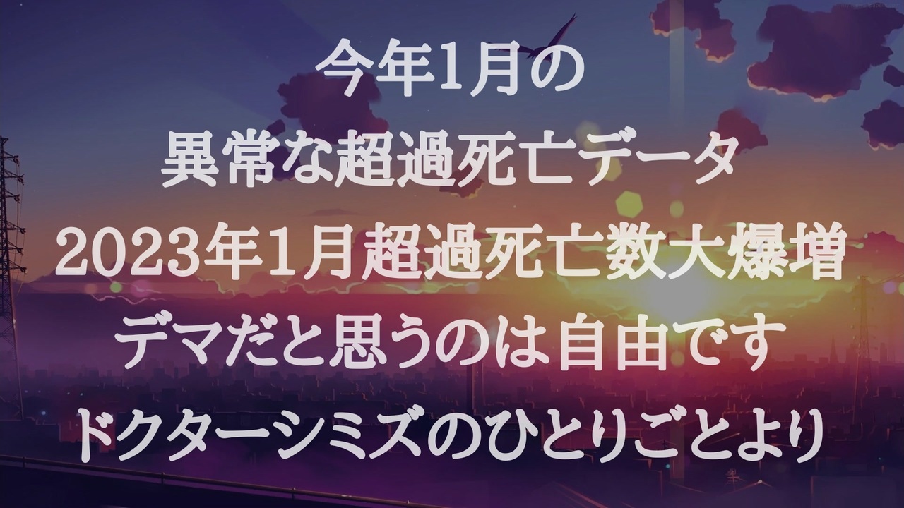今年1月の異常な超過死亡データ<br> 2023年1月超過死亡数大爆増 <br> デマだと思うのは自由です<br> ドクターシミズのひとりごと<br><br>ドクターシミズ先生による今年一月の異常な超過死亡データのまとめとその考察。必読です!<br> <a href="https://x.gd/6eo6v" target="_blank" rel="noopener nofollow">https://x.gd/6eo6v</a><br><br>ドクターシミズのひとりごと<br> 2023年1月超過死亡数大爆増 <br> デマだと思うのは自由です<br> <a href="https://x.gd/Rwzv7" target="_blank" rel="noopener nofollow">https://x.gd/Rwzv7</a><br><br>札幌市2022年1月比で316人、14.6%の増加<br>廿日市市32人、24.2%の増加<br>瀬戸内市21人、38.9%の大爆増<br>北本市27人、32.5%の爆増(ただし2021年比では14人、14.6%の増加)<br>調布市47人、23.9%増加。おそらく初の240人越え。<br>釧路市14人、6.0%の微増。今のところ唯一の過去最高記録を示さなかった都市です。<br>東金市30人、44.1%の大爆増。100人目前。<br>金沢市2022年比では19人、3.8%の微増。ただし2021年比では111人、26.8%の爆増。<br>柏崎市29人、25.4%の爆増。おそらく初の140人越え。<br>函館市102人、24.8%増加。おそらく初の500人越え。<br>神戸市297人、16.9%の増加。おそらく初の2000人越え。<br>長野市89人、18.5%の増加。おそらく初の500人越え。<br>さいたま市138人、10.4%の増加。ただし、2021年比では302人、25.9%の爆増。<br>千葉市227人、21.4%の増加。1,300人目前。おそらく初の1,200人越え。<br>大阪市453人、13.6%の増加。4000人近い死者数。<br>堺市2022年比108人、10.9%の増加。ただし2021年比233人、26.9%の増加。1,100人目前。<br><br>別途リンク<br> <a href="https://x.gd/ZKwSC" target="_blank" rel="noopener nofollow">https://x.gd/ZKwSC</a><br><br><br />著作権、肖像権に配慮して作成しております。<br><br>◆気になったニュースの台本!?<br>メモ代わりに作った台本をそのままあげてます<br><a href="https://keiichiro8140.hatenablog.com/." target="_blank" rel="noopener nofollow">https://keiichiro8140.hatenablog.com/.</a><br><br><br>ここからはシリーズ紹介<br><br><br>◆ ワクチン解毒・デトックス<br><a href="https://x.gd/fZweg" target="_blank" rel="noopener nofollow">https://x.gd/fZweg</a><br><br>◆ウイリアム・マキス博士のがん治療(イベルメクチン・フェンベンダゾール等)<br><a href="https://x.gd/AtFYS" target="_blank" rel="noopener nofollow">https://x.gd/AtFYS</a><br><br>◆予防接種健康被害救済制度<br><a href="https://x.gd/0xK9x" target="_blank" rel="noopener nofollow">https://x.gd/0xK9x</a><br><br>◆気になったニュース #1501~<br><br>◆ 【ショートver】気になったニュース<br><a href="https://x.gd/7MxXC" target="_blank" rel="noopener nofollow">https://x.gd/7MxXC</a><br><br>◆ 気になったニュース #1001~<br><a href="https://x.gd/Lp8gv" target="_blank" rel="noopener nofollow">https://x.gd/Lp8gv</a><br><br>◆ 気になったニュース #501~<br><a href="https://x.gd/EmbS4" target="_blank" rel="noopener nofollow">https://x.gd/EmbS4</a><br><br>◆ 気になったニュース #1~#500<br><a href="https://x.gd/uPhNb" target="_blank" rel="noopener nofollow">https://x.gd/uPhNb</a><br><br>◆ X(旧Twitter)・テレグラムで気になった情報<br><a href="https://x.gd/YG6FT" target="_blank" rel="noopener nofollow">https://x.gd/YG6FT</a><br><br>◆ 日比谷5万人パレードデ⚪生放送アーカイブ動画<br><a href="https://x.gd/3CHJv" target="_blank" rel="noopener nofollow">https://x.gd/3CHJv</a><br><br>◆日比谷5万人パレード⚪モのマイリスト作ってみました<br><a href="https://nico.ms/mylist/76828848?ref=sp_other" target="_blank" rel="noopener nofollow">https://nico.ms/mylist/76828848?ref=sp_other</a><br><br>◆3.30 令和の百姓⚪⚪<br><a href="https://www.nicovideo.jp/series/511791?ref=garage_share_other" target="_blank" rel="noopener nofollow">https://www.nicovideo.jp/series/511791?ref=garage_share_other</a><br><br>◆ 及川幸久さんの【XNEWS】シリーズ<br><a href="https://x.gd/3k78K" target="_blank" rel="noopener nofollow">https://x.gd/3k78K</a><br><br>◆これまでの動画<a href="https://x.gd/sPXoJ" target="_blank" rel="noopener nofollow">https://x.gd/sPXoJ</a><br><br>◆もしも(BAN)の時のためのマイリンク集<a href="https://lit.link/K-16_News44" target="_blank" rel="noopener nofollow">https://lit.link/K-16_News44</a><br><br>