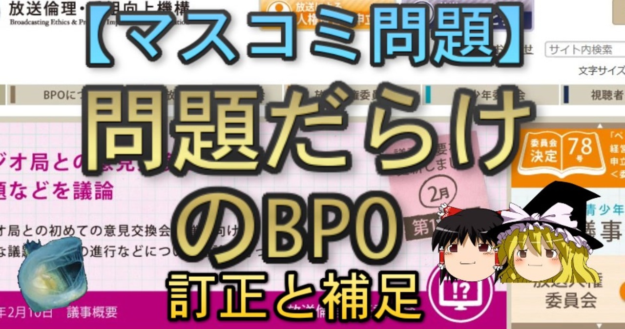 さて、本日は過去動画「問題だらけのBPO」の訂正と補足を扱っていきます。<br><br>本日のブログ記事<br><a href="https://oogchib.hateblo.jp/entry/2023/02/27/005222" target="_blank" rel="noopener nofollow">https://oogchib.hateblo.jp/entry/2023/02/27/005222</a><br><br>元動画<br>【ゆっくり解説】問題だらけのBPO<br><a href="https://www.nicovideo.jp/watch/sm41820707" class="watch">sm41820707</a><br><br>注意<br>・この動画は「マスコミ問題」を扱っています<br><br>・「マスコミ問題」であり右派・左派等の陣営論争は本題ではありません<br><br>・「特定の国との特別な関係」は問題の枝葉です、主問題は業界の体質です<br><br>・自身の常識が相手にとっても常識とは限りません、「他者がそれを見たらど<br>う思うか」という客観性を常に持ちましょう。<br><br>・日常生活で注意する程度には言動に注意を心がけてください<br><br>・リクエストは原則受け付けていません<br><br>・引用ソースへのリンクが同時掲載のブログにあります<br><br>・毎週日曜日更新<br><br><br>引用ソースと動画のテキストをブログ日韓問題(初心者向け)のほうへ掲載しています。<br><br>日韓問題(初心者向け)<br><a href="https://oogchib.hateblo.jp/" target="_blank" rel="noopener nofollow">https://oogchib.hateblo.jp/</a><br><br>暇つぶしにどうぞ<br><a href="http://ooguchib.blog.fc2.com/" target="_blank" rel="noopener nofollow">http://ooguchib.blog.fc2.com/</a> <br><br>twitter @ooguchib<br><a href="https://twitter.com/ooguchib" target="_blank" rel="noopener nofollow">https://twitter.com/ooguchib</a><br><br>前 <a href="https://www.nicovideo.jp/watch/sm41854808" class="watch">sm41854808</a> <a href="https://www.nicovideo.jp/mylist/59069876" target="_blank" rel="noopener">mylist/59069876</a> <a href="https://www.nicovideo.jp/watch/sm41887901" class="watch">sm41887901</a><br><br>番外編マイリスト<br><a href="https://www.nicovideo.jp/mylist/62992608" target="_blank" rel="noopener">mylist/62992608</a><br><br>YouTube版<br><a href="https://youtu.be/8Z5Lyy424M0" target="_blank" rel="noopener nofollow">https://youtu.be/8Z5Lyy424M0</a><br>