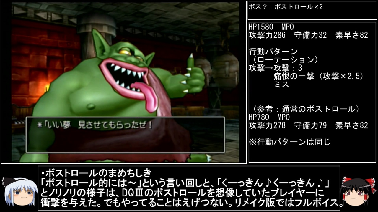 ついに最終回までのカウントダウン開始。<br>ボストロール的にもラストスパートです。<br><br>前→<a href="https://www.nicovideo.jp/watch/sm41841131" class="watch">sm41841131</a> 次→<a href="https://www.nicovideo.jp/watch/sm41875606" class="watch">sm41875606</a><br><br>YouTube版→<a href="https://youtu.be/ChgZ33ewFKQ" target="_blank" rel="noopener nofollow">https://youtu.be/ChgZ33ewFKQ</a><br><br><br>※動画の大きさが変わる方は、お手数ですが設定→画質を自動から〇pに変えると解決します。<br>※一部機種は互換機を使用してのプレイとなります。<br><br>縛りルール(不明点はシリーズのQ&Aを参照)<br>①使った武器・防具・装飾品・道具・呪文・特技・一部特殊施設(メダル王・カジノ・移民の町)・職業(3,6,7)・仲間モンスター(4,5,6,8+7の職業)は次以降のシリーズで使用禁止。<br>(NPCキャラが使用した装備や呪文を含む。売却及び錬金素材としても使用扱い)<br><br>②裏技・バグ技の禁止。<br><br>③逃走禁止&戦闘終了時は全員生存。<br><br>④レベルを上げ過ぎない。<br>ダンジョンやボスは公式ガイドブックに記載されたレベル+3まで。<br>ラスボスは全ての呪文を習得するレベル+3程度までに収める。<br><br>⑤裏ボスも規定回数、規定ターン以内に倒す。<br>(6の裏ダンジョン突入時のみ、条件を満たすため①の職業を解禁)<br><br>(おまけ)<br>宝は可能なものに限り全回収。<br>5と6は同一モンスターの仲間不可。<br>回避可能なボスも全て倒す。<br><br><br>この動画で利用している株式会社スクウェア・エニックスを代表とする共同著作者が権利を所有する著作物及びスギヤマ工房有限会社が権利を所有する楽曲の転載・配布は禁止いたします。<br>(C) ARMOR PROJECT/BIRD STUDIO/SQUARE ENIX All Rights Reserved.<br>(C) SUGIYAMA KOBO (P) SUGIYAMA KOBO<br><br>AquesTalk2ライセンスID:AQTK2WINUSR23122185<br /><br><br>❤いいねを押していただけるとモチベーションと投稿速度が上がるので宜しくお願い致します!<br><br>作者ツイッター→ <a href="https://twitter.com/nig0117" target="_blank" rel="noopener nofollow">https://twitter.com/nig0117</a><br>PIXIV FANBOX→ <a href="https://sutanokeiji.fanbox.cc/" target="_blank" rel="noopener nofollow">https://sutanokeiji.fanbox.cc/</a><br><br>( 以前はWEB小説書いてました→ <a href="https://kakuyomu.jp/works/1177354054884910267" target="_blank" rel="noopener nofollow">https://kakuyomu.jp/works/1177354054884910267</a> )