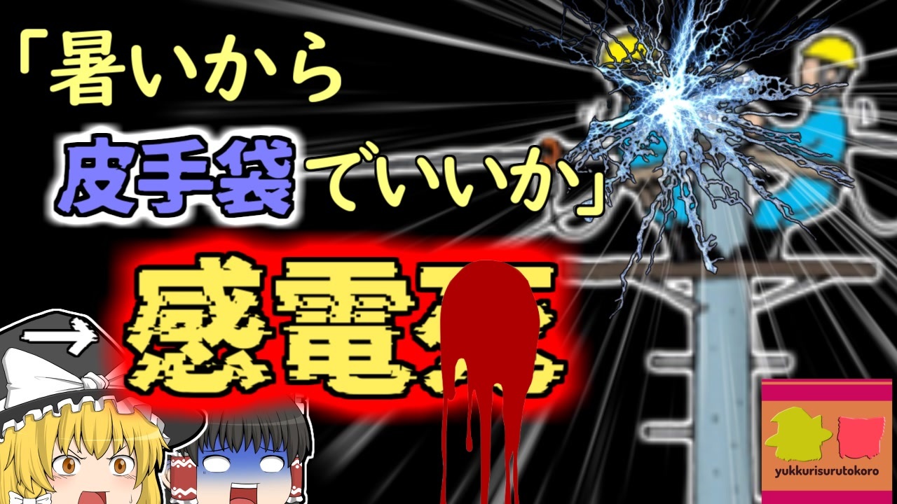 <a href="#" class="seekTime" data-seekTime="00:00" onclick="seekNicoPlayer('#00:00'); return false;">#00:00</a> 冒頭挨拶<br><a href="#" class="seekTime" data-seekTime="00:35" onclick="seekNicoPlayer('#00:35'); return false;">#00:35</a> 視聴上の注意<br><a href="#" class="seekTime" data-seekTime="1:17" onclick="seekNicoPlayer('#1:17'); return false;">#1:17</a> 電柱新設工事<br><a href="#" class="seekTime" data-seekTime="0:43" onclick="seekNicoPlayer('#0:43'); return false;">#0:43</a> 電気の通り道<br><a href="#" class="seekTime" data-seekTime="2:23" onclick="seekNicoPlayer('#2:23'); return false;">#2:23</a> 下請け業者の「Aさん」<br><a href="#" class="seekTime" data-seekTime="3:22" onclick="seekNicoPlayer('#3:22'); return false;">#3:22</a> 二人で電柱の上へ<br><a href="#" class="seekTime" data-seekTime="3:39" onclick="seekNicoPlayer('#3:39'); return false;">#3:39</a> 突然の被災<br><a href="#" class="seekTime" data-seekTime="4:26" onclick="seekNicoPlayer('#4:26'); return false;">#4:26</a> 原因の調査<br><a href="#" class="seekTime" data-seekTime="4:40" onclick="seekNicoPlayer('#4:40'); return false;">#4:40</a> ゴムではなく皮だった<br><a href="#" class="seekTime" data-seekTime="5:49" onclick="seekNicoPlayer('#5:49'); return false;">#5:49</a> 不十分だった安全衛生教育<br><a href="#" class="seekTime" data-seekTime="6:43" onclick="seekNicoPlayer('#6:43'); return false;">#6:43</a> 災害防止策<br><br><br>今回紹介するのは、以前リクエストをもらっていた「電気工事」に関する事例です。<br>東京都郊外にある、とある住宅街の一角ではこの日、電柱の新設工事が行われていました。<br>下請け業者の作業員である「Aさん」はこの日、同僚の「Bさん」と共に電柱に上り、各家庭へと電気を届けるための、100vの低圧電線を取り付ける工事を行っていましたが、突然彼は感電して意識を失ってしまいました。<br>Aさんはその後すぐに病院に搬送されて行きましたが、その途中でこの世を去ってしまいました。<br>実は当時、Aさんは夏の暑さで絶縁用のゴム手袋を使うことを避け、皮手袋を装着しており、その手で電線をにぎってしまっていたため、手から体を通して触れていた電柱に電気が流れてしまい、被災していました。<br><br>引用・出展・参考文献<br>厚生労働省 職場のあんぜんサイト<br><a href="https://ishort.ink/2hdy" target="_blank" rel="noopener nofollow">https://ishort.ink/2hdy</a><br>関西電気保安協会<br>電気の通り道 発電所から自宅まで<br><a href="https://ishort.ink/XBsU" target="_blank" rel="noopener nofollow">https://ishort.ink/XBsU</a><br><br />※この動画は過去の事件を知り、現在でも同じことが発生する危険性を再認識、関与しないように促すための動画であり、視聴者を扇動、動揺を誘うためのコンテンツではありません。<br><br>ご要望にお応えして、メンバーシップの開設を行いました。<br>下記URLからも登録可能ですので、ご興味がある方は是非ご参加ください。<br><a href="https://www.youtube.com/channel/UCcT5a1J7XJW7CLYI2RKl4pw/join" target="_blank" rel="noopener nofollow">https://www.youtube.com/channel/UCcT5a1J7XJW7CLYI2RKl4pw/join</a><br><br><br>Twitter<br>→<a href="https://twitter.com/yukkurisurutoko" target="_blank" rel="noopener nofollow">https://twitter.com/yukkurisurutoko</a><br><br>取り急ぎ、簡易的にですがマイリストを作りました。<br>【ゆっくり解説】事故・事件関係紹介リスト <br><a href="https://www.nicovideo.jp/mylist/71034319" target="_blank" rel="noopener nofollow">https://www.nicovideo.jp/mylist/71034319</a><br>【ゆっくり解説】放射線系事故<br><a href="https://www.nicovideo.jp/mylist/71034368" target="_blank" rel="noopener nofollow">https://www.nicovideo.jp/mylist/71034368</a><br>【ゆっくり解説】鉄道系事故・事件関連<br><a href="https://www.nicovideo.jp/mylist/71034379" target="_blank" rel="noopener nofollow">https://www.nicovideo.jp/mylist/71034379</a>