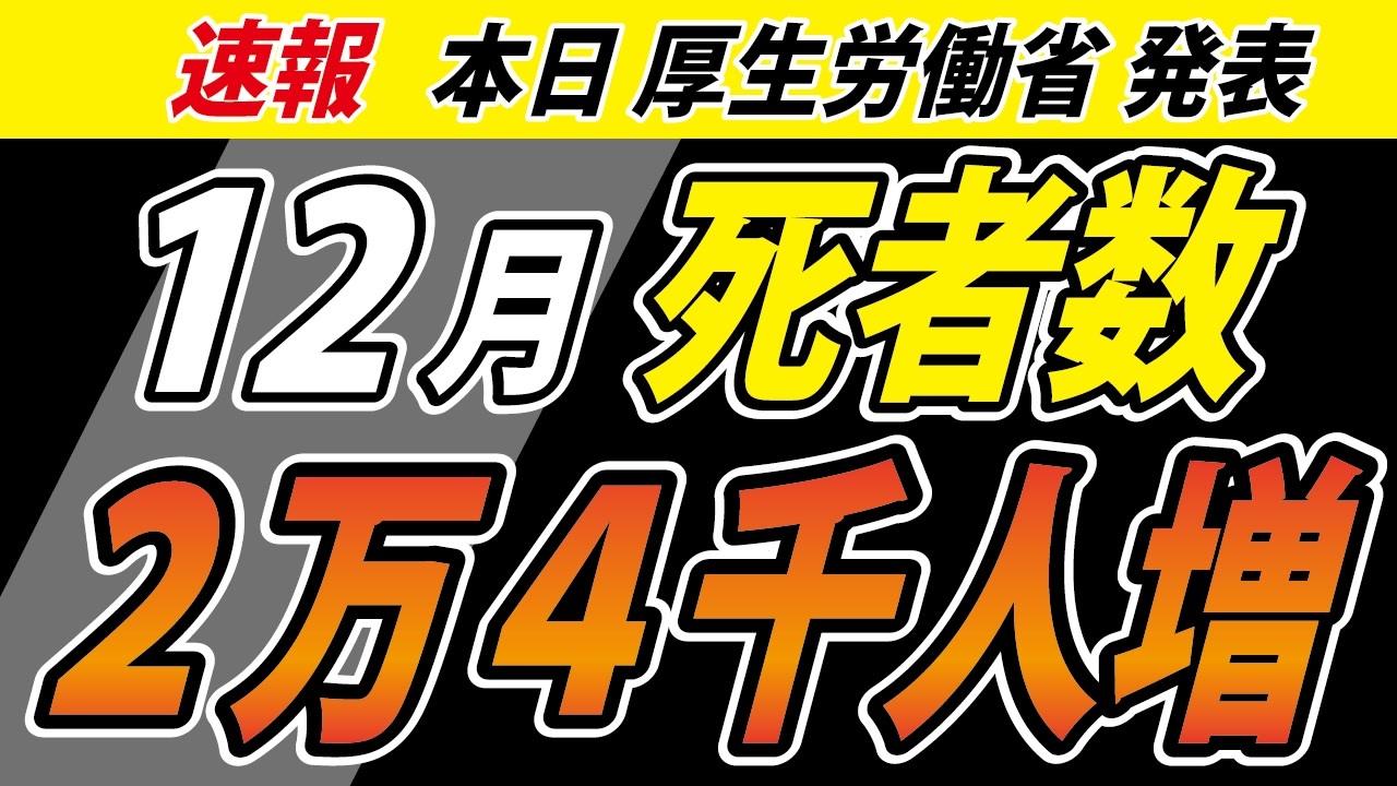 ※この動画は2023年2月28日のライブ配信の一部です。<br>全編はこちら<a href="https://youtube.com/live/DpBtJxmDeMg" target="_blank" rel="noopener nofollow">https://youtube.com/live/DpBtJxmDeMg</a><br><br>❑本日の資料 人口動態統計速報(令和4年12月分)<br><a href="https://www.mhlw.go.jp/toukei/saikin/hw/jinkou/geppo/s2022/12.html" target="_blank" rel="noopener nofollow">https://www.mhlw.go.jp/toukei/saikin/hw/jinkou/geppo/s2022/12.html</a><br><br><br>❑紹介した動画<br>・【死者激増問題】河北新報はどう報じたか?<br><a href="https://youtube.com/live/i4-a8fFWH-g" target="_blank" rel="noopener nofollow">https://youtube.com/live/i4-a8fFWH-g</a><br><br>・うるう年の補足説明<br><a href="https://youtu.be/fQ1bPLS69P0" target="_blank" rel="noopener nofollow">https://youtu.be/fQ1bPLS69P0</a><br><br>・日本人全員消される前に見てください<br><a href="https://youtu.be/613QszZuim4" target="_blank" rel="noopener nofollow">https://youtu.be/613QszZuim4</a><br><br>―――――――――――――――――――――――――――――――<br><br>❑新しい動画サイト「真の日本人増加計画」始めました!<br><a href="https://nicochannel.jp/fujie/" target="_blank" rel="noopener nofollow">https://nicochannel.jp/fujie/</a><br>(ニコニコチャンネル+)<br><br><br>❏藤江の活動を支援していただける方向け<br>【藤江支援口座】のご案内<br>住信SBIネット銀行 ミカン支店(店番号103)<br>口座番号 3107694<br>口座名義 フジエ マサミツ<br><br>――――――――――――――――――――――――――――――<br><br>日本の人口増加を目指す男、藤江です!【メインチャンネル】<br><a href="https://www.youtube.com/c/JINKOUZOUKA/" target="_blank" rel="noopener nofollow">https://www.youtube.com/c/JINKOUZOUKA/</a><br><br>地域と日本の存続のためニ!【藤江2ndチャンネル】<br><a href="https://www.youtube.com/channel/UCfBh4rv5UT7D-qR6KsoZrsA" target="_blank" rel="noopener nofollow">https://www.youtube.com/channel/UCfBh4rv5UT7D-qR6KsoZrsA</a><br><br>今こそ!三千年の底力【藤江3rdチャンネル】<br><a href="https://www.youtube.com/channel/UC5Yrsm8-X8nZj4uKgvE7CBw" target="_blank" rel="noopener nofollow">https://www.youtube.com/channel/UC5Yrsm8-X8nZj4uKgvE7CBw</a><br><br>四海兄弟【藤江4thチャンネル】<br><a href="https://www.youtube.com/channel/UCiyJNO57quj80Ysy7nOABvA" target="_blank" rel="noopener nofollow">https://www.youtube.com/channel/UCiyJNO57quj80Ysy7nOABvA</a><br><br>五穀豊穣【藤江5thチャンネル】<br><a href="https://www.youtube.com/channel/UCptMJCoKYghfew5tDzoEqHQ" target="_blank" rel="noopener nofollow">https://www.youtube.com/channel/UCptMJCoKYghfew5tDzoEqHQ</a><br><br>藤江のTwitter<br><a href="https://twitter.com/JINKOUZOUKA_jp" target="_blank" rel="noopener nofollow">https://twitter.com/JINKOUZOUKA_jp</a><br><br>藤江のニコニコ動画<br><a href="https://www.nicovideo.jp/user/5457748" target="_blank" rel="noopener nofollow">https://www.nicovideo.jp/user/5457748</a>