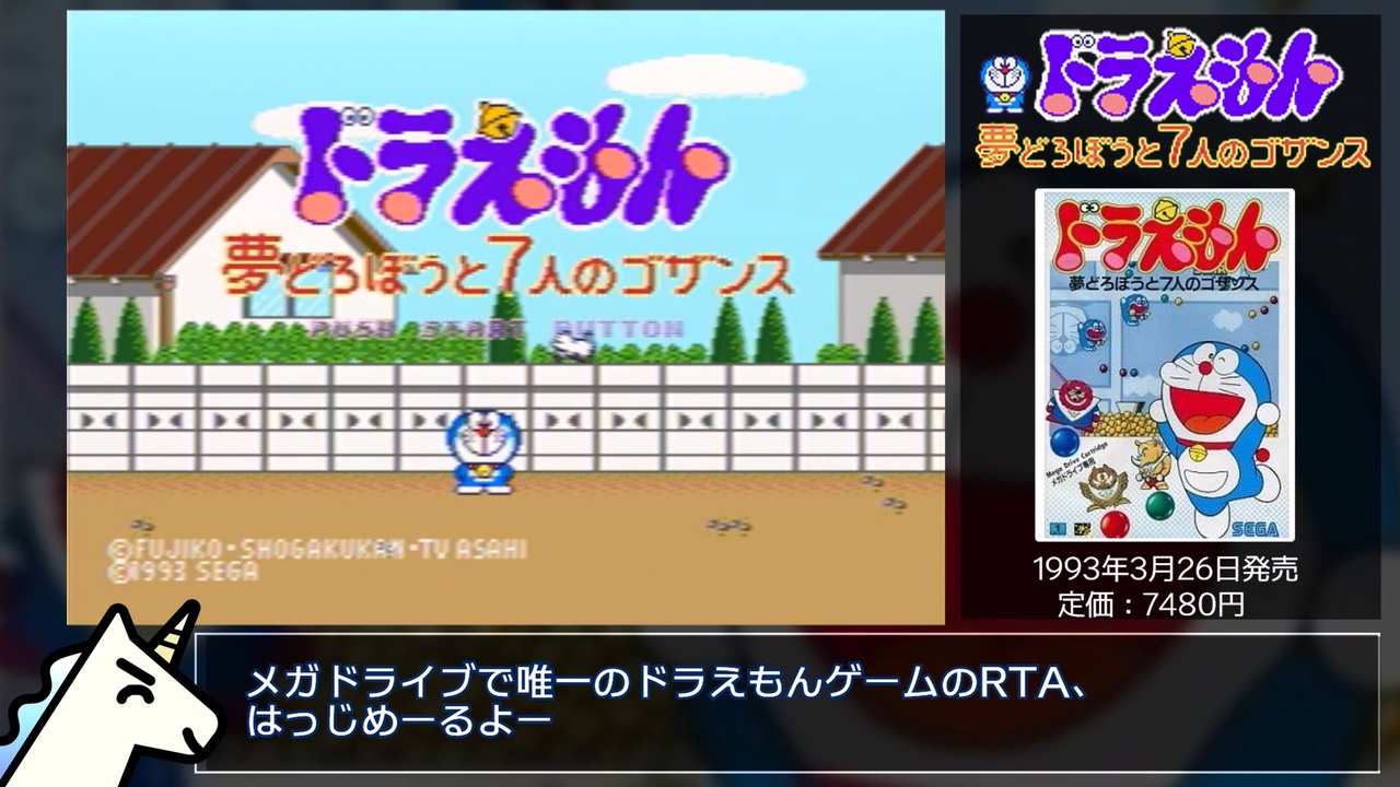 3月6日が誕生日なので生まれ変わったつもりで初投稿です。<br>RTA第8弾は、1993年発売のメガドライブのアクション『ドラえもん 夢どろぼうと7人のゴザンス』です。<br><br>アクションの爽快さはさすがゼガ。<br>ただし難易度の調整が極端すぎる気がしないでもない。<br><br>前作【縛りあり:Kerbal Space Program ムン往還RTA】→<a href="https://www.nicovideo.jp/watch/sm41179857" class="watch">sm41179857</a><br>次作→【GB/ TWIN(ツイン) せんしチャート】→<a href="https://www.nicovideo.jp/watch/sm42048100" class="watch">sm42048100</a>(4/7 21:00公開)<br><br>使用機材:メガドライブ実機(GV-USB2によるコンポジット出力)<br>録画ソフト:N Airによるニコニコ生放送の切り抜き<br><br>走ったRTAのpart.1まとめ→<a href="https://www.nicovideo.jp/mylist/73222388" target="_blank" rel="noopener">mylist/73222388</a><br>RTA全部まとめ→<a href="https://www.nicovideo.jp/mylist/72786007" target="_blank" rel="noopener">mylist/72786007</a><br><br><u>▽チャート&調査結果置き場</u><br><a href="https://drive.google.com/drive/folders/1ZeiWYSfUxOq3PGMEE5cO9HU8-qD6y_4i?usp=sharing" target="_blank" rel="noopener nofollow">https://drive.google.com/drive/folders/1ZeiWYSfUxOq3PGMEE5cO9HU8-qD6y_4i?usp=sharing</a><br><br><u>▽レギュレーション</u><br>ゲームモード:おたのしみゲーム(イージーモード)<br>タイマー開始:『ゲームのようい』画面でスタートを押した瞬間<br>タイマー終了:椅子取りデスマッチに勝利し、地面に着地した瞬間<br>その他:バグは使用不可<br><br><u>▽訂正</u><br>今の所なし……?<br><br>・今までの調査結果や攻略法をまとめた個人wiki(矛盾)を作りました<br><a href="https://w.atwiki.jp/nagisa381rta/" target="_blank" rel="noopener nofollow">https://w.atwiki.jp/nagisa381rta/</a><br><br>・Youtubeでも活動しているのでチャンネル登録よろしくです<br>→<a href="https://www.youtube.com/channel/UCTNItIdl_gYr9N2j0PO-82g" target="_blank" rel="noopener nofollow">https://www.youtube.com/channel/UCTNItIdl_gYr9N2j0PO-82g</a><br><br>・欲しいものリスト<br>→<a href="https://www.amazon.jp/hz/wishlist/ls/1S72L30BVRILK?ref_=wl_share" target="_blank" rel="noopener nofollow">https://www.amazon.jp/hz/wishlist/ls/1S72L30BVRILK?ref_=wl_share</a><br><br>*原作のあるゲームなので、この動画はクリエイター奨励プログラムには登録しません(ギフトも不可にしています)<br><br><a target="_blank" href="https://qa.nicovideo.jp/faq/show/19424?site_domain=default" style="font-size: 13px;color: #657586; text-decoration: underline; line-height: 1.4">この動画は投稿者によって修正されました</a>