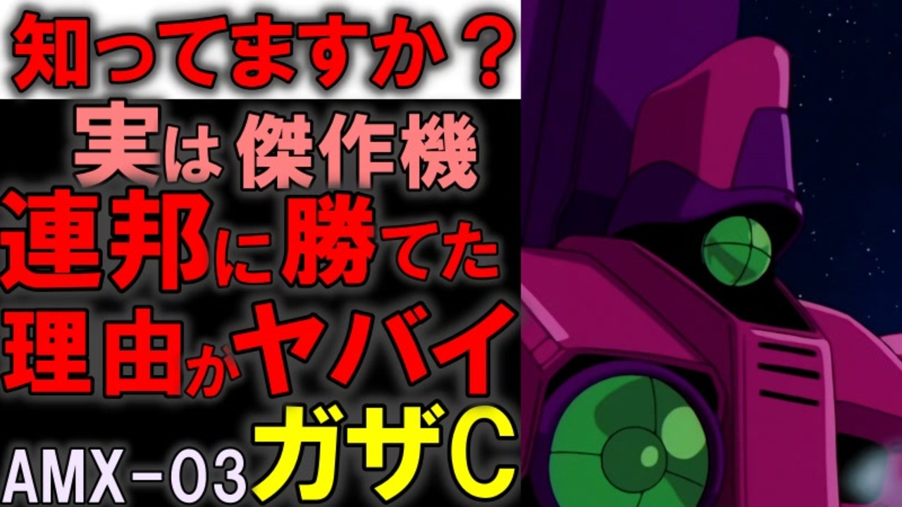 【実は連邦に勝ったMS】AMX-003ガザC。弱い?傑作機?設定を交えながら凄さと弱点を徹底解説【機動戦士ガンダム】<br><br>Zガンダムに登場する可変MS、AMX-003ガザCの設定を解説しながら、その凄さなどを解説、考察する動画です。<br><br>今回は解説と考察が同じくらいです。<br><br>ザクがやりたかった短期決戦、実質連邦降伏的なことをできちゃったのは本当に凄いと思います。<br>でもその後内紛で自滅したのは、1年戦争のコロニー落としでジオンが勝っていても同じようなことが起こったのかなぁと思ったり・・・。<br>百式に撃破されたガザC部隊はベテランだった的な設定をたまに見かけますが、情報元見つけられませんでした。<br><br>質問、などありましたらこちらにも<br><a href="https://twitter.com/@i4S0LHspdgzBTor" target="_blank" rel="noopener nofollow">https://twitter.com/@i4S0LHspdgzBTor</a><br><br>清見元康名義でたいあっぷ、小説家になろう、カクヨムなどに投稿しています。<br>もし良ければ応援お願いしますm(_ _)m<br><a href="https://tieupnovels.com/user/GariGari" target="_blank" rel="noopener nofollow">https://tieupnovels.com/user/GariGari</a><br><a href="https://mypage.syosetu.com/953815/" target="_blank" rel="noopener nofollow">https://mypage.syosetu.com/953815/</a><br><a href="https://kakuyomu.jp/users/GariD/works" target="_blank" rel="noopener nofollow">https://kakuyomu.jp/users/GariD/works</a><br><br>現在の最新作(短編コメディ):<br>何度繰り返してもギロチン送りにされる悪役令嬢は閃いた『敵対する者全員可愛いアイドルにしてしまおう!』アイドルギルドマスターに私はなる!<br><a href="https://ncode.syosetu.com/n2478hi/" target="_blank" rel="noopener nofollow">https://ncode.syosetu.com/n2478hi/</a><br><br>以前の作品(短編シリアス):<br>転生した厄災の大魔女はやがて聖女と呼ばれる<br><a href="https://ncode.syosetu.com/n0827ha/" target="_blank" rel="noopener nofollow">https://ncode.syosetu.com/n0827ha/</a><br><br>A.I.VOICE:結月ゆかり<br>VOICEVOX:ずんだもん<br><br>いつも広告、コメントありがとうございます。<br>励みになりますm(_ _)m<br>