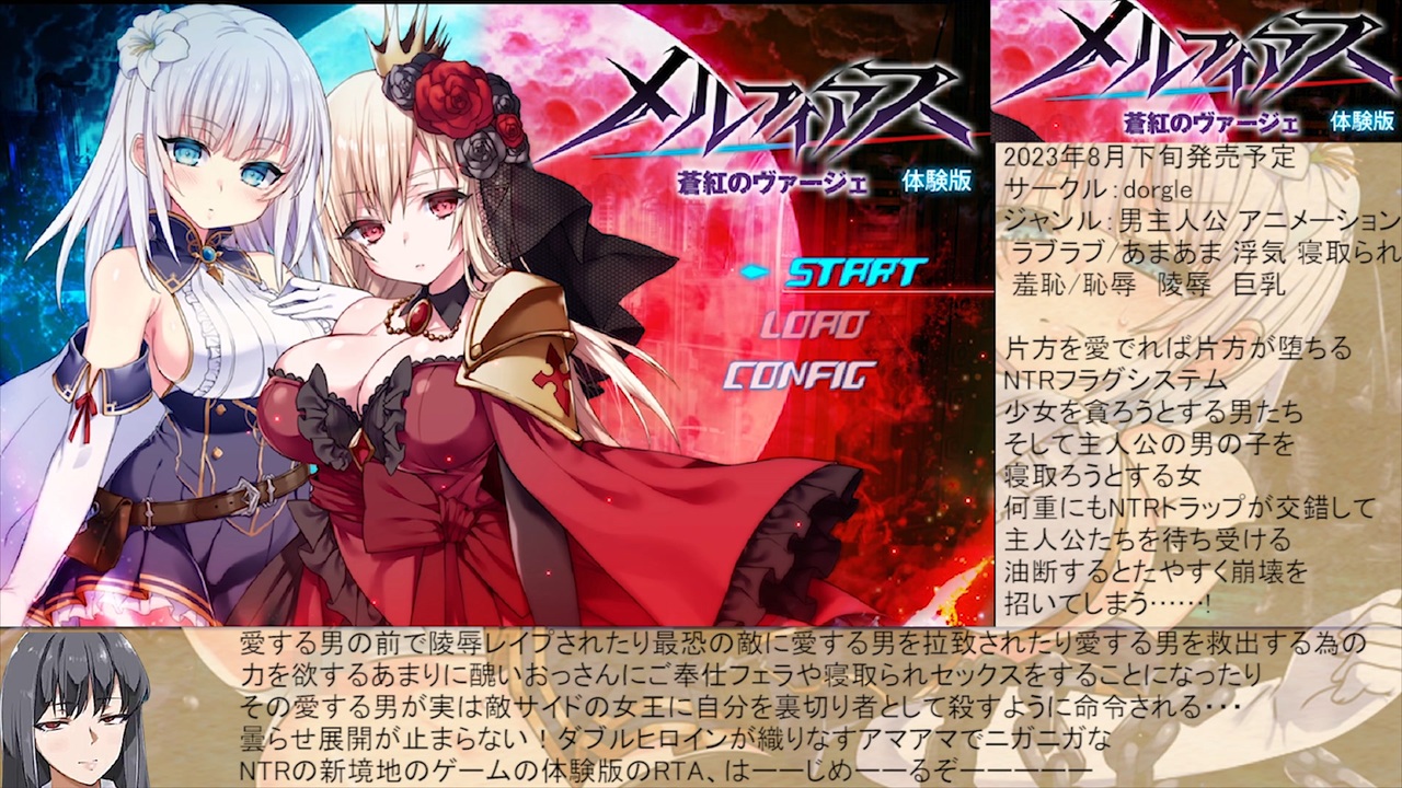 <span style="color: #0000ff; font-size: 24px;">僕が僕である為に~♪<br>シコり続けなきゃならない~♪</span><br><br><br><span style="color: #0000ff; font-size: 18px;">まいどお世話になります!今回もエロゲRTAを走ってしまった<br>んですよwww<br>こんかいは、サークル「dogle」様より6月下旬<br>に発売予定のメルフィアス~蒼紅のヴァージェ~!<br>ちょっと早めかもですが、体験版を走らせて頂きました!<br>ん~!少し動画時間が短くなってしまいましたがよろです!<br>ポメラニアン<br>ハメス・ロドリゲス<br>めちゃめちゃイケてる<br>るふぃ</span><br><br><br><br>ストーリー<br>世界は吸血鬼<ダクリマ>と呼ばれる上位種に支配されていた<br>人間は劣等種として虐げられ、住むところも奪われ、身を寄せ合いながら生きていくしかない<br><br>ダクリマでありながらダクリマを殺す裏切り者のハンター『メルフィ』と、相棒の人間『シズマ』<br>二人はダクリマの女王<クイーン>を倒すために聖都にやってきた<br>ひそかにシズマに心を寄せるメルフィ<br><br>だが聖都では、メルフィのかつての相棒で現在は反ダクリマ勢力の長『グスタフ』が待っていた<br>グスタフはダクリマの心をかき乱し、体を開かせる特殊な能力を持っていた……<br><br><br>Twitter<br>@Duce_Ishizawa