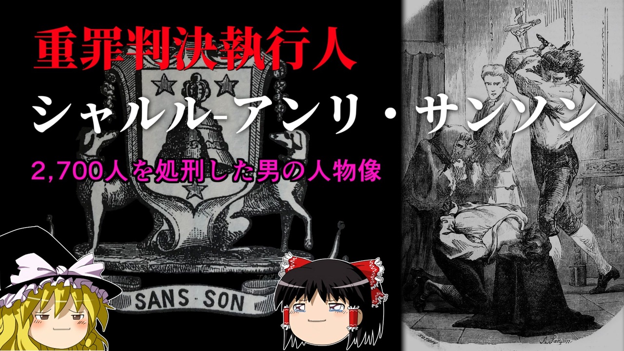 西川秀和先生の翻訳本はBOOTHにて販売↓<br><a href="https://poeta-laureatus.booth.pm/" target="_blank" rel="noopener nofollow">https://poeta-laureatus.booth.pm/</a><br><br>☆特別企画☆<br>今回の参考文献のサンソン関連本のうち、西川秀和先生の訳による2作品は購入特典があります!詳しくは動画内で!<br><br>『回顧録』はPDF版(データダウンロード)、POD版(紙書籍)いずれも対象。<br>『重罪判決執行人』もPDF版、書籍版どちらも対象です。<br><br><br>参考文献:<br>ロジェ・グラール(2023)『重罪判決執行人 サンソン家の系譜』西川秀和訳<br>アンリ-クレマン=サンソン(2021)『サンソン家回顧録』西川秀和訳<br>安達正勝(2003)『死刑執行人サンソン 国王ルイ十六世の首を刎ねた男』集英社<br><br>twitter→<a href="https://twitter.com/Yukkuri_mond" target="_blank" rel="noopener nofollow">https://twitter.com/Yukkuri_mond</a><br />━━━━━━━━━━━━━━━━━━━━━<br><br>この動画はクリエイティブ・コモンズ継承(CC-BY-SA)ライセンスの素材を使用して制作しています。(<a href="https://creativecommons.org/licenses/by-sa/4.0/)" target="_blank" rel="noopener nofollow">https://creativecommons.org/licenses/by-sa/4.0/)</a><br>規約に基づき、この動画もCC-BY-SA 4.0 のもとで公開します。<br><br>投稿者共通情報☆彡<br><br>BGM, SE:ニコニ・コモンズ様<br><a href="http://commons.nicovideo.jp/" target="_blank" rel="noopener nofollow">http://commons.nicovideo.jp/</a><br>魔王魂様<br><a href="https://maoudamashii.jokersounds.com/" target="_blank" rel="noopener nofollow">https://maoudamashii.jokersounds.com/</a><br>Audiostock様<br><a href="https://audiostock.jp/" target="_blank" rel="noopener nofollow">https://audiostock.jp/</a><br><br>立ち絵 霊夢・魔理沙(黒子式):nicotalk様<br><a href="http://www.nicotalk.com/charasozai.html" target="_blank" rel="noopener nofollow">http://www.nicotalk.com/charasozai.html</a><br><br>立ち絵 パトラ、マリー、アン、メアリ:ライフライフ様<br><a href="https://0801lifelife.tumblr.com/" target="_blank" rel="noopener nofollow">https://0801lifelife.tumblr.com/</a><br><br>使用ツール1:ゆっくりムービーメーカー4<br><a href="https://manjubox.net/ymm4/" target="_blank" rel="noopener nofollow">https://manjubox.net/ymm4/</a><br><br>使用ツール2:AviUtl<br><a href="http://spring-fragrance.mints.ne.jp/aviutl/" target="_blank" rel="noopener nofollow">http://spring-fragrance.mints.ne.jp/aviutl/</a><br><br>各時代の地図 : World History Maps & Timelines <br><a href="http://geacron.com/home-en/" target="_blank" rel="noopener nofollow">http://geacron.com/home-en/</a><br><br>ゆっくりボイスについて:AquesTalkライセンス取得済み<br><br>キャラクターボイス<br>アン・ボニー:羽ノ華(A.I.VOICE)<br>メアリ・リード:琴葉 葵(A.I.VOICE)<br>クレオパトラ:結月ゆかり(VOICEROID2)<br>マリー‐アントワネット:東北きりたん (VOICEROID EX)<br>その他キャラ:青山龍星(A.I.VOICE)、伊織弓鶴(A.I.VOICE2)、栗田まろん(A.I.VOICE)、宮舞モカ(VOICEPEAK)、フリモメン(VOICEPEAK)<br><br><br><br>その他フリー素材ご提供元の皆様に圧倒的感謝<br>