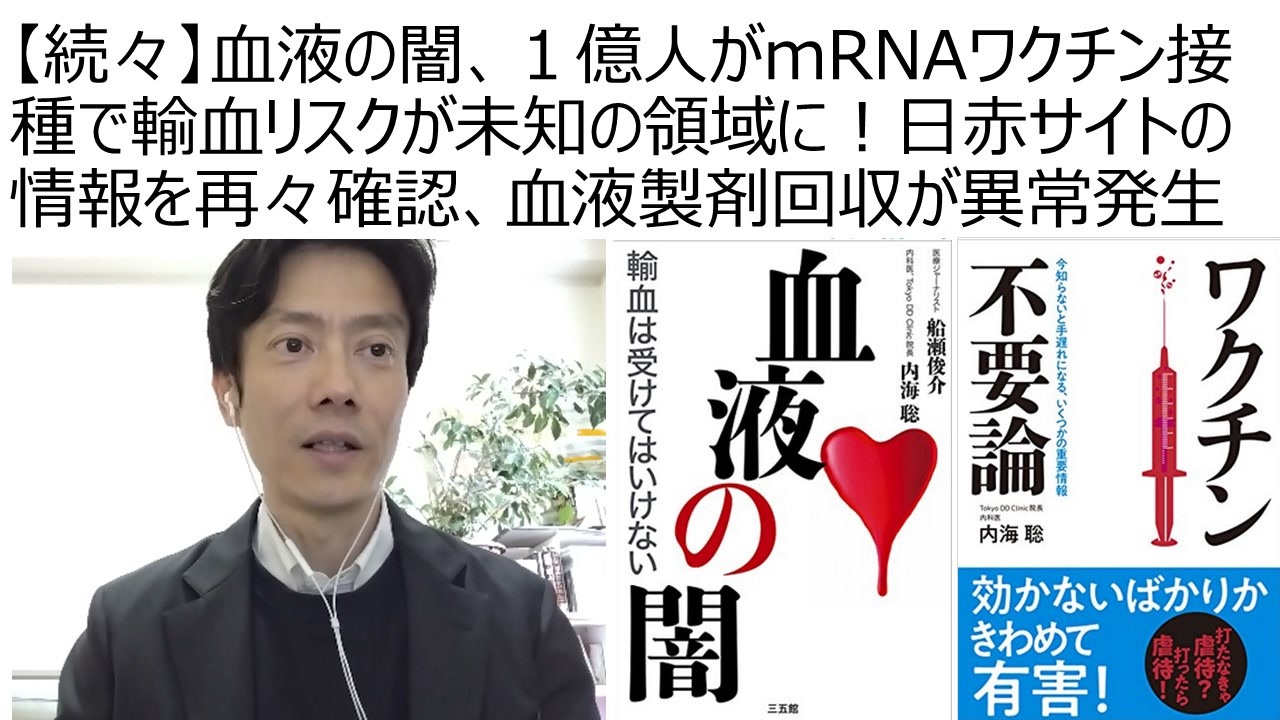 一回目 <a href="https://www.nicovideo.jp/watch/sm41097163" target="_blank" rel="noopener nofollow">https://www.nicovideo.jp/watch/sm41097163</a><br>続 <a href="https://www.nicovideo.jp/watch/sm41375532" target="_blank" rel="noopener nofollow">https://www.nicovideo.jp/watch/sm41375532</a><br>続々 <a href="https://www.nicovideo.jp/watch/sm41885678" target="_blank" rel="noopener nofollow">https://www.nicovideo.jp/watch/sm41885678</a><br>4回目 <a href="https://www.nicovideo.jp/watch/sm41920382" target="_blank" rel="noopener nofollow">https://www.nicovideo.jp/watch/sm41920382</a><br><br>クラス1回収:2018年26件、2019年30件、2020年72件、2021年251件、2022年717件(3/3時点)<br><br>【RNAワクチン(mRNAワクチンを含む)】<br> 接種後48時間を経過していれば献血にご協力いただけます。<br> 例)ファイザー社、モデルナ社 ※オミクロン株対応のワクチンを含む<br>なお、新型コロナウイルスのワクチンに限らず、いずれのワクチン接種において、接種後の症状が残るなど体調の優れない方には、献血を控えていただくほか、アナフィラキシーショックのような重篤な症状を起こした場合は、症状出現後1年間は献血を控えていただくこととしています。<br><a href="https://www.jrc.or.jp/donation/about/refrain/detail_08/" target="_blank" rel="noopener nofollow">https://www.jrc.or.jp/donation/about/refrain/detail_08/</a><br><br>朝日デジタル 新型コロナ理由での回収情報<br><a href="https://www.asahi.com/articles/DA3S15213061.html" target="_blank" rel="noopener nofollow">https://www.asahi.com/articles/DA3S15213061.html</a><br><br>PDMA クラス定義<br><a href="https://www.pmda.go.jp/safety/info-services/drugs/calling-attention/recall-info/0002.html" target="_blank" rel="noopener nofollow">https://www.pmda.go.jp/safety/info-services/drugs/calling-attention/recall-info/0002.html</a><br><br>回収リスト 2022年度クラスI(医薬品)<br><a href="https://www.info.pmda.go.jp/kaisyuu/rcidx22-1m.html" target="_blank" rel="noopener nofollow">https://www.info.pmda.go.jp/kaisyuu/rcidx22-1m.html</a><br><br>藤江さんの動画<br><a href="https://www.nicovideo.jp/watch/sm41878282" target="_blank" rel="noopener nofollow">https://www.nicovideo.jp/watch/sm41878282</a><br><br>日本国独立宣言論 私は独立を宣言する! 真田信秋<br><a href="https://amzn.to/3D90lwx" target="_blank" rel="noopener nofollow">https://amzn.to/3D90lwx</a><br> <br>主権者命令書 主権破壊を許すな 売国傀儡日本政府を解体せよ<br><a href="https://amzn.to/49z51b5" target="_blank" rel="noopener nofollow">https://amzn.to/49z51b5</a><br> <br>マトリックス洗脳社会 グローバル企業ディストピア<br><a href="https://amzn.to/4g2YmZg" target="_blank" rel="noopener nofollow">https://amzn.to/4g2YmZg</a><br><br>メディア廃棄宣言 高橋清隆さん<br><a href="https://amzn.to/3BfdYKg" target="_blank" rel="noopener nofollow">https://amzn.to/3BfdYKg</a>