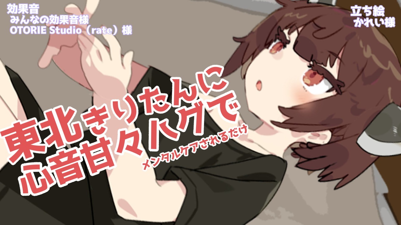 <span style="color: #0000ff;"><strong>健全です。</strong></span><br>きりたんにハグされて心音を聞かされて頭を撫でられる話です。<br><br><span style="color: #3c78d8;">マスター:<br>通勤中に立ち止まる事が増えた。</span><br><br><span style="color: #980000;">きりたん:<br>普段は素っ気ないのに主が病気になると寄ってくる猫っていますよね。<br>それです。</span><br><br><strong>イヤホン・ヘッドホンを推奨します。</strong><br>前回:<a href="https://www.nicovideo.jp/watch/sm41239961" class="watch">sm41239961</a><br>次回:<a href="https://www.nicovideo.jp/watch/sm43874140" class="watch">sm43874140</a><br><br>■声<br>VOICEROID+ 東北きりたんEX<br>■立ち絵 <br>からい(かれい)様作 東北きりたん<br>■効果音<br>みんなの効果音 様 女性の心音vol.1<br><a href="https://www.dlsite.com/maniax/work/=/product_id/RJ433269.html" target="_blank" rel="noopener nofollow">https://www.dlsite.com/maniax/work/=/product_id/RJ433269.html</a><br>OTORIE Studio(rate) 様 フリー効果音素材集Vol.1<br><a href="https://booth.pm/ja/items/3657665" target="_blank" rel="noopener nofollow">https://booth.pm/ja/items/3657665</a>