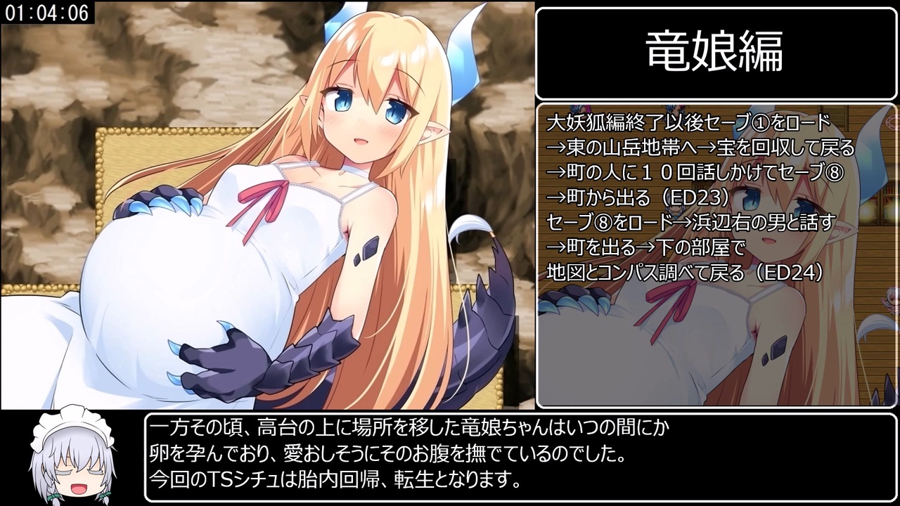 母親の呼び方で思い悩むかわいらしさ<br><br><strong>【茶畑に生えた筍】</strong>様制作のRPG<br><strong>【TS魔物娘島】100%</strong>RTAです。<br><br>レギュレーション<br>エンディング・CGコンプリート<br>CG及びエンディング全開放以外のデバッグ使用可<br><br>計測開始:ニューゲームを選択した瞬間<br>計測終了:最後のエンディング・CGを回収した瞬間<br><br>part1 エルフ編 →<a href="https://www.nicovideo.jp/watch/sm41720220" class="watch">sm41720220</a><br>part2 吸血姫編 →<a href="https://www.nicovideo.jp/watch/sm41749764" class="watch">sm41749764</a><br>part3 アルラウネ編→<a href="https://www.nicovideo.jp/watch/sm41787018" class="watch">sm41787018</a><br>part4 人魚編 →<a href="https://www.nicovideo.jp/watch/sm41806173" class="watch">sm41806173</a><br>part5 猫娘編 →<a href="https://www.nicovideo.jp/watch/sm41825580" class="watch">sm41825580</a><br>part6 大妖狐編 →<a href="https://www.nicovideo.jp/watch/sm41851946" class="watch">sm41851946</a><br>part7 竜娘編 →ここ<br>part8 ハーピー編 →<a href="https://www.nicovideo.jp/watch/sm41928747" class="watch">sm41928747</a><br>part9 淫魔編 →<a href="https://www.nicovideo.jp/watch/sm41968509" class="watch">sm41968509</a><br><br><br>TS魔物娘島RTAマイリスト→<a href="https://www.nicovideo.jp/mylist/74526550" target="_blank" rel="noopener">mylist/74526550</a><br><br>パート1と単発のマイリスト→<a href="https://www.nicovideo.jp/mylist/70659794" target="_blank" rel="noopener">mylist/70659794</a><br><br>いいね欄で本動画で学んだ気付きを語っております<br><br>更新報告twitter:<a href="https://twitter.com/hihidowser" target="_blank" rel="noopener nofollow">https://twitter.com/hihidowser</a><br><br>スマホやタブレット等から見られない方はこちらの動画を参考にすると<br>見られるようになるはずです→ <a href="https://www.nicovideo.jp/watch/sm38575952" class="watch">sm38575952</a><br><br><strong>[TS魔物娘島]の購入は下記サイトにて!<br>DLsite(PC):</strong>ttps://www.dlsite.com/maniax/work/=/product_id/RJ354175.html<br><br><strong>作者様twitter:</strong><a href="https://twitter.com/igasenpuki" target="_blank" rel="noopener nofollow">https://twitter.com/igasenpuki</a><br><br>ゲームアツマール体験版→<a href="https://game.nicovideo.jp/atsumaru/games/gm24715" target="_blank" rel="noopener nofollow">https://game.nicovideo.jp/atsumaru/games/gm24715</a><br>