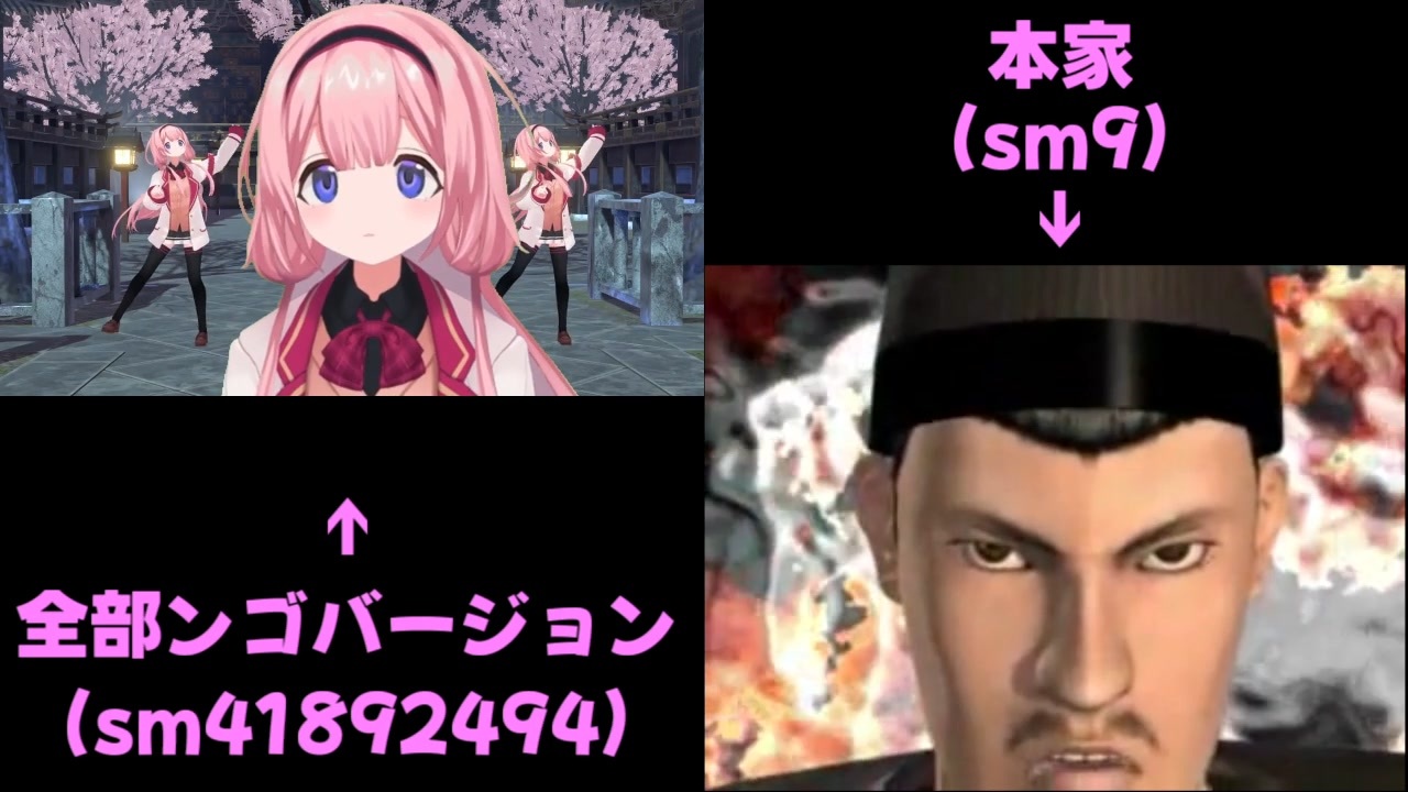 比較したくなっちゃったので、作りました。<br>音を左右に振っているので、イヤホンorヘッドホン推奨です。<br>怒られたら消します。<br><br>全部ンゴバージョン<br> <a href="https://www.nicovideo.jp/watch/sm41892494" class="watch">sm41892494</a><br><br>本家<br> <a href="https://www.nicovideo.jp/watch/sm9" class="watch">sm9</a><br><br>再現動画が流れたンゴちゃんの誕生日会配信<br> 【周央サンゴ3Dライブ】 #周央サンゴ生まれたンゴねぇ2023 【にじさんじ/周央サンゴ】<br> <a href="https://www.youtube.com/live/Si-tO-oN4qg" target="_blank" rel="noopener nofollow">https://www.youtube.com/live/Si-tO-oN4qg</a><br>_______________________________________<br><br>これを見ているかもしれないンゴちゃんへ<br><br>ニコニコに投稿されている動画(<a href="https://www.nicovideo.jp/watch/sm41892494" class="watch">sm41892494</a>)のタグがロックされていません。<br>ニコニコの仕様上、ランキングになっているタグを投稿時につけるor投稿後に付けてタグロックしないと、そのタグのランキングに載りません。<br>ぜひ「にじさんじ」と「周央サンゴ」のタグだけでも、タグロックすることをオススメします。<br><br>タグロックのやり方↓<br><a href="https://twitter.com/Vtuber_niconico/status/1529379153136431105?s=20" target="_blank" rel="noopener nofollow">https://twitter.com/Vtuber_niconico/status/1529379153136431105?s=20</a><br><br>お節介ですいません。<br>誕生日おめでとうございました。<br><br>_______________________<br>2023/3/8 追記<br><br>タグロックされたようで、にじさんじと周央サンゴのランキングにも掲載されるようになりました。<br>よかった。