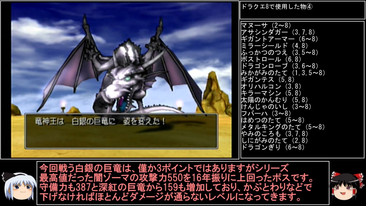 サムネで白銀の巨竜と黄金の巨竜を融合させて白金の巨竜を作ろうとしたんですが、上手く合成できず諦めました。巨竜のモーションって同期してるかと思ったんですけど、戦闘開始してからの身体の揺れ方って微妙に違うんだなという、本当にどうでもいい新たな発見です。<br><br>前→<a href="https://www.nicovideo.jp/watch/sm41889987" class="watch">sm41889987</a> 次→<a href="https://www.nicovideo.jp/watch/sm41923394" class="watch">sm41923394</a><br><br>YouTube版→<a href="https://youtu.be/sNt3vnhwyE4" target="_blank" rel="noopener nofollow">https://youtu.be/sNt3vnhwyE4</a><br><br><br>※動画の大きさが変わる方は、お手数ですが設定→画質を自動から〇pに変えると解決します。<br>※一部機種は互換機を使用してのプレイとなります。<br><br>縛りルール(不明点はシリーズのQ&Aを参照)<br>①使った武器・防具・装飾品・道具・呪文・特技・一部特殊施設(メダル王・カジノ・移民の町)・職業(3,6,7)・仲間モンスター(4,5,6,8+7の職業)は次以降のシリーズで使用禁止。<br>(NPCキャラが使用した装備や呪文を含む。売却及び錬金素材としても使用扱い)<br><br>②裏技・バグ技の禁止。<br><br>③逃走禁止&戦闘終了時は全員生存。<br><br>④レベルを上げ過ぎない。<br>ダンジョンやボスは公式ガイドブックに記載されたレベル+3まで。<br>ラスボスは全ての呪文を習得するレベル+3程度までに収める。<br><br>⑤裏ボスも規定回数、規定ターン以内に倒す。<br>(6の裏ダンジョン突入時のみ、条件を満たすため①の職業を解禁)<br><br>(おまけ)<br>宝は可能なものに限り全回収。<br>5と6は同一モンスターの仲間不可。<br>回避可能なボスも全て倒す。<br><br><br>この動画で利用している株式会社スクウェア・エニックスを代表とする共同著作者が権利を所有する著作物及びスギヤマ工房有限会社が権利を所有する楽曲の転載・配布は禁止いたします。<br>(C) ARMOR PROJECT/BIRD STUDIO/SQUARE ENIX All Rights Reserved.<br>(C) SUGIYAMA KOBO (P) SUGIYAMA KOBO<br><br>AquesTalk2ライセンスID:AQTK2WINUSR23122185<br /><br><br>❤いいねを押していただけるとモチベーションと投稿速度が上がるので宜しくお願い致します!<br><br>作者ツイッター→ <a href="https://twitter.com/nig0117" target="_blank" rel="noopener nofollow">https://twitter.com/nig0117</a><br>PIXIV FANBOX→ <a href="https://sutanokeiji.fanbox.cc/" target="_blank" rel="noopener nofollow">https://sutanokeiji.fanbox.cc/</a><br><br>( 以前はWEB小説書いてました→ <a href="https://kakuyomu.jp/works/1177354054884910267" target="_blank" rel="noopener nofollow">https://kakuyomu.jp/works/1177354054884910267</a> )