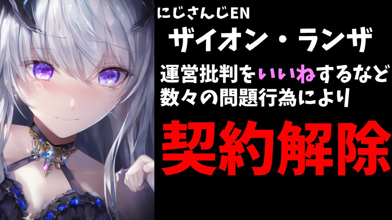 日本時間2023年3月10日午後8時1分(ワシントンなどは午前6時頃)、にじさんじEN公式ツイッターより所属VTuberのZaion LanZa (ランザー 罪恩) さんの契約解除が発表されました。<br><br>前回の動画<br>【速報】にじさんじの新人が度重なる不祥事により活動休止<br><a href="https://www.nicovideo.jp/watch/sm41768125" class="watch">sm41768125</a><br><br>引用<br><a href="https://twitter.com/NIJISANJI_World/status/1634147534795841536" target="_blank" rel="noopener nofollow">https://twitter.com/NIJISANJI_World/status/1634147534795841536</a><br><br>Youtube <a href="https://www.youtube.com/@V_Virgin_Mary" target="_blank" rel="noopener nofollow">https://www.youtube.com/@V_Virgin_Mary</a><br>twitter <a href="https://twitter.com/V_Virgin_Mary" target="_blank" rel="noopener nofollow">https://twitter.com/V_Virgin_Mary</a><br><br>使用素材<br>高品質なフリー動画素材 - Pixabay <a href="https://pixabay.com/ja/videos" target="_blank" rel="noopener nofollow">https://pixabay.com/ja/videos</a>