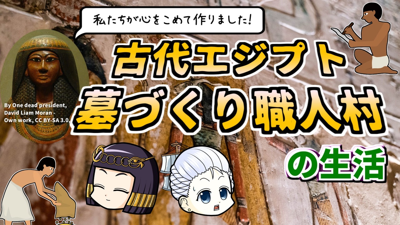 マリーちゃんはロマンに心を躍らせているようです。<br><br>古代エジプト・新王国の王家の谷のほど近くで発見された遺跡、デイル・エル・メディナ。<br>そのたくさんのお墓の中からは、当時の人たちの生活のようすがうかがえる遺物がたくさん見つかったのでした。<br><br>今回の参考文献:<br>モーリス・L・ビルブライヤー(1989)『王の墓づくりびと』酒井太傅六訳 学生社<br>ドナルド・P・ライアン(2022)『古代エジプトの日常生活』田口未知訳 書房<br>その他 Wikipediaなど<br><br>twitter→<a href="https://twitter.com/mond_historica" target="_blank" rel="noopener nofollow">https://twitter.com/mond_historica</a><br />━━━━━━━━━━━━━━━━━━━━━<br><br>この動画はクリエイティブ・コモンズ継承(CC-BY-SA)ライセンスの素材を使用して制作しています。(<a href="https://creativecommons.org/licenses/by-sa/4.0/)" target="_blank" rel="noopener nofollow">https://creativecommons.org/licenses/by-sa/4.0/)</a><br>規約に基づき、この動画もCC-BY-SA 4.0 のもとで公開します。<br><br>投稿者共通情報☆彡<br><br>BGM, SE:ニコニ・コモンズ様<br><a href="http://commons.nicovideo.jp/" target="_blank" rel="noopener nofollow">http://commons.nicovideo.jp/</a><br>魔王魂様<br><a href="https://maoudamashii.jokersounds.com/" target="_blank" rel="noopener nofollow">https://maoudamashii.jokersounds.com/</a><br>Audiostock様<br><a href="https://audiostock.jp/" target="_blank" rel="noopener nofollow">https://audiostock.jp/</a><br><br>立ち絵 霊夢・魔理沙(黒子式):nicotalk様<br><a href="http://www.nicotalk.com/charasozai.html" target="_blank" rel="noopener nofollow">http://www.nicotalk.com/charasozai.html</a><br><br>立ち絵 パトラ、マリー、アン、メアリ:ライフライフ様<br><a href="https://0801lifelife.tumblr.com/" target="_blank" rel="noopener nofollow">https://0801lifelife.tumblr.com/</a><br><br>使用ツール1:ゆっくりムービーメーカー4<br><a href="https://manjubox.net/ymm4/" target="_blank" rel="noopener nofollow">https://manjubox.net/ymm4/</a><br><br>使用ツール2:AviUtl<br><a href="http://spring-fragrance.mints.ne.jp/aviutl/" target="_blank" rel="noopener nofollow">http://spring-fragrance.mints.ne.jp/aviutl/</a><br><br>各時代の地図 : World History Maps & Timelines <br><a href="http://geacron.com/home-en/" target="_blank" rel="noopener nofollow">http://geacron.com/home-en/</a><br><br>ゆっくりボイスについて:AquesTalkライセンス取得済み<br><br>キャラクターボイス<br>アン・ボニー:羽ノ華(A.I.VOICE)<br>メアリ・リード:琴葉 葵(A.I.VOICE)<br>クレオパトラ:結月ゆかり(VOICEROID2)<br>マリー‐アントワネット:東北きりたん (VOICEROID EX)<br>その他キャラ:青山龍星(A.I.VOICE)、伊織弓鶴(A.I.VOICE2)、栗田まろん(A.I.VOICE)、宮舞モカ(VOICEPEAK)、フリモメン(VOICEPEAK)<br><br><br><br>その他フリー素材ご提供元の皆様に圧倒的感謝<br>