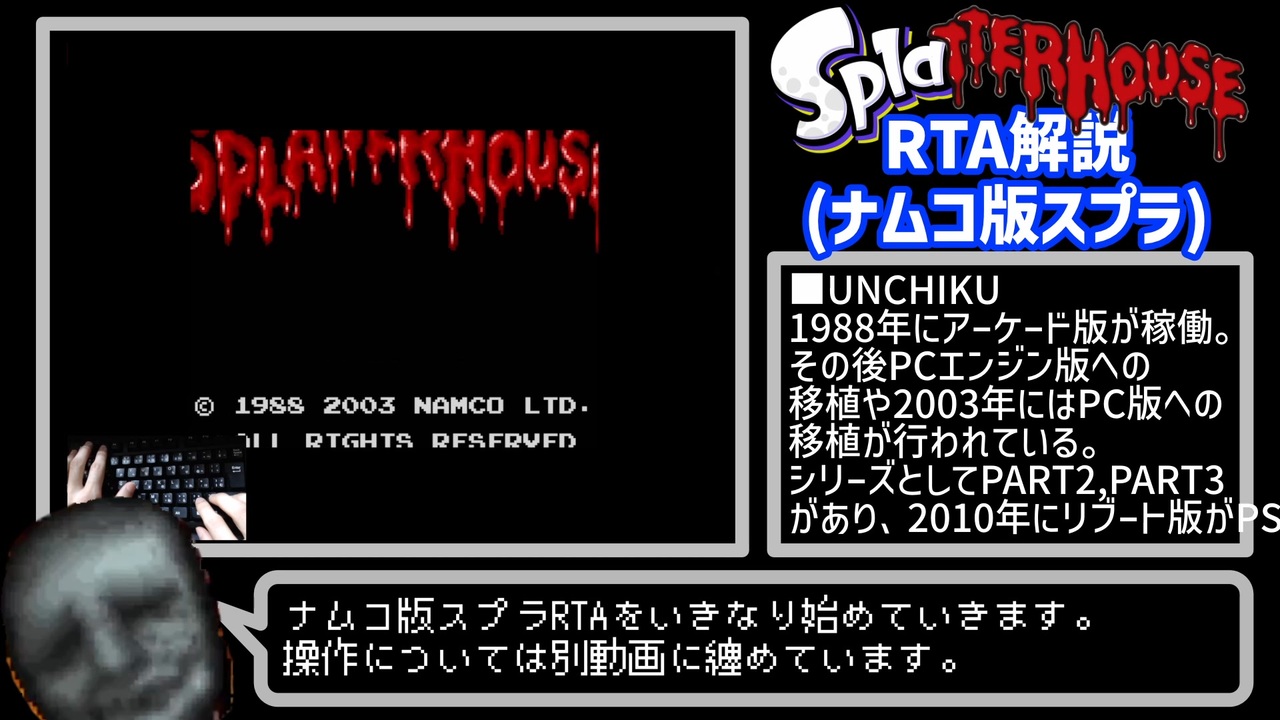 ■お知らせ<br> 8/11(金) 22:40ごろ~ RTA in Japan Summer 2023にて、ナムコ版スプラ1のRTAを<br> 走らさせて頂きました。アーカイブはこちらです(コメントあり)<br><a href="https://www.twitch.tv/videos/1896128243?collection=IBFyAIG7ehfFtQ" target="_blank" rel="noopener nofollow">https://www.twitch.tv/videos/1896128243?collection=IBFyAIG7ehfFtQ</a><br><br>-------------定型文---------------<br>YouTubeを主体に活動しています。<br>よろしければそちらのご視聴もお願いいたします。<br><a href="https://www.youtube.com/@hamatet" target="_blank" rel="noopener nofollow">https://www.youtube.com/@hamatet</a><br>-------------定型文おわり---------------<br><br>■本動画の宣伝、ありがとうございます!('24/04/12時点)<br>---------------------<br>はやすぃ様 ぐんらん様 ソードマスター様 K!!様<br>春巻様 時の君様 inuneko様 <a href="https://www.nicovideo.jp/watch/sm13869948" class="watch">sm13869948</a>様<br>yakata様 hoge様 どっかの忍者隊員様 もけけ様<br>ザナドゥ様 raddy様 有名夕張メロン様 P.B.様<br>オッホー・アヘアヘ様 kuro様 shuzie様 fuha様<br>yoppy31様 にやとー様 PULL様 SENNOU様<br>はんてん様 SpeedyBARON様 えっきゅう様<br>---------------------<br><br>基本操作の解説動画はこちら⇒<a href="https://youtu.be/gWazKYbDS2c" target="_blank" rel="noopener nofollow">https://youtu.be/gWazKYbDS2c</a><br><br>Windows PC版スプラッターハウスのRTA解説動画を作成しました。<br>ランダム要素は(きっと)少ないので、走りやすい(はず)です。<br>ピギーマンは"PIGGY MAN"と思っていましたが、"BIGGY MAN"が正解の様です。<br><br>スプラッターハウス系の一覧はこちら↓<br><a href="https://www.nicovideo.jp/series/366575" target="_blank" rel="noopener">series/366575</a><br><br>PC版のメリットは以下のとおりです。<br>・キーボードでプレイできるため、正確な操作が可能<br>・難易度Easy(体力6)が選べる<br>・無限コンティニュー