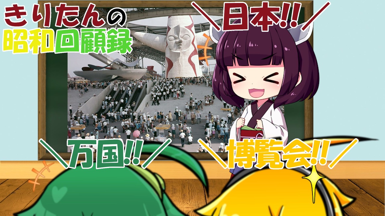 <strong>ようこそ! 昭和回顧録へ!</strong><br><br>昭和45年、始まります!<br>大きなイベントというのは時代の節目になることも多いですが、それが完全な成功に終わることはそれほど多くないように思います。ですが実際、こんなに成功したものもあるんだなーと今回改めて思いました。<br><br>では、ごゆっくりとお楽しみください!<br><br><a href="https://www.nicovideo.jp/watch/sm41841213" class="watch">sm41841213</a> ← 前 次 → <a href="https://www.nicovideo.jp/watch/sm42047639" class="watch">sm42047639</a><br>回顧目録 → <a href="https://www.nicovideo.jp/mylist/70366107" target="_blank" rel="noopener">mylist/70366107</a><br>YouTube版 → <a href="https://youtu.be/73D5642iE90" target="_blank" rel="noopener nofollow">https://youtu.be/73D5642iE90</a><br><br>シリーズ一話マイリスト →<span style="color: #006699;"> <a href="https://www.nicovideo.jp/mylist/69322831" target="_blank" rel="noopener">mylist/69322831</a></span><br>試作品マイリスト → <a href="https://www.nicovideo.jp/mylist/69322827" target="_blank" rel="noopener">mylist/69322827</a><br><br>更新情報とか質問とかツイッター → <a href="https://twitter.com/suzakatsuki " target="_blank" rel="noopener nofollow">https://twitter.com/suzakatsuki </a><br><br>~お借りしたもの~<br>キャスト:東北きりたん、東北ずん子、弦巻マキ<br>立ち絵:blueberry様(SD東北きりたん他)、りんどう様(ボイロミニキャラ後ろ姿素材)<br>背景:Pixabay様<br>小物類:写真AC様<br> イラストAC様<br> 万博記念公園様 <a href="https://www.expo70-park.jp/" target="_blank" rel="noopener nofollow">https://www.expo70-park.jp/</a><br>BGM:こんとどぅふぇ HiLi様<br> OP ほいっぷ!インストゥルメンタル<br> BGM 散歩道、ひとりぼっちの妖精-キミ-、お昼寝まくら、ボクの旅立ち、わんわんといっしょ、シーサイドクッキー、ゲンゲンゲンキだもん<br>効果音:魔王魂様<br> On-Jin ~音人~様<br><br>※リンク情報などは、マイリストの説明欄にて補足しています。