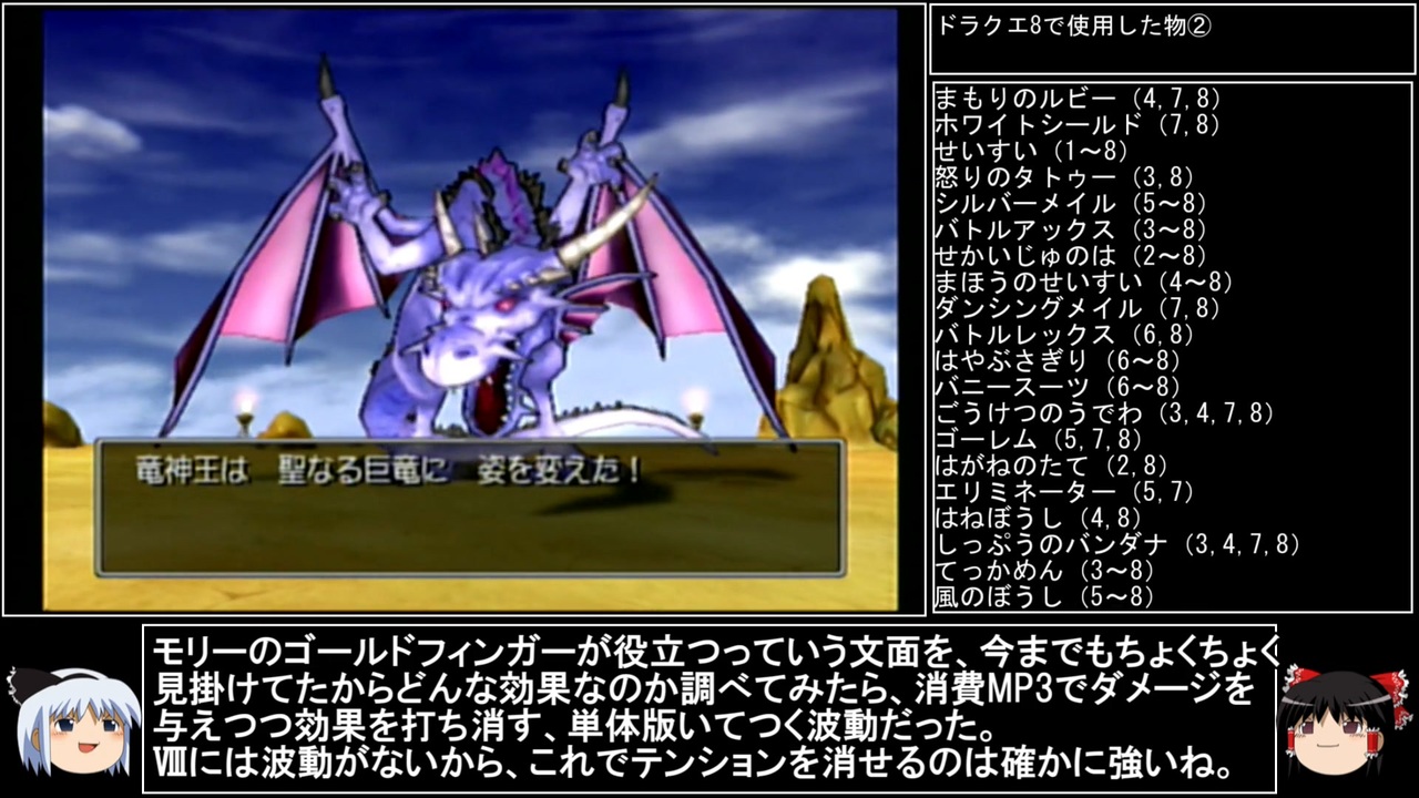 竜の試練の前哨戦もいよいよラスト!<br>そしてコメント返しのコーナーも次回でラストです。終わりの時が近いですね。<br><br><br>前→<a href="https://www.nicovideo.jp/watch/sm41923394" class="watch">sm41923394</a> 次→<a href="https://www.nicovideo.jp/watch/sm41960420" class="watch">sm41960420</a><br><br>YouTube版→<a href="https://youtu.be/weJ6_Zxt7Fg" target="_blank" rel="noopener nofollow">https://youtu.be/weJ6_Zxt7Fg</a><br><br><br>※動画の大きさが変わる方は、お手数ですが設定→画質を自動から〇pに変えると解決します。<br>※一部機種は互換機を使用してのプレイとなります。<br><br>縛りルール(不明点はシリーズのQ&Aを参照)<br>①使った武器・防具・装飾品・道具・呪文・特技・一部特殊施設(メダル王・カジノ・移民の町)・職業(3,6,7)・仲間モンスター(4,5,6,8+7の職業)は次以降のシリーズで使用禁止。<br>(NPCキャラが使用した装備や呪文を含む。売却及び錬金素材としても使用扱い)<br><br>②裏技・バグ技の禁止。<br><br>③逃走禁止&戦闘終了時は全員生存。<br><br>④レベルを上げ過ぎない。<br>ダンジョンやボスは公式ガイドブックに記載されたレベル+3まで。<br>ラスボスは全ての呪文を習得するレベル+3程度までに収める。<br><br>⑤裏ボスも規定回数、規定ターン以内に倒す。<br>(6の裏ダンジョン突入時のみ、条件を満たすため①の職業を解禁)<br><br>(おまけ)<br>宝は可能なものに限り全回収。<br>5と6は同一モンスターの仲間不可。<br>回避可能なボスも全て倒す。<br><br><br>この動画で利用している株式会社スクウェア・エニックスを代表とする共同著作者が権利を所有する著作物及びスギヤマ工房有限会社が権利を所有する楽曲の転載・配布は禁止いたします。<br>(C) ARMOR PROJECT/BIRD STUDIO/SQUARE ENIX All Rights Reserved.<br>(C) SUGIYAMA KOBO (P) SUGIYAMA KOBO<br><br>AquesTalk2ライセンスID:AQTK2WINUSR23122185<br /><br><br>❤いいねを押していただけるとモチベーションと投稿速度が上がるので宜しくお願い致します!<br><br>作者ツイッター→ <a href="https://twitter.com/nig0117" target="_blank" rel="noopener nofollow">https://twitter.com/nig0117</a><br>PIXIV FANBOX→ <a href="https://sutanokeiji.fanbox.cc/" target="_blank" rel="noopener nofollow">https://sutanokeiji.fanbox.cc/</a><br><br>( 以前はWEB小説書いてました→ <a href="https://kakuyomu.jp/works/1177354054884910267" target="_blank" rel="noopener nofollow">https://kakuyomu.jp/works/1177354054884910267</a> )