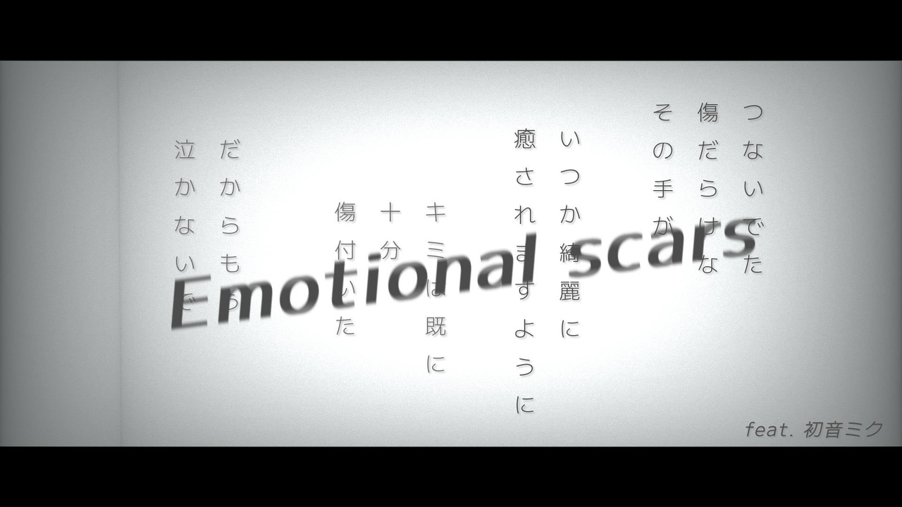 ダウンロード/ストリーミング配信はこちら <a href="https://big-up.style/7wfSRA4Suo" target="_blank" rel="noopener nofollow">https://big-up.style/7wfSRA4Suo</a><br><br>Tatsu_Pです。<br><br>ボカコレ2023春、やってきました!<br>Tatsu_Pは初回ボカコレから皆勤継続中、今回も達成出来ました。<br><br>今回の曲は「Emotional scars」というタイトルになりました。<br><br>■歌ってみた用のオフボーカルはこちら→<a href="https://piapro.jp/t/Tq1c" target="_blank" rel="noopener nofollow">https://piapro.jp/t/Tq1c</a><br>■前作 Sleet / Tatsu_P feat.初音ミク →<a href="https://www.nicovideo.jp/watch/sm41463954" target="_blank" rel="noopener nofollow">https://www.nicovideo.jp/watch/sm41463954</a><br><br><br>とても明るいんだけど切ない…<br>大丈夫じゃないのに、「大丈夫だよ」ってその場をしのいでしまうような感覚…<br>そんな曲になっています。<br><br>また、意図して、あえて初音ミクが登場しないMVになっています。<br>文字だけの方が伝わるかな、と思いそうしてみました。<br><br>是非、コメントで感想教えて下さいね。<br><br><br><span style="font-size: 18px;"><strong>コメント何していいか分からなかったら、ギターソロのところで「Tatsu_Pー!」と書いて下さい。w</strong></span><br><br><br>歌詞↓<br><br>薄れゆく 意識の中で 垣間見た景色は<br>幼き 私をもてあそび 切り裂いたビジョン<br><br>胸の 奥に 深く<br>突き刺さってるナイフ<br>今も ふとした時<br>私を襲う<br><br>つないでた 傷だらけな その手が<br>いつか 綺麗に 癒されますように<br>キミは既に 十分 傷付いた<br>だからもう 泣かないで<br><br>力が欲しいと 願っても<br>叶う事は無かった<br><br>胸の 奥に 深く<br>突き刺さってるナイフ<br>これからの未来も<br>抜ける事はない<br><br>理不尽に 傷だらけな その心が<br>いつか 綺麗に 癒されますように<br>キミは既に 十分 傷付いた<br>だからもう 泣きやんで<br><br>つないでた 傷だらけな その手が<br>いつか 誰かを 救いだすでしょう<br>キミは既に 十分 苦しんだ<br>だからもう 笑っていて<br><br /><br><strong><u>■Tatsu_Pのボカロ曲集</u></strong><br>ニコニコ動画→ <a href="https://www.nicovideo.jp/series/35732" target="_blank" rel="noopener nofollow">https://www.nicovideo.jp/series/35732</a><br>youtube→ <a href="https://www.youtube.com/playlist?list=PLWG2YmUkSvboMHRtqFlmIBrVT29DiXqyW" target="_blank" rel="noopener nofollow">https://www.youtube.com/playlist?list=PLWG2YmUkSvboMHRtqFlmIBrVT29DiXqyW</a><br><br><strong><u>■Tatsu_Pのクリエイター活動を応援して下さるサポーター様を募集中です!</u></strong><br>月額330円で、Tatsu_Pの音楽活動を応援して下さい!詳しくは<br>→ <a href="https://creator-support.nicovideo.jp/registration/15328285" target="_blank" rel="noopener nofollow">https://creator-support.nicovideo.jp/registration/15328285</a><br><br><strong><u>■Tatsu_P 二次創作ガイドライン</u></strong><br>歌ってみた等の二次創作、大歓迎です!詳しくは<br>→ <a href="https://commons.nicovideo.jp/material/nc273560" target="_blank" rel="noopener nofollow">https://commons.nicovideo.jp/material/nc273560</a><br><br><strong><u>■Twitter(X)</u></strong><br>→ <a href="https://twitter.com/tatsuya_p_" target="_blank" rel="noopener nofollow">https://twitter.com/tatsuya_p_</a><br><br><strong><u>■サブスク</u></strong><br>AppleMusic、Spotify、LINEMUSIC等はこちら<br><strong>→ </strong><a href="https://big-up.style/artists/292334" target="_blank" rel="noopener nofollow">https://big-up.style/artists/292334</a><br><br><strong><u>■楽曲制作、楽曲提供、歌ってみたのMIXやオケ制作等、その他音楽案件のご依頼はこちら</u></strong><br>→ <a href="https://ssl.form-mailer.jp/fms/16584e52782886" target="_blank" rel="noopener nofollow">https://ssl.form-mailer.jp/fms/16584e52782886</a>
