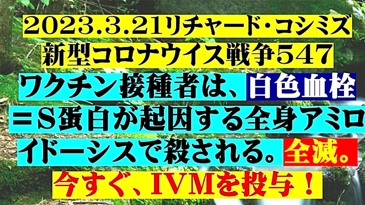 <span style="color: #cc4125;"><strong>「 テーマ : 新型コロナウイルス戦争 547 」</strong></span><br><br><span style="color: #ff0000;"><strong>「『 ワクチン接種者 』は、『 白色血栓 = スパイク蛋白が起因する全身アミロイドーシス 』で殺される。<br> 『 全滅 』。今すぐ、『 イベルメクチン 』を『 投与 』! 」</strong></span><br><br><span style="color: #0000ff;"><strong>「『 イベルメクチン・アビガン・その他コロナ対策 』について、ご意見をお寄せ下さい! 」<br><br>◐ E-mail:richardkoshimizu@gmail.com</strong></span><br><br><strong>◐「クリエイター・サポート」・「ニコニ広告」・「フォロー」等、ご協力の程宜しくお願い致します。RK</strong><br><br><span style="color: #38761d;"><strong>◐ リチャード・コシミズ 講演会 公式 動画ギャラリー</strong></span><br> <a href="http://www.t-sskk.com/richardkoshimizu/video-gallery/index.html" target="_blank" rel="noopener nofollow">http://www.t-sskk.com/richardkoshimizu/video-gallery/index.html</a><br><br><span style="color: #38761d;"><strong>◐ リチャード・コシミズ 講演会 「 ニコニコ生放送『 LIVE 』」</strong></span><br> <a href="https://bit.ly/3Bx8F5w" target="_blank" rel="noopener nofollow">https://bit.ly/3Bx8F5w</a><br><br><span style="color: #38761d;"><strong>◐ リチャード・コシミズ 公式 ブログ</strong></span><br> <a href="http://08054623210.jugem.jp/" target="_blank" rel="noopener nofollow">http://08054623210.jugem.jp/</a><br><br><span style="color: #38761d;"><strong>◐ リチャード・コシミズ 公式 ホームページ<br> </strong></span><a href="http://richardkoshimizu.boo.jp/" target="_blank" rel="noopener nofollow">http://richardkoshimizu.boo.jp/</a><br><br><span style="color: #38761d;"><strong>◐ リチャード・コシミズ 公式 Twitter</strong></span><br> <a href="https://twitter.com/rickoshimizu" target="_blank" rel="noopener nofollow">https://twitter.com/rickoshimizu</a><br>