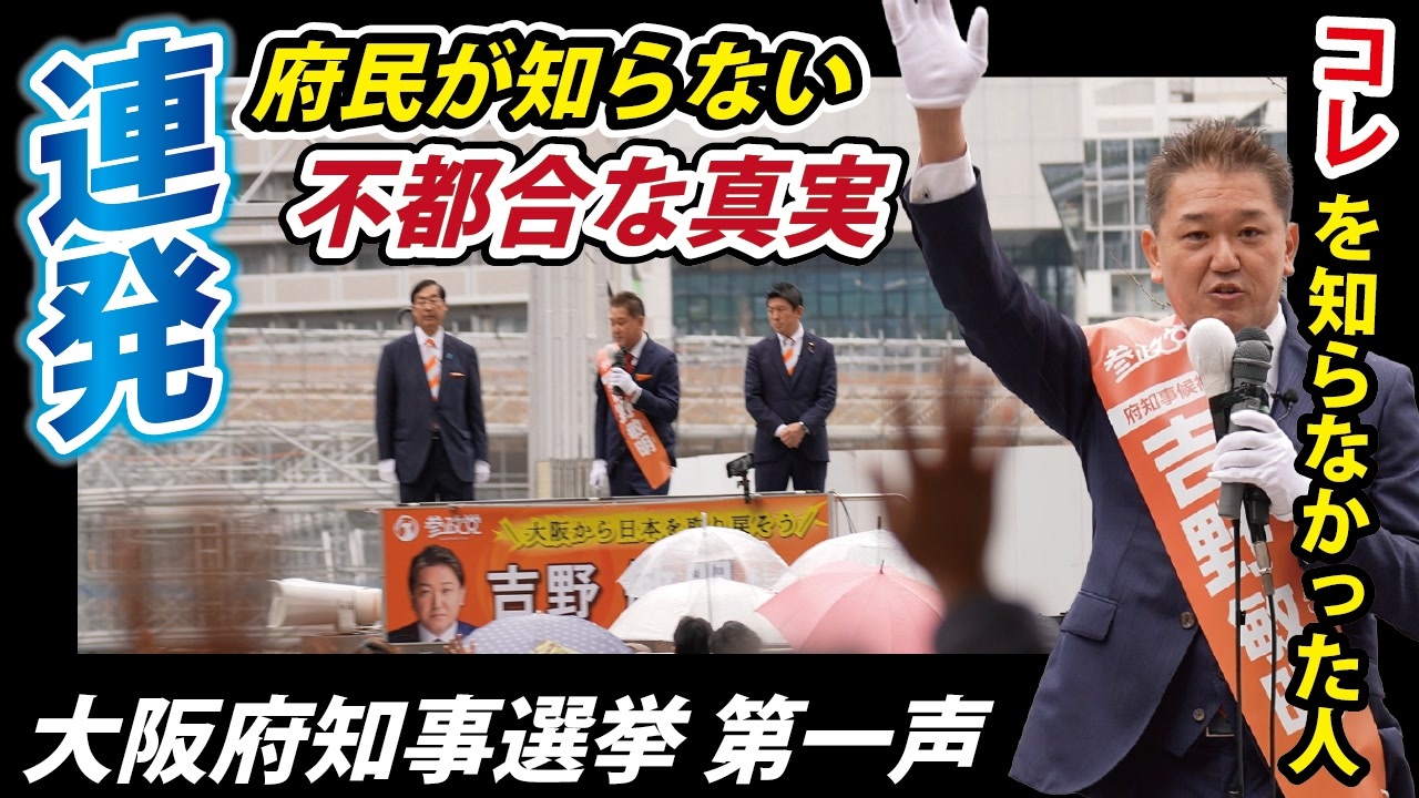 令和5年3月23日 午前10時<br>吉野敏明大阪府知事候補第一声 (参政党公認候補)<br><br>この街頭演説の動画は、投稿者が現地で撮影したものを編集し公開しています。<br><br>―――――――――――――――――――――――――――――――<br><br>❑4月10日発売予定「世界を欺いた〇〇〇〇〇〇〇」(宝島社新書)<br><a href="https://amzn.to/3ymDfgr" target="_blank" rel="noopener nofollow">https://amzn.to/3ymDfgr</a><br>鳥集徹(著) 闇のダディ(著) 藤江成光(著)←私<br><br>―――――――――――――――――――――――――――――――<br><br>❑新しい動画サイト「真の日本人増加計画」始めました!<br><a href="https://nicochannel.jp/fujie/" target="_blank" rel="noopener nofollow">https://nicochannel.jp/fujie/</a><br>(ニコニコチャンネル+)<br><br><br>❏藤江の活動を支援していただける方向け<br>【藤江支援口座】のご案内<br>住信SBIネット銀行 ミカン支店(店番号103)<br>口座番号 3107694<br>口座名義 フジエ マサミツ<br><br>――――――――――――――――――――――――――――――<br><br>日本の人口増加を目指す男、藤江です!【メインチャンネル】<br><a href="https://www.youtube.com/c/JINKOUZOUKA/" target="_blank" rel="noopener nofollow">https://www.youtube.com/c/JINKOUZOUKA/</a><br><br>地域と日本の存続のためニ!【藤江2ndチャンネル】<br><a href="https://www.youtube.com/channel/UCfBh4rv5UT7D-qR6KsoZrsA" target="_blank" rel="noopener nofollow">https://www.youtube.com/channel/UCfBh4rv5UT7D-qR6KsoZrsA</a><br><br>今こそ!三千年の底力【藤江3rdチャンネル】<br><a href="https://www.youtube.com/channel/UC5Yrsm8-X8nZj4uKgvE7CBw" target="_blank" rel="noopener nofollow">https://www.youtube.com/channel/UC5Yrsm8-X8nZj4uKgvE7CBw</a><br><br>四海兄弟【藤江4thチャンネル】<br><a href="https://www.youtube.com/channel/UCiyJNO57quj80Ysy7nOABvA" target="_blank" rel="noopener nofollow">https://www.youtube.com/channel/UCiyJNO57quj80Ysy7nOABvA</a><br><br>五穀豊穣【藤江5thチャンネル】<br><a href="https://www.youtube.com/channel/UCptMJCoKYghfew5tDzoEqHQ" target="_blank" rel="noopener nofollow">https://www.youtube.com/channel/UCptMJCoKYghfew5tDzoEqHQ</a><br><br>六根清浄【藤江6thチャンネル】<br><a href="https://www.youtube.com/@FUJIE6th" target="_blank" rel="noopener nofollow">https://www.youtube.com/@FUJIE6th</a><br><br>藤江のTwitter<br><a href="https://twitter.com/JINKOUZOUKA_jp" target="_blank" rel="noopener nofollow">https://twitter.com/JINKOUZOUKA_jp</a><br><br>藤江のニコニコ動画<br><a href="https://www.nicovideo.jp/user/5457748" target="_blank" rel="noopener nofollow">https://www.nicovideo.jp/user/5457748</a>