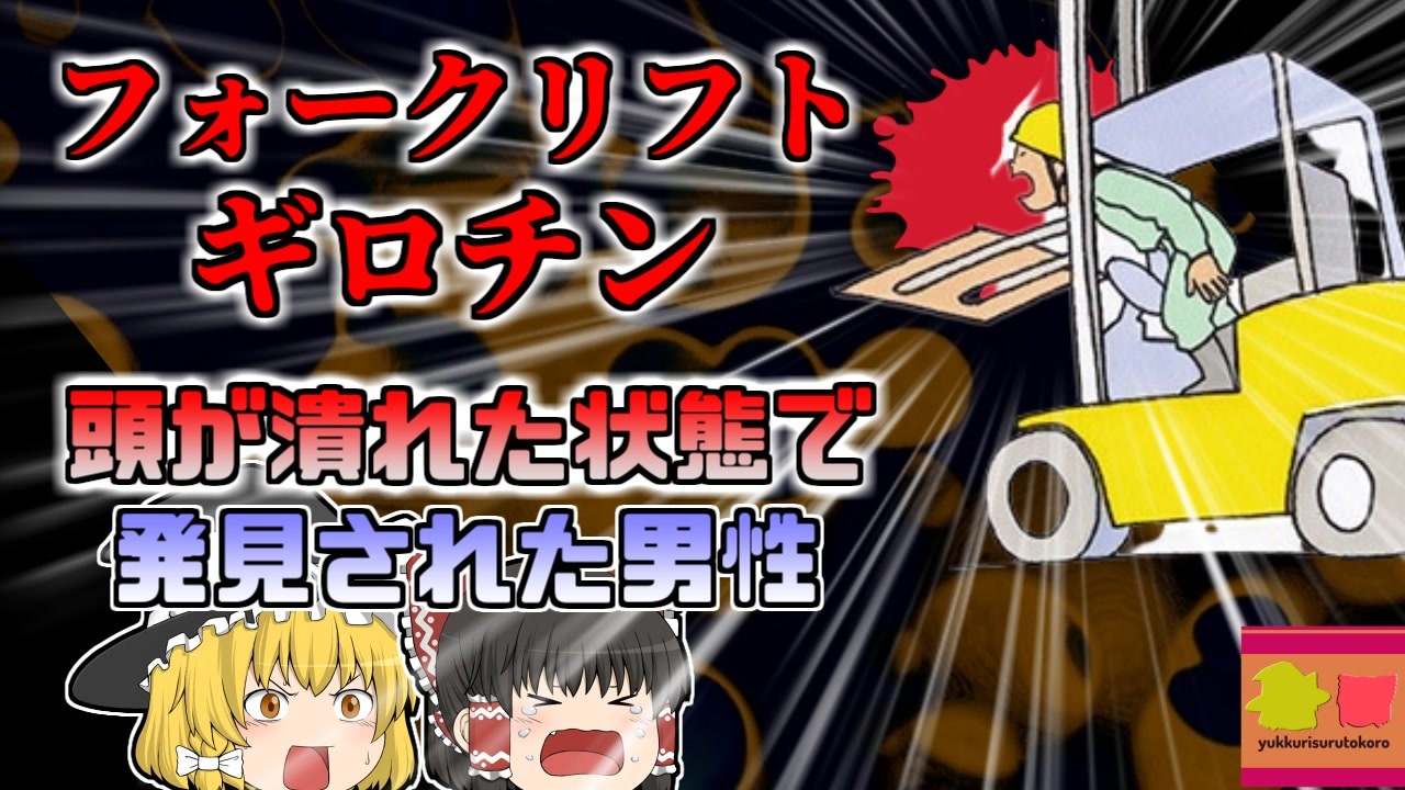 <br><a href="#" class="seekTime" data-seekTime="00:00" onclick="seekNicoPlayer('#00:00'); return false;">#00:00</a> 冒頭挨拶<br><a href="#" class="seekTime" data-seekTime="00:45" onclick="seekNicoPlayer('#00:45'); return false;">#00:45</a> 視聴上の注意<br><a href="#" class="seekTime" data-seekTime="1:32" onclick="seekNicoPlayer('#1:32'); return false;">#1:32</a> 本編開始<br><a href="#" class="seekTime" data-seekTime="2:28" onclick="seekNicoPlayer('#2:28'); return false;">#2:28</a> フォークリフトの荷役作業<br><a href="#" class="seekTime" data-seekTime="3:06" onclick="seekNicoPlayer('#3:06'); return false;">#3:06</a> エンジンがかけっぱなしのフォークリフト<br><a href="#" class="seekTime" data-seekTime="5:03" onclick="seekNicoPlayer('#5:03'); return false;">#5:03</a> 原因と背景<br><a href="#" class="seekTime" data-seekTime="6:02" onclick="seekNicoPlayer('#6:02'); return false;">#6:02</a> 荷下ろしの際に省略してしまった行動<br><a href="#" class="seekTime" data-seekTime="8:53" onclick="seekNicoPlayer('#8:53'); return false;">#8:53</a> 手順書もなかった<br><a href="#" class="seekTime" data-seekTime="9:21" onclick="seekNicoPlayer('#9:21'); return false;">#9:21</a> 必要だった対策<br><br><br>今回紹介するのは、以前からリクエストがありました、フォークリフトに関する事例です。<br>茨城県某所の建築資材工場ではこの日、作業員男性「Aさん」「Bさん」によって、トラックへの積み込み作業が行われていました。<br>この作業は、Bさんが発注リスト、在庫管理を行い、Aさんがそれをフォークリフトを使って、大型トラックの荷台に積み込むといった内容でした。<br>しかし、この日の夕方、Bさんがトラックの方へ移動した際、トラックの荷台近くで、フォークリフトのマストに頭を挟まれ、意識を失っているAさんを発見。<br>すぐに救急に通報され、彼は市内の病院へと搬送されましたが、脳挫傷によって、この世を去ってしまいました。<br><br>Bさんが少し目を離した間に、Aさんの身に一体何があったのでしょうか?<br><br>引用・出展・参考文献<br>パーソナルファクトリーパートナーズ フォークリフトの免許取得<br><a href="https://ishort.ink/1XfG" target="_blank" rel="noopener nofollow">https://ishort.ink/1XfG</a><br>PCS㈱ フォークリフトの各部名称を知っておきましょう!<br><a href="https://ishort.ink/tMTB" target="_blank" rel="noopener nofollow">https://ishort.ink/tMTB</a><br>フォークリフトタイヤの構造はどうなってるの? ㈱フクナガタイヤ<br><a href="https://ishort.ink/ph4u" target="_blank" rel="noopener nofollow">https://ishort.ink/ph4u</a><br>厚生労働省 職場のあんぜんサイト<br><a href="https://ishort.ink/fLdd" target="_blank" rel="noopener nofollow">https://ishort.ink/fLdd</a><br><a href="https://ishort.ink/GQnH" target="_blank" rel="noopener nofollow">https://ishort.ink/GQnH</a><br>コマツ教習所 フォークリフト運転技能講習<br><a href="https://ishort.ink/jHia" target="_blank" rel="noopener nofollow">https://ishort.ink/jHia</a><br>IT用語辞典 e-Words インターロック<br><a href="https://ishort.ink/593G" target="_blank" rel="noopener nofollow">https://ishort.ink/593G</a><br><br><br><br />※この動画は過去の事件を知り、現在でも同じことが発生する危険性を再認識、関与しないように促すための動画であり、視聴者を扇動、動揺を誘うためのコンテンツではありません。<br><br>ご要望にお応えして、メンバーシップの開設を行いました。<br>下記URLからも登録可能ですので、ご興味がある方は是非ご参加ください。<br><a href="https://www.youtube.com/channel/UCcT5a1J7XJW7CLYI2RKl4pw/join" target="_blank" rel="noopener nofollow">https://www.youtube.com/channel/UCcT5a1J7XJW7CLYI2RKl4pw/join</a><br><br><br>Twitter<br>→<a href="https://twitter.com/yukkurisurutoko" target="_blank" rel="noopener nofollow">https://twitter.com/yukkurisurutoko</a><br><br>取り急ぎ、簡易的にですがマイリストを作りました。<br>【ゆっくり解説】事故・事件関係紹介リスト <br><a href="https://www.nicovideo.jp/mylist/71034319" target="_blank" rel="noopener nofollow">https://www.nicovideo.jp/mylist/71034319</a><br>【ゆっくり解説】放射線系事故<br><a href="https://www.nicovideo.jp/mylist/71034368" target="_blank" rel="noopener nofollow">https://www.nicovideo.jp/mylist/71034368</a><br>【ゆっくり解説】鉄道系事故・事件関連<br><a href="https://www.nicovideo.jp/mylist/71034379" target="_blank" rel="noopener nofollow">https://www.nicovideo.jp/mylist/71034379</a>