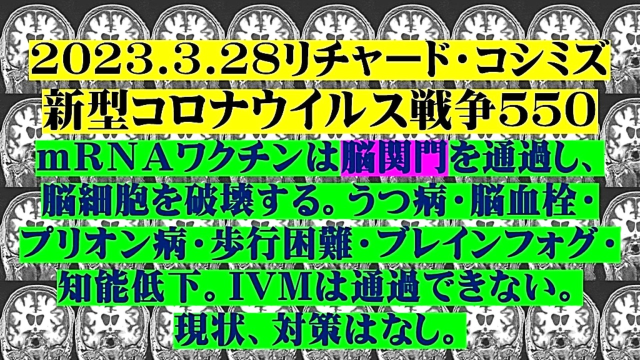 <span style="color: #cc4125;"><strong>「 テーマ : 新型コロナウイルス戦争 550 」</strong></span><br><br><span style="color: #ff0000;"><strong>「『 mRNAワクチン 』は『 脳関門 』を『 通過 』し、『 脳細胞 』を『 破壊 』する。『 うつ病・脳血栓<br> ・プリオン病・歩行困難・ブレインフォグ・知能低下 』。『 イベルメクチン 』は、『 通過 』できない。<br> 現状、『 対策 』はなし 」</strong></span><br><br><span style="color: #0000ff;"><strong>「『 イベルメクチン・アビガン・その他コロナ対策 』について、ご意見をお寄せ下さい! 」<br><br>◐ E-mail:richardkoshimizu@gmail.com</strong></span><br><br><strong>◐「クリエイター・サポート」・「ニコニ広告」・「フォロー」等、ご協力の程宜しくお願い致します。RK</strong><br><br><span style="color: #38761d;"><strong>◐ リチャード・コシミズ 講演会 公式 動画ギャラリー</strong></span><br> <a href="http://www.t-sskk.com/richardkoshimizu/video-gallery/index.html" target="_blank" rel="noopener nofollow">http://www.t-sskk.com/richardkoshimizu/video-gallery/index.html</a><br><br><span style="color: #38761d;"><strong>◐ リチャード・コシミズ 講演会 「 ニコニコ生放送『 LIVE 』」</strong></span><br> <a href="https://bit.ly/3Bx8F5w" target="_blank" rel="noopener nofollow">https://bit.ly/3Bx8F5w</a><br><br><span style="color: #38761d;"><strong>◐ リチャード・コシミズ 公式 ブログ</strong></span><br> <a href="http://08054623210.jugem.jp/" target="_blank" rel="noopener nofollow">http://08054623210.jugem.jp/</a><br><br><span style="color: #38761d;"><strong>◐ リチャード・コシミズ 公式 ホームページ<br> </strong></span><a href="http://richardkoshimizu.boo.jp/" target="_blank" rel="noopener nofollow">http://richardkoshimizu.boo.jp/</a><br><br><span style="color: #38761d;"><strong>◐ リチャード・コシミズ 公式 Twitter</strong></span><br> <a href="https://twitter.com/rickoshimizu" target="_blank" rel="noopener nofollow">https://twitter.com/rickoshimizu</a><br>