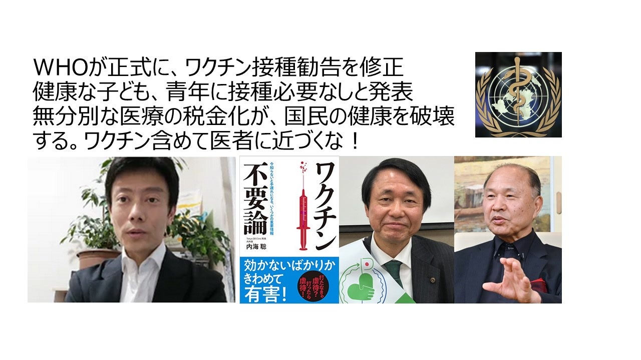 ロイター記事<br><a href="https://jp.reuters.com/article/health-coronavirus-who-idJPKBN2VU1GQ" target="_blank" rel="noopener nofollow">https://jp.reuters.com/article/health-coronavirus-who-idJPKBN2VU1GQ</a><br><br>WHOの公式説明によると、あの杖と巻き付いたヘビは、ずっと昔から医学と医療職の象徴<br>この杖をもっていたのは、ギリシャ神話に登場するアスクレピオス。「治療の神」として、古代ギリシャ人に崇拝されていた。治療の神様と同様、ヘビが巻き付いた杖も信仰の対象となった。なぜアスクレピオスが持っていた杖にはヘビが巻かれているのか同サイトは説明していない。<br>薬にも毒にもなる蛇<br><a href="https://news.yahoo.co.jp/byline/saorii/20200527-00180477" target="_blank" rel="noopener nofollow">https://news.yahoo.co.jp/byline/saorii/20200527-00180477</a><br><br>谷本誠一議員の当該内容の演説動画<br><a href="https://www.youtube.com/watch?v=7bMp50_rbX4&t=628s" target="_blank" rel="noopener nofollow">https://www.youtube.com/watch?v=7bMp50_rbX4&t=628s</a><br><br>谷本誠一議員の記載内容(一部)<br><a href="https://www.facebook.com/tanimoto.seiichi" target="_blank" rel="noopener nofollow">https://www.facebook.com/tanimoto.seiichi</a><br>対象を入院は小学生まで、通院は中学生にまで拡大、通院、入院共に高校生まで助成を拡大<br>現在全国で、こどもの入通院助成を高校生までへの拡大ラッシュが続いており、この政策を掲げて首長が当選するという人気取りのバラマキ福祉の最たるもの。<br> 一方、医療費が安くなると、単なる風邪症状でも病院に駆け込むようになります。これは「コンビニ診療」と揶揄されています。それにより抗生物質が注射され、薬剤処方をされます。<br> 実は、熱や鼻水や咳が出る症状というは、自らの免疫力が作用し、毒素を体外に排出している現象なのです。これを薬剤で無理矢理抑制するのは、症状は治まったとしても、治癒しているのではないのです。これを継続すれば、免疫力の弱い体質になり、風邪も引き易くなります。将来は介護保険に頼らざるを得ないことになりかねません。<br> 戦前までは、安静にさえしていれば自然治癒したり、薬草を煎じたり塗ったりしていた。が敗戦後は、西洋医学という対症療法が急激に広まり、医療利権、石油利権が闊歩した来たことを知らねばなりません。これらに邪魔になる治療法や東洋医学は否定されて来たのです。<br> そうではなく、無農薬や無添加等、自然食の摂取を中心とした食育改善を促進することが最も肝要です。<br>今回のこども医療費助成拡大予算については、私を除き全議員が諸手を挙げて賛成しました。私は、定例議会最終日の3月23日には、堂々と反対討論を行った。<br><br>日本国独立宣言論 私は独立を宣言する! 真田信秋<br><a href="https://amzn.to/3D90lwx" target="_blank" rel="noopener nofollow">https://amzn.to/3D90lwx</a>