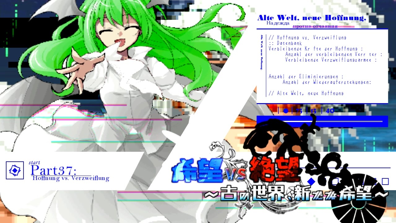 <span style="font-size: 18px;"><strong>流れを断ち切る</strong></span><br><br><span style="color: #ff0000;"><strong>キャラ更新をpart40投稿時点で締め切ります</strong></span><br><br><br>BGMのリクエストは戦績表とかおまけの時にでも書いといてくれると助かります<br><br>ブログにて希望軍がどの大会から持ってきたかをメモしておきました。気になる方はどうぞ<br><span style="font-size: 10px;">BGM音量とか久々にやったので大きいとかあったら言ってください。</span><br><br><br>---------------------------------------------------------------------------------------------------------------------<br>希望軍対象大会OPまとめ【<a href="https://www.nicovideo.jp/mylist/74106383" target="_blank" rel="noopener">mylist/74106383</a>】<br>絶望軍対象大会OPまとめ【<a href="https://www.nicovideo.jp/mylist/74259169" target="_blank" rel="noopener">mylist/74259169</a>】<br>大会マイリスト【<a href="https://www.nicovideo.jp/mylist/74275695" target="_blank" rel="noopener">mylist/74275695</a>】<br>大会ルール【 <a href="https://yukkuri-fie.hatenablog.com/entry/2022/12/20/005122" target="_blank" rel="noopener nofollow">https://yukkuri-fie.hatenablog.com/entry/2022/12/20/005122</a> 】<br>希望軍まとめ【 <a href="https://yukkuri-fie.hatenablog.com/entry/2022/11/23/213455" target="_blank" rel="noopener nofollow">https://yukkuri-fie.hatenablog.com/entry/2022/11/23/213455</a> 】<br>絶望軍まとめ【 <a href="https://yukkuri-fie.hatenablog.com/entry/2023/01/03/201554" target="_blank" rel="noopener nofollow">https://yukkuri-fie.hatenablog.com/entry/2023/01/03/201554</a> 】<br><br>OP : <a href="https://www.nicovideo.jp/watch/sm41581724" class="watch">sm41581724</a><br>前 : <a href="https://www.nicovideo.jp/watch/sm41992229" class="watch">sm41992229</a><br>次 : <a href="https://www.nicovideo.jp/watch/sm42007274" class="watch">sm42007274</a>