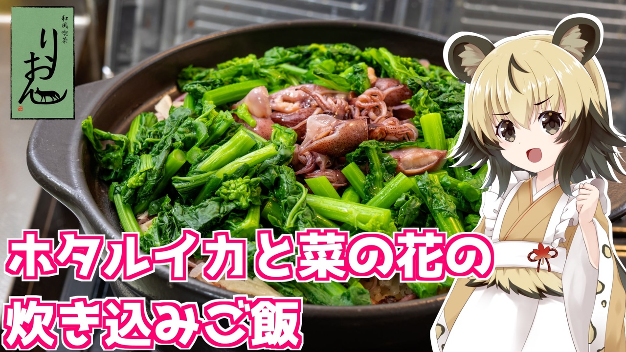 今回は、「ホタルイカと菜の花の炊き込みご飯」を作っていきましょう。<br><br>春が旬のホタルイカ!<br>普段はボイルのものを酢味噌和えで頂いたりするのですが、<br>ご飯ものとして主役の一品にしていきましょう。<br><br>ホタルイカの下処理、目、口、筋と取ってますが、<br>面倒な場合でも目と口は取ることをおすすめします^^<br><br>■材料<br>・米 2合<br>・ホタルイカ(ボイル) お好みの量<br>・菜の花 お好みの量<br>・しょうが 1かけら<br>・醤油 大さじ2<br>・みりん 大さじ1.5<br>・料理酒 大さじ1<br>・入り胡麻 お好みで<br><br>■所要時間<br>作業時間:70分以内(米の浸漬30分含む)<br><br>youtube:<a href="https://youtu.be/ZkiaOPFmBvc" target="_blank" rel="noopener nofollow">https://youtu.be/ZkiaOPFmBvc</a><br>twitter:@lycaon_kitchen<br><br>りおんの和風喫茶:<a href="https://www.nicovideo.jp/series/77190" target="_blank" rel="noopener">series/77190</a><br>おつかれごはん:<a href="https://www.nicovideo.jp/series/155690" target="_blank" rel="noopener">series/155690</a><br>手作り和菓子でちょっとひとやすみしませんか?:<a href="https://www.nicovideo.jp/series/155691" target="_blank" rel="noopener">series/155691</a><br><br>立ち絵:星華 彩二魔 様<br>イラスト:いらすとや、AWD kitchen<br>音源:DOVA-SYNDROME<br>音声:AI.VOICE 紲星あかり+ exVOICE