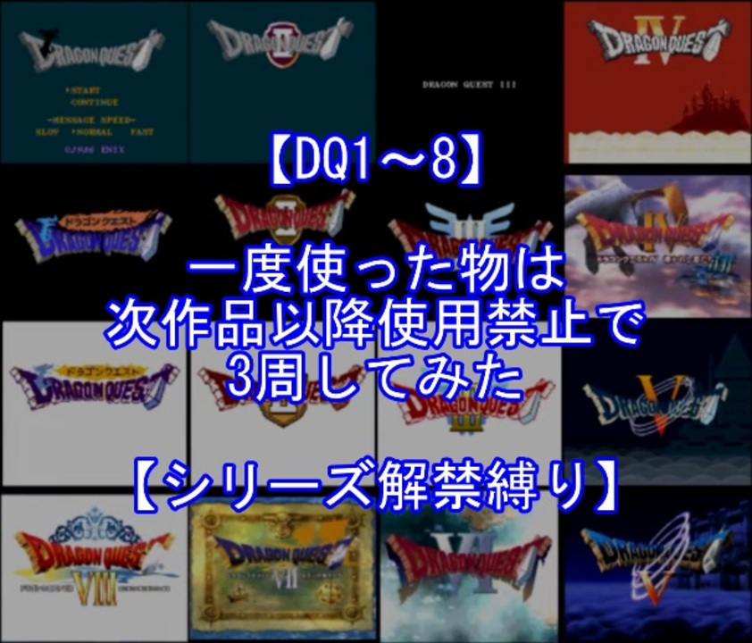 全ての始まりは、シリーズ解禁縛りに魅力を感じた視聴者の些細な呟きでした。<br><br>『Ⅲ以外詳しくないからⅢを2周して、2周目は1周目で使った物を禁止とか面白そう』<br>「2周……その手があったか!」<br><br>2021年8月中旬 2周のための計画を開始。<br>2021年11月上旬 ルール次第で3周いけそうと判断し計画を変更。<br>2022年6月上旬 分配が8割方完成し見直しに入る。<br>2022年7月上旬~ 微調整も終わり、少しずつ収録を開始。<br><br>前回は誰でも気軽できることを意識した縛りプレイでした。<br>今回は自分にしかできないことが目標の縛りプレイです。<br><br>次→<a href="https://www.nicovideo.jp/watch/sm43708158" class="watch">sm43708158</a><br>YouTube版→<a href="https://youtu.be/ZhaTT12Tn-A" target="_blank" rel="noopener nofollow">https://youtu.be/ZhaTT12Tn-A</a><br><br>前作→<a href="https://www.nicovideo.jp/watch/sm39564965" class="watch">sm39564965</a><br><br>縛りルール<br>①使った武器・防具・装飾品・道具・呪文・特技は次作品以降使用禁止。<br> 職業(3,6,7)・仲間モンスター(5,6)はナンバリングで分類し、次作品以降使用禁止。<br>(5,6の複数体加入できるモンスターは一体まで)<br><br>②裏技、バグ技、全滅、逃走、おどかす禁止。<br><br>③ダンジョンとボス攻略は、全キャラのレベルを突入時、<br> 1周目は目標レベル+5。2周目は+10。3周目は+15まで。<br> ラスボスの目標レベルは45。裏ボスは50とする。<br>(目標レベルは各公式ガイドブックを参照)<br><br>④1周目はEDまで。2周目は裏ボス撃破まで。<br> 3周目は全てのボスを規定回数、規定ターン以内に倒す。<br>(回避可能なボスも倒す)<br><br>・プレイする機種(予定)<br>Ⅰ FC→SFC→GBC<br>Ⅱ FC→SFC→GBC<br>Ⅲ FC→SFC→GBC<br>Ⅳ FC→PS→PS<br>Ⅴ SFC→PS2→未定<br>Ⅵ SFC→SFC→SFC<br>Ⅶ PS→PS→PS<br>Ⅷ PS2→PS2→PS2<br><br>※一部機種は互換機を使用してのプレイとなりますが、倍速機能やクイックセーブ、ロード、チートなどは一切使用しません。<br><br><br>この動画で利用している株式会社スクウェア・エニックスを代表とする共同著作者が権利を所有する著作物及びスギヤマ工房有限会社が権利を所有する楽曲の転載・配布は禁止いたします。<br>(C) ARMOR PROJECT/BIRD STUDIO/SQUARE ENIX All Rights Reserved.<br>(C) SUGIYAMA KOBO (P) SUGIYAMA KOBO<br><br>AquesTalk2ライセンスID:AQTK2WINUSR23122185<br /><br><br>❤いいねを押していただけるとモチベーションと投稿速度が上がるので宜しくお願い致します!<br><br>作者ツイッター→ <a href="https://twitter.com/nig0117" target="_blank" rel="noopener nofollow">https://twitter.com/nig0117</a><br>PIXIV FANBOX→ <a href="https://sutanokeiji.fanbox.cc/" target="_blank" rel="noopener nofollow">https://sutanokeiji.fanbox.cc/</a><br><br>( 以前はWEB小説書いてました→ <a href="https://kakuyomu.jp/works/1177354054884910267" target="_blank" rel="noopener nofollow">https://kakuyomu.jp/works/1177354054884910267</a> )